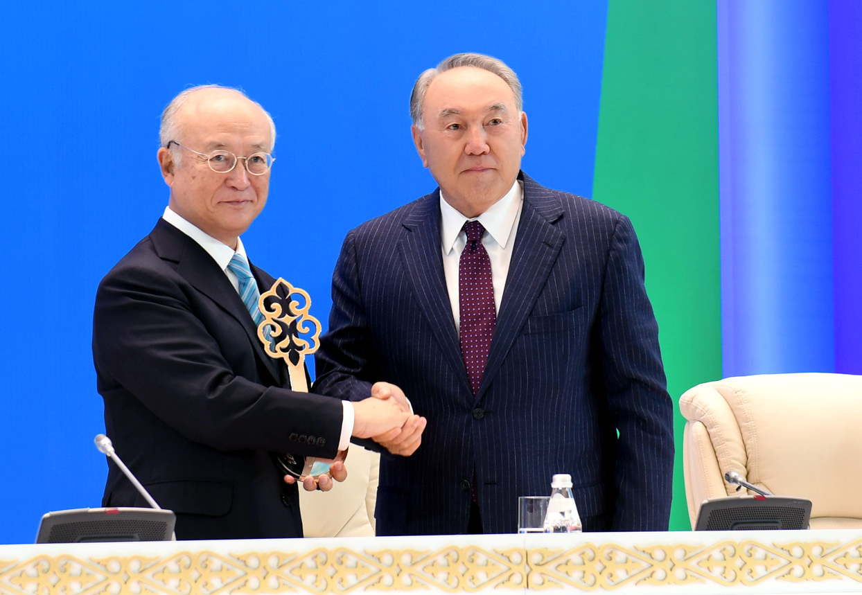 During the ceremony, the President of Kazakhstan handed over to the IAEA Director General Yukiya Amano the symbolic keys from the Bank of Low-Enriched Uranium placed on the site of the Ulba Metallurgical Plant.