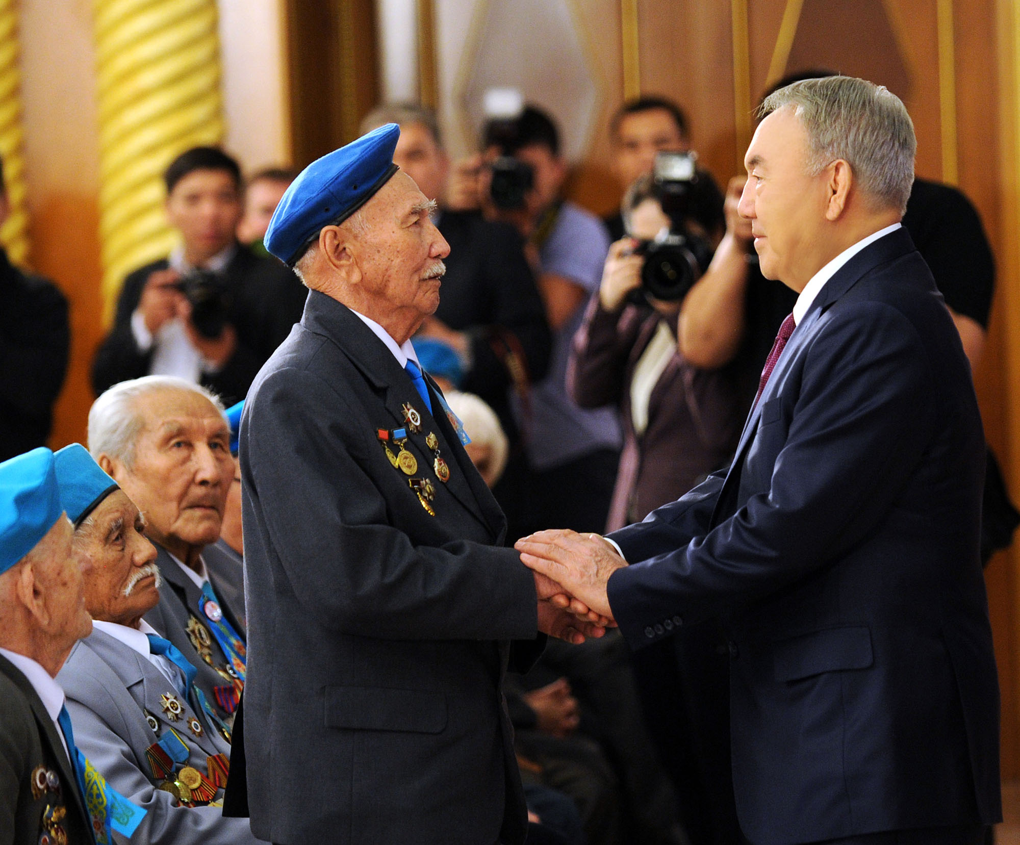 – Бүгін оған елдің бостандығы мен бейбіт өмірін қорғап қалған ардагерлер қатысып отыр. Біз сіздерге «Барыс» және «Құрмет» ордендерін тапсырамыз. Бұл – бүгінгі ұрпақ сіздерге ұсына алатын сый-құрметтің титтей бір бөлшегі ғана. Бүкіл ел, бүкіл әлем фашизмнен қорғап қалғандарыңыз үшін сіздерге борыштар. Ардагерлерді марапаттау үзілмес ұрпақ сабақтастығын айғақтайды. Сіздердің майдан даласы мен бейбіт өмірдегі ерліктеріңіз әрдайым батырлық пен патриотизм үлгісі болып қала бермек. Ұлы Жеңіске қол жеткізгендердің барлығы үшін ең үздік марапат – тәуелсіз Қазақстан, өркендеу үстіндегі еліміз, азаматтарымыздың бақуат өмірі. Бұл сіздердің ерліктеріңіздің бекер кетпегенін дәлелдейді. Бүгінде сіздердің істеріңізді қазақстандықтардың жаңа ұрпағы табысты жалғастыруда. Ел олардың да еңбегін бағалайды, – деді Нұрсұлтан Назарбаев.