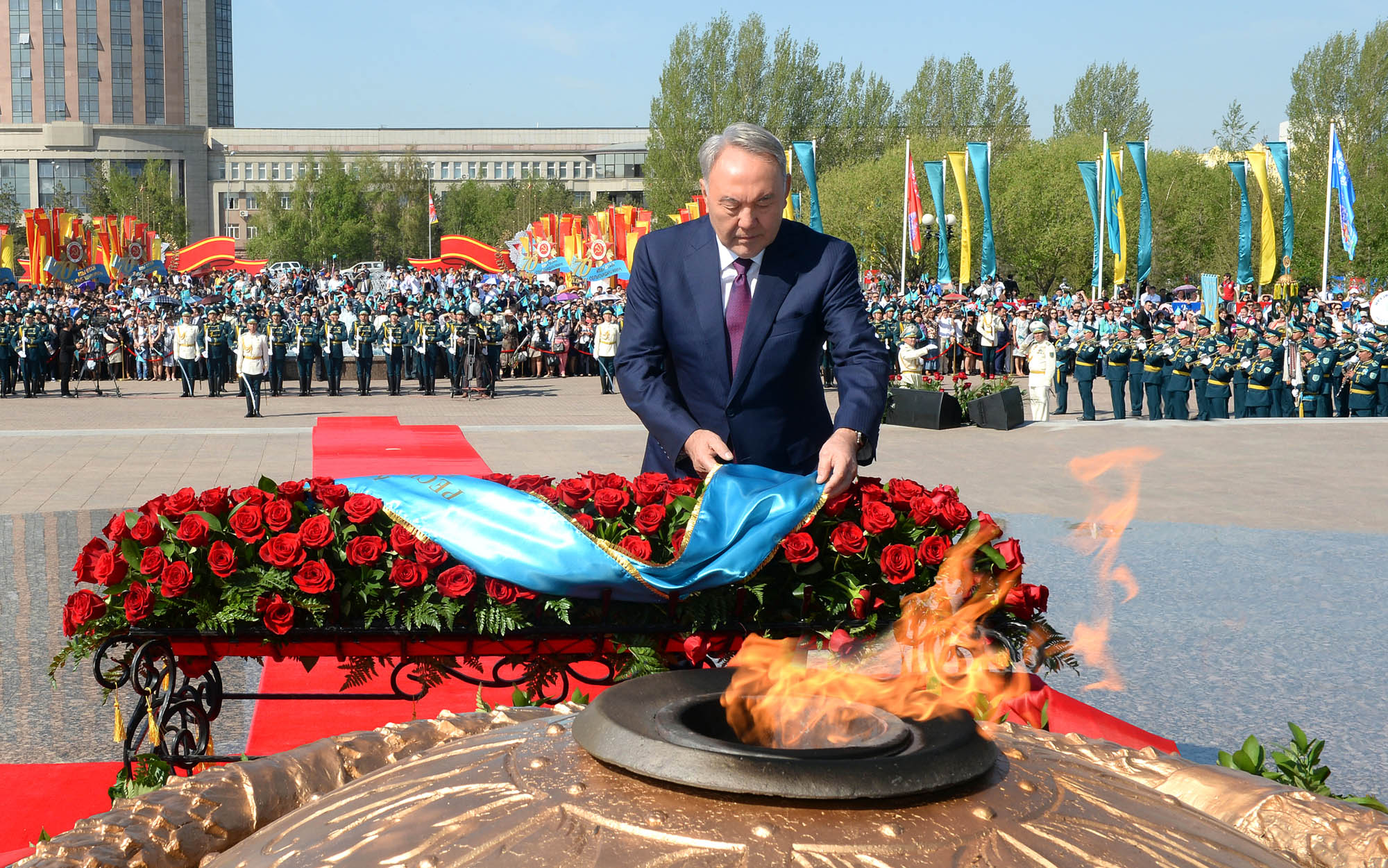 Он мыңға жуық адам қатысқан рәсім барысында Ұлы Отан соғысы кезінде ұрыс даласында қаза тапқан сарбаздарды бір минуттық үнсіздікпен еске алу шарасы өтті.