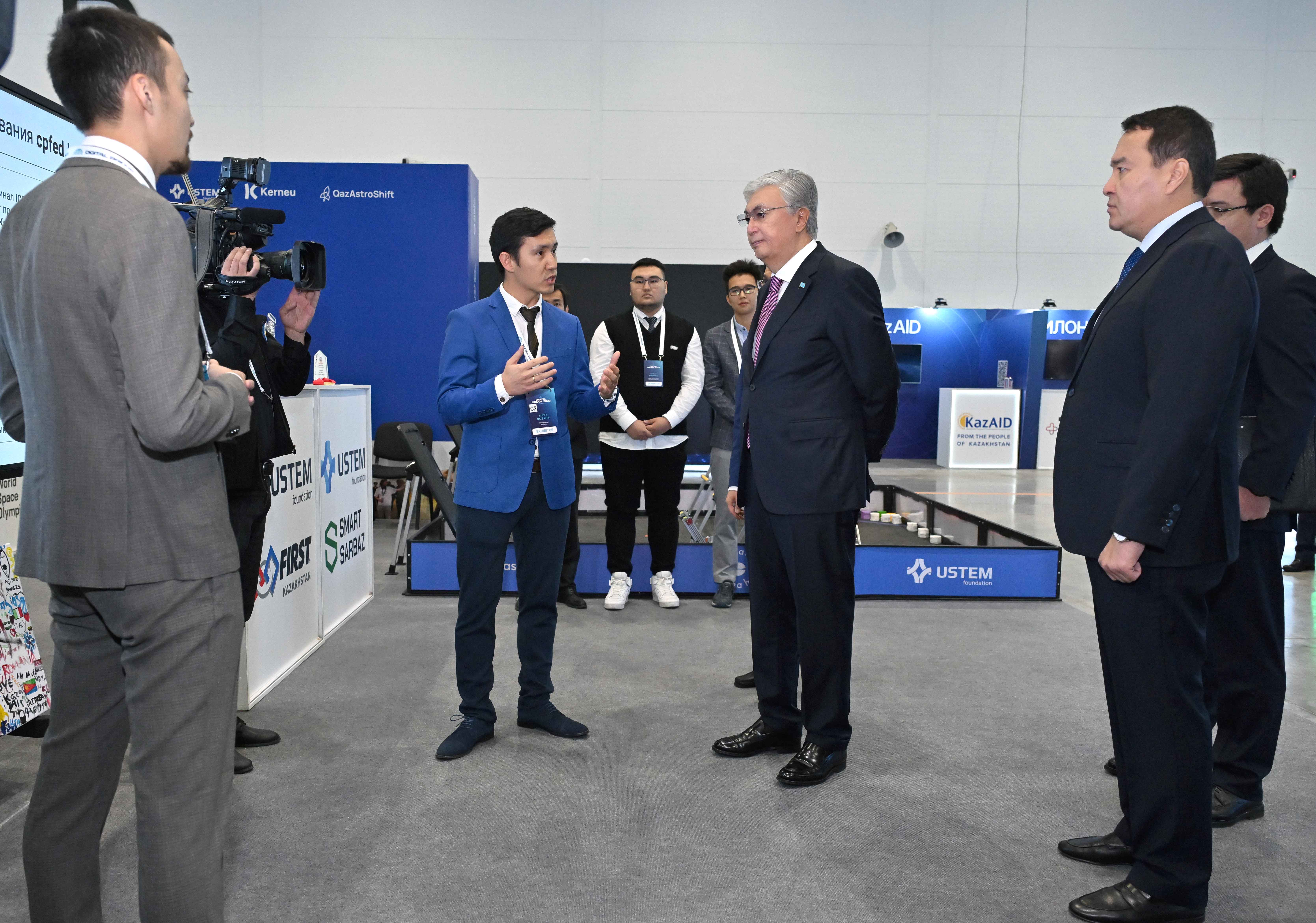 Роботты техника аймағында Мемлекет басшысы көптеген жарыстарда жеңімпаз атанған роботты техникадан Қазақстан құрамасының мүшелерімен әңгімелесті және Ustem Foundation, Alem School, MakerSpace жобаларымен танысты