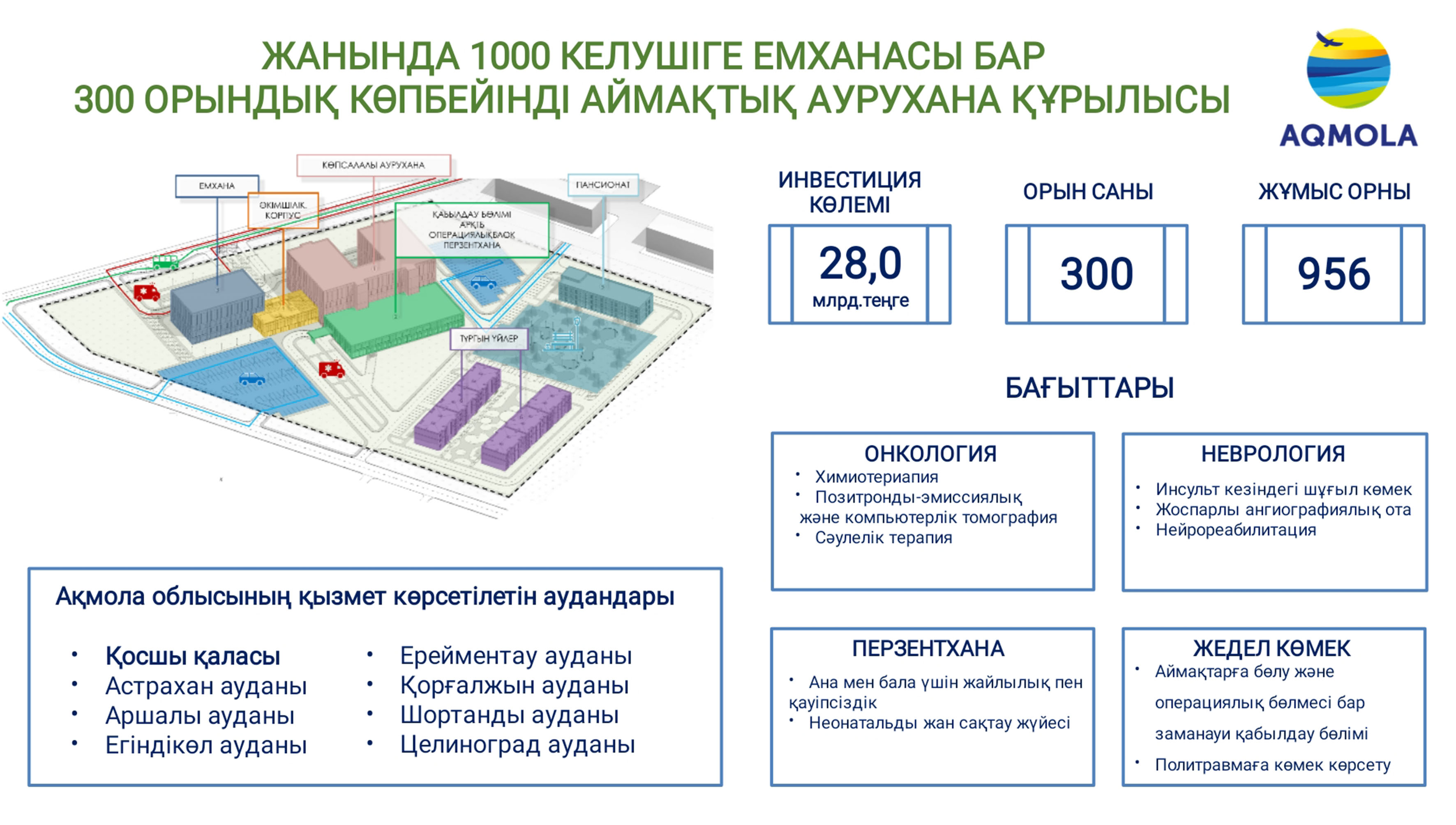 Қала әкімі қазіргі кезде жекеменшік инвестиция есебінен жанында 1000 келушіні қабылдайтын емханасы бар 300 орындық көпбейінді аймақтық аурухана салынып жатқанын жеткізді. Жаңа ауруханада терапия, онкология, неврология және перзентахана бөлімшелері болады. Медициналық мекеме тек Қосшы халқына ғана емес, жақын маңдағы аудандардың тұрғындарына да қызмет көрсетеді деп жоспарланып отыр.