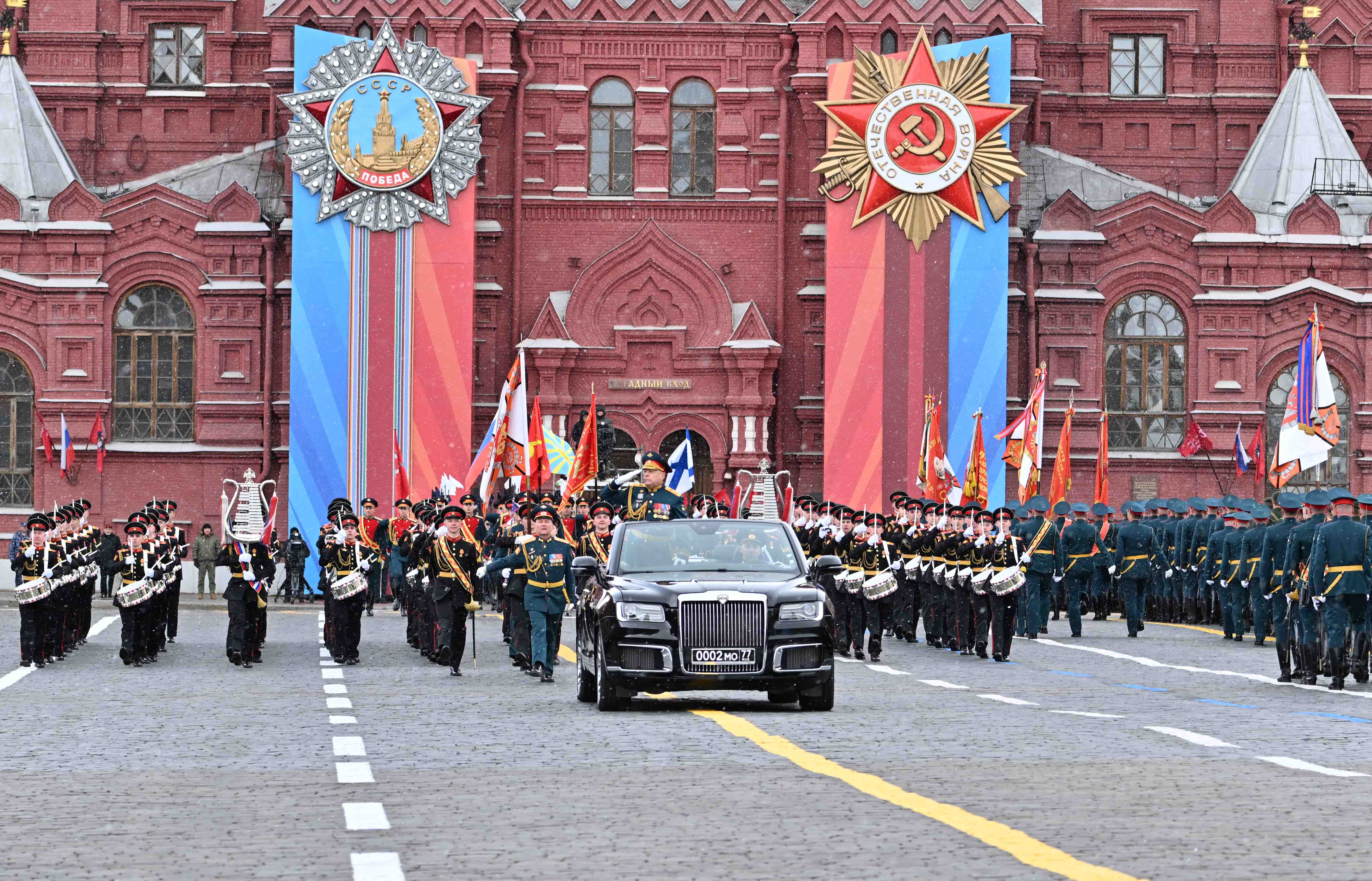 Парадты Қасым-Жомарт Тоқаевпен және Ресей Президенті Владимир Путинмен қатар Беларусь Президенті Александр Лукашенко, Қырғызстан Президенті Садыр Жапаров, Тәжікстан Президенті Эмомали Рахмон, Түрікменстан Президенті Сердар Бердімұхамедов, Өзбекстан Президенті Шавкат Мирзиёев, Куба Президенті Мигель Марио Диас-Канель Бермудес, Лаос Президенті Тхонглун Сисулит, Гвинея-Бисау Президенті Умару Сисоку Эмбало тамашалады.