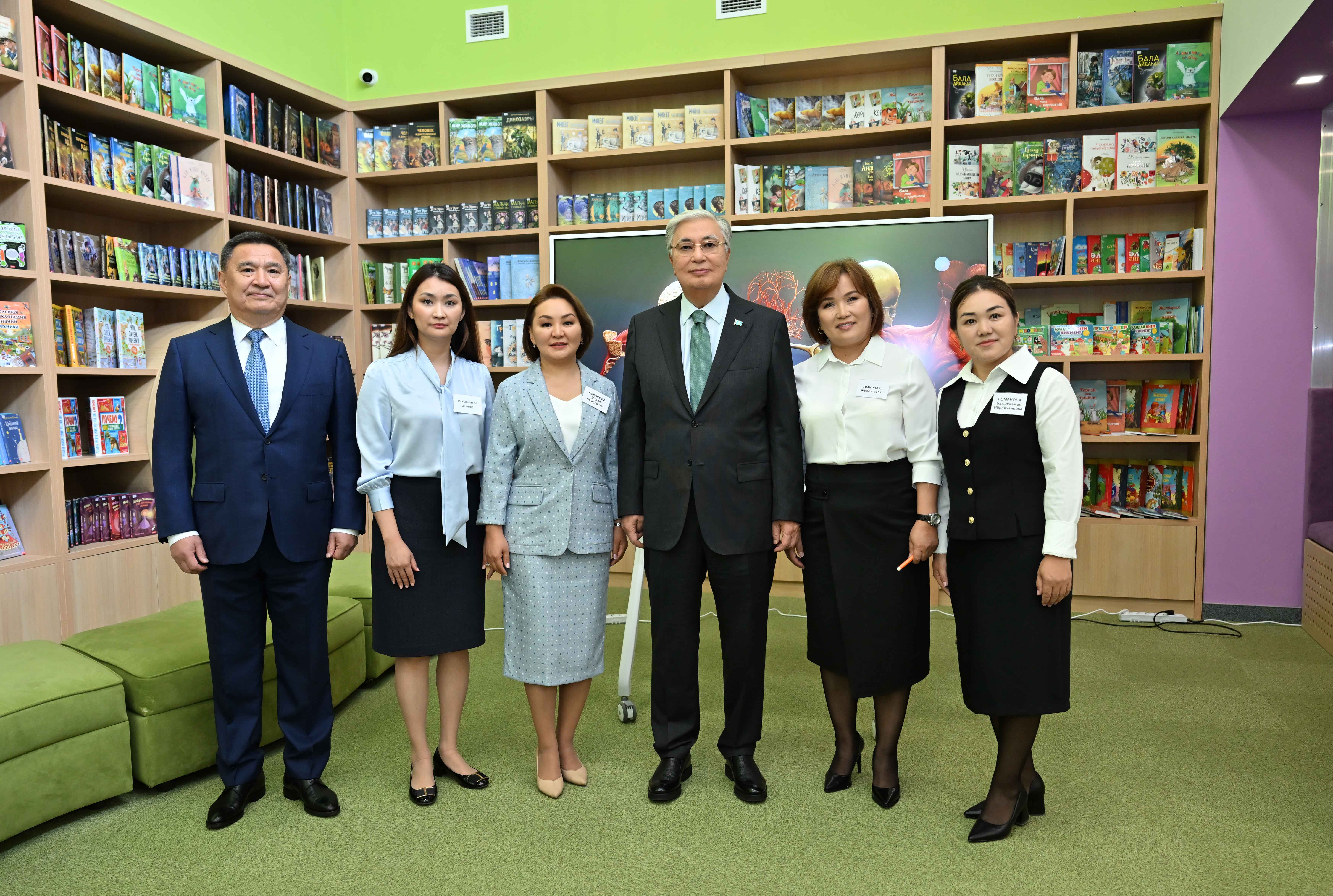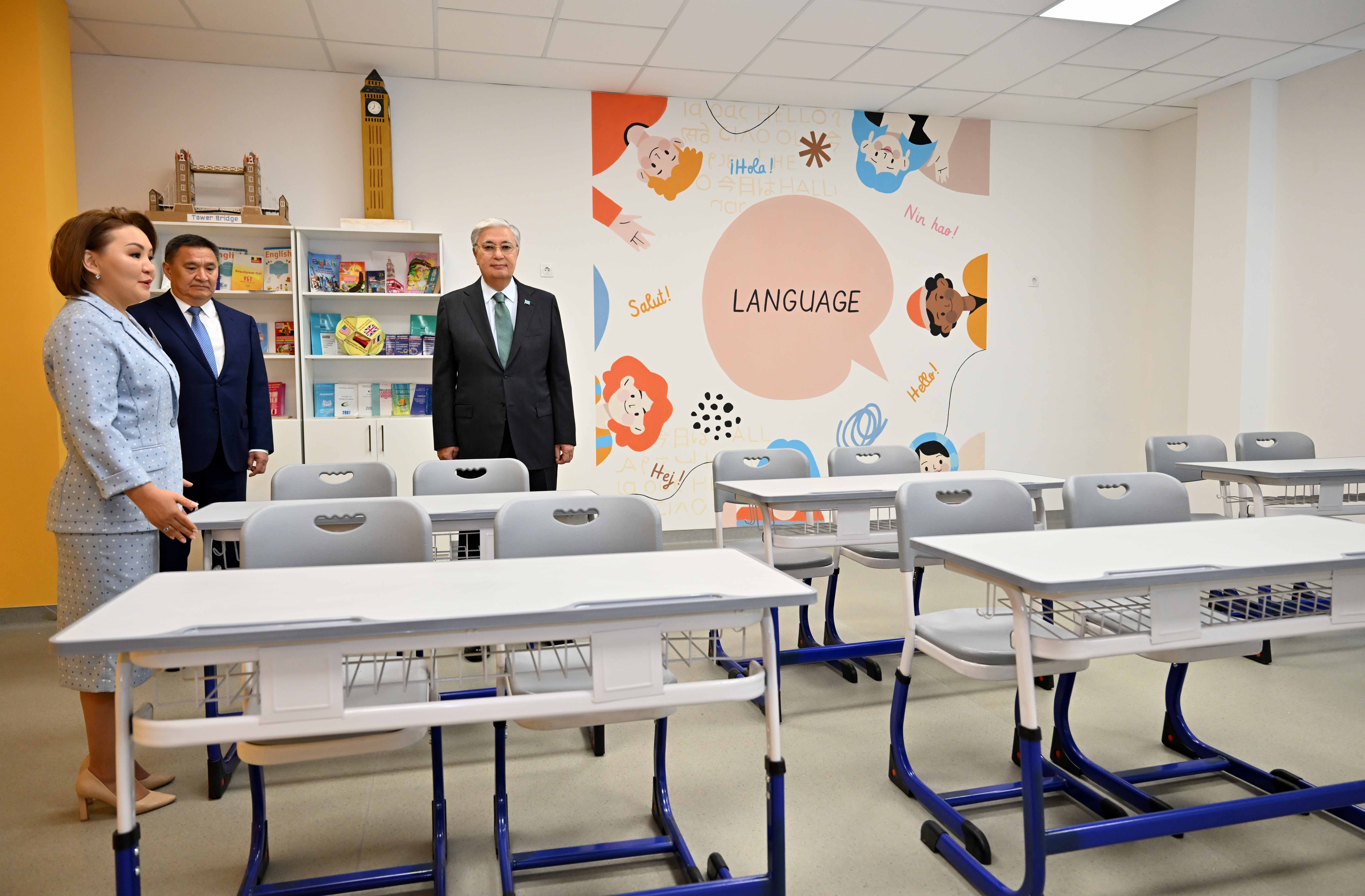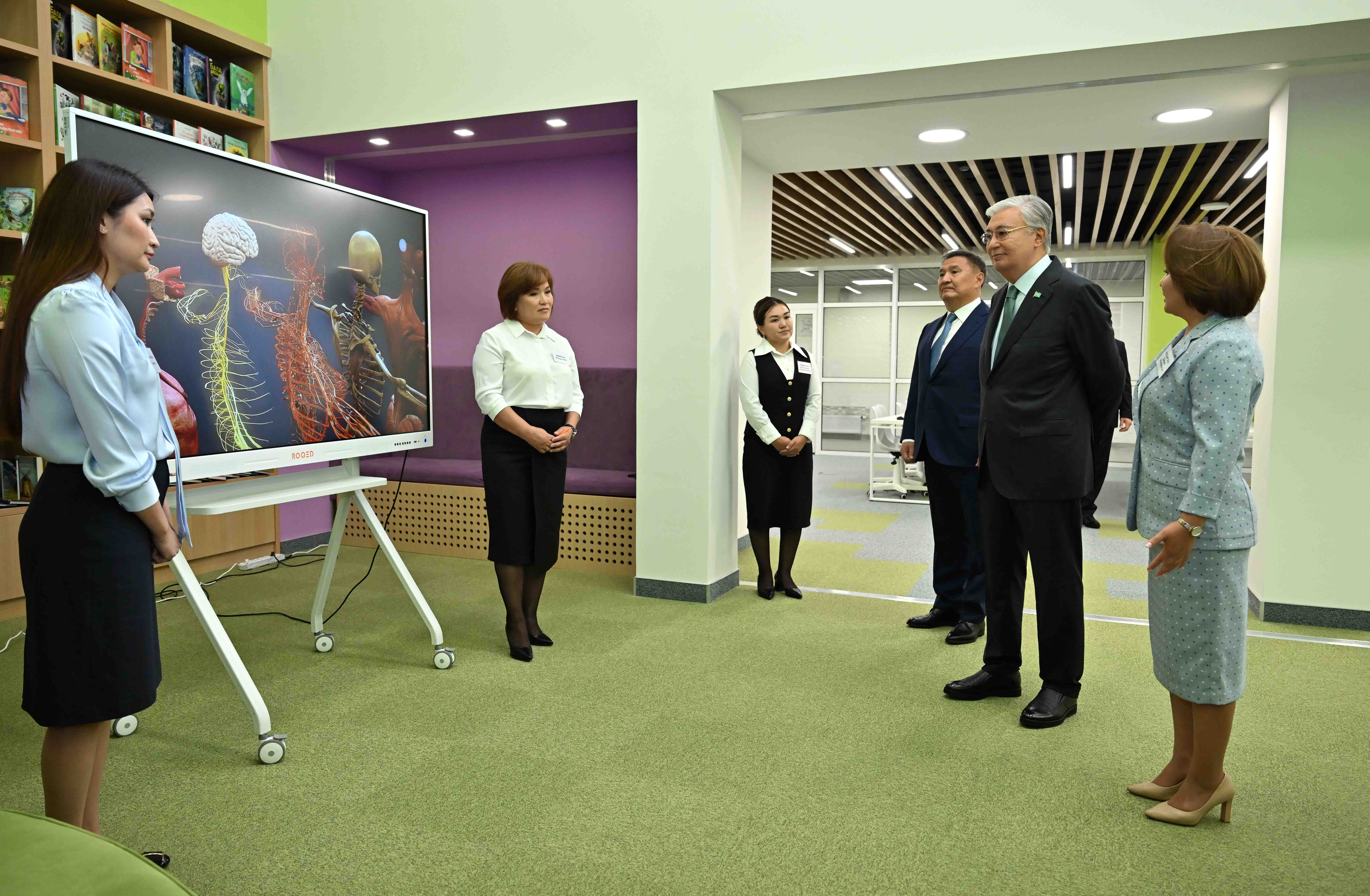 Мемлекет басшысы роботты техника, мобилография, автомобиль жүргізуді виртуалды үйрену, шет тілі кабинеттерін, мектеп кітапханасын аралап көріп, ұстаздармен және оқушылармен әңгімелесті