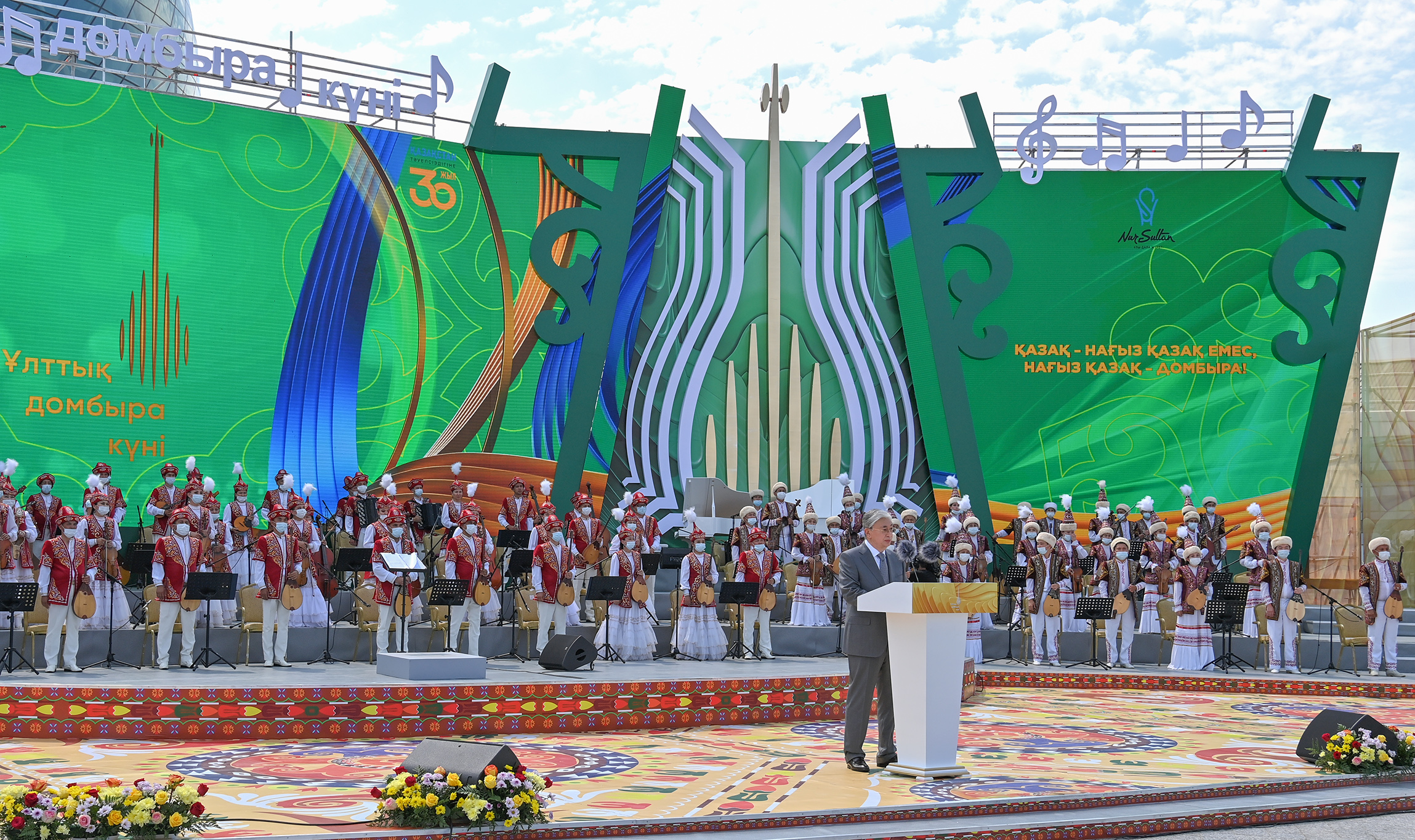 – Бұл – халқымыздың тамыры тереңде жатқан төл өнерін дәріптейтін мейрам. Қазақ пен домбыра – бір-бірінен бөле-жаруға болмайтын егіз ұғым. Домбыра – көне заманның аңыздарына арқау болған киелі аспап. «Ақсақ құлан» күйінің шығу төркінін білмейтін қазақ кемде-кем. Ежелгі дәуірден жеткен қастерлі домбыра ұрпақтан-ұрпаққа мирас болып келеді. Қазақ сан ғасырлық шежіресінің куәсі болған қасиетті аспапты бойтұмарына балаған. Қазіргі тілмен айтсақ, бұл – біздің ұлттық брендіміз, – деді Президент.