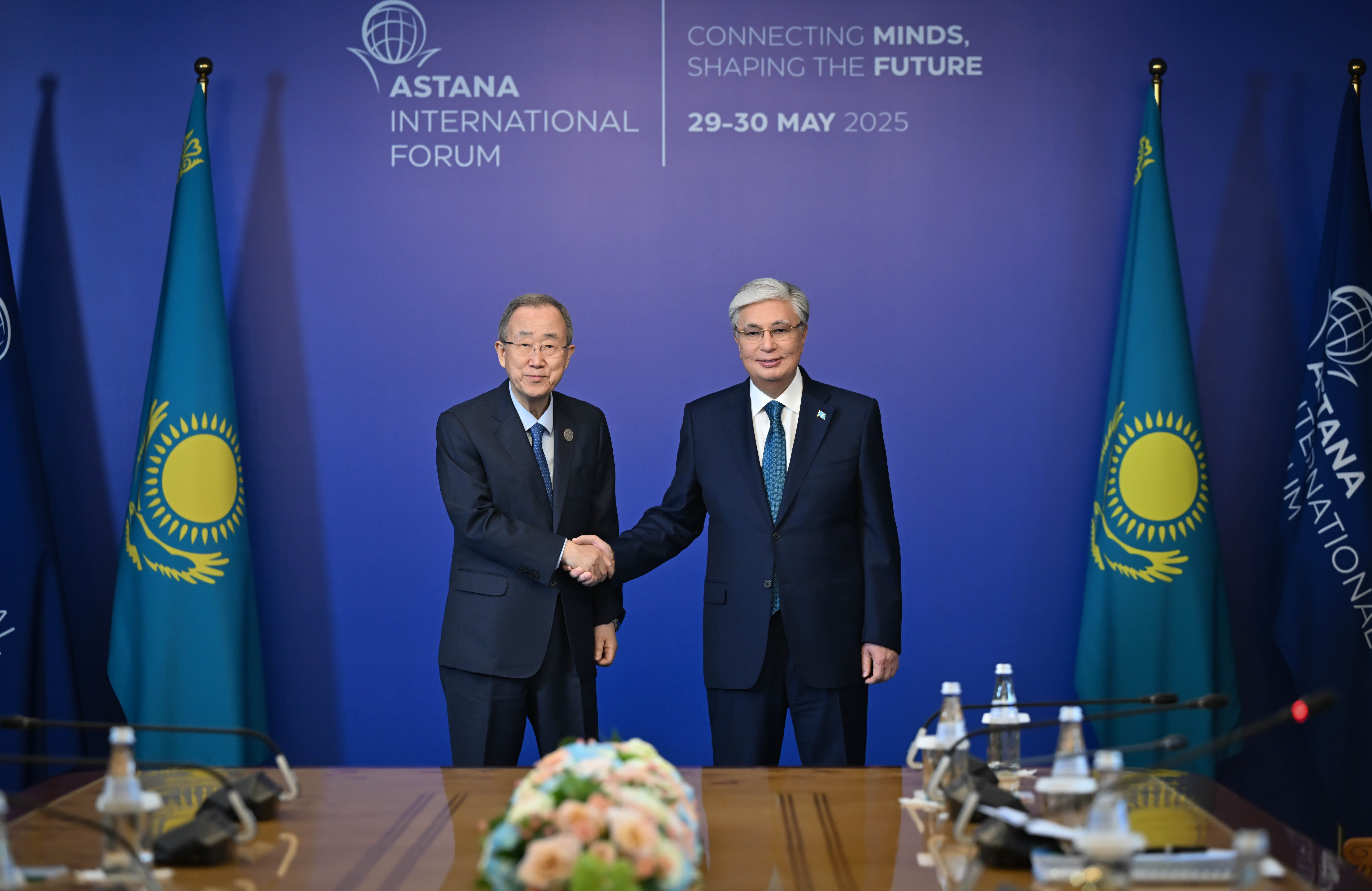Астана халықаралық форумы алаңында Президент Қасым-Жомарт Тоқаев Жаһандық жасыл даму институтының төрағасы, БҰҰ-ның сегізінші Бас хатшысы Пан Ги Мунмен кездесу өткізді.