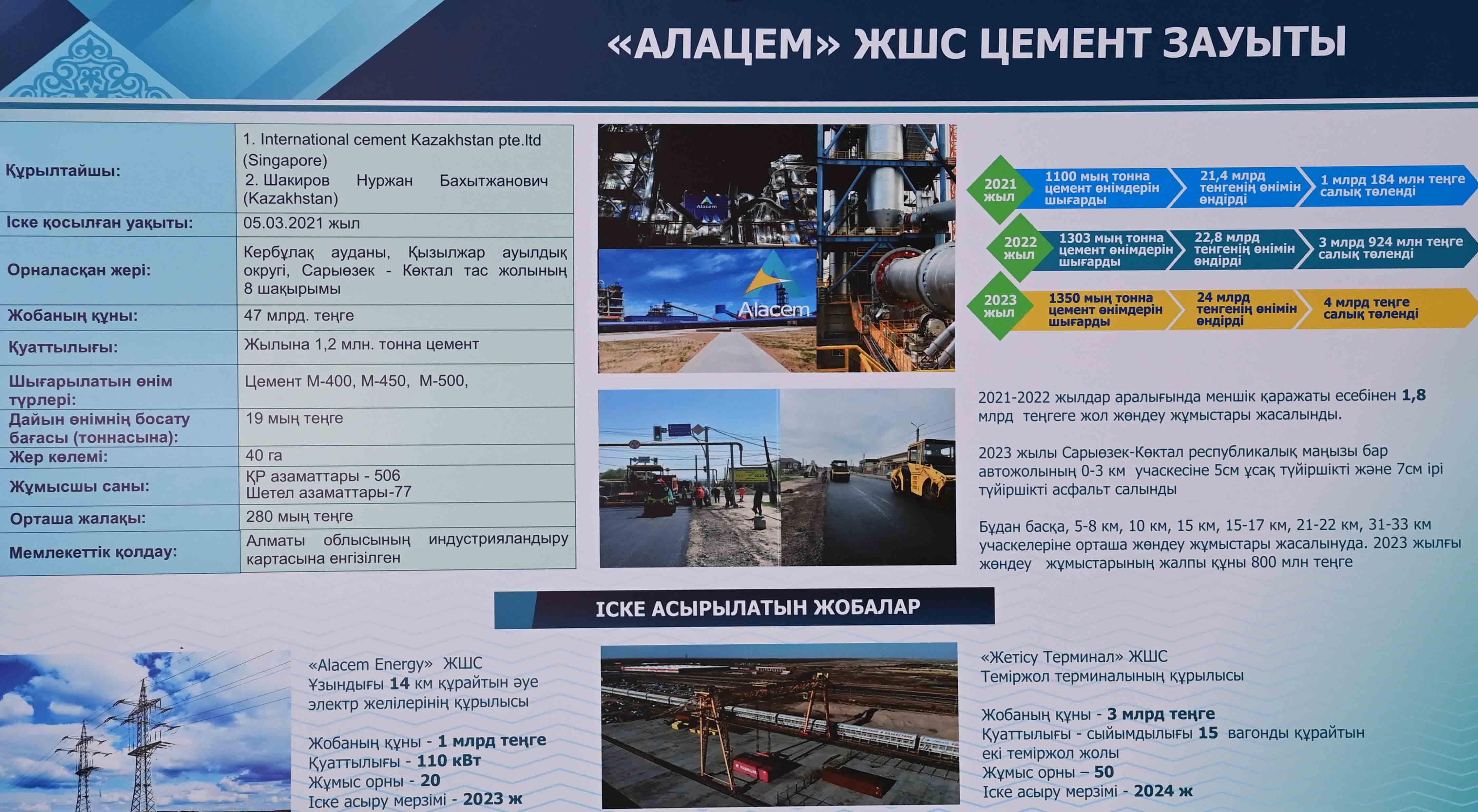 Кәсіпорынның басқарушы директоры Станислав Щербаковтың айтуынша, зауыт Алматы қаласының, Жетісу және Алматы облыстарының цемент өніміне деген сұранысын 65 пайызға дейін қамтамасыз етеді. Жобаны жүзеге асыру барысында экологиялық таза, қалдықсыз өндіріс стандарттарына сай келетін озық технологиялар қолданылған. Сондай-ақ өнім процесін басқару үшін DCS интеллектуалды жүйесі енгізілген.