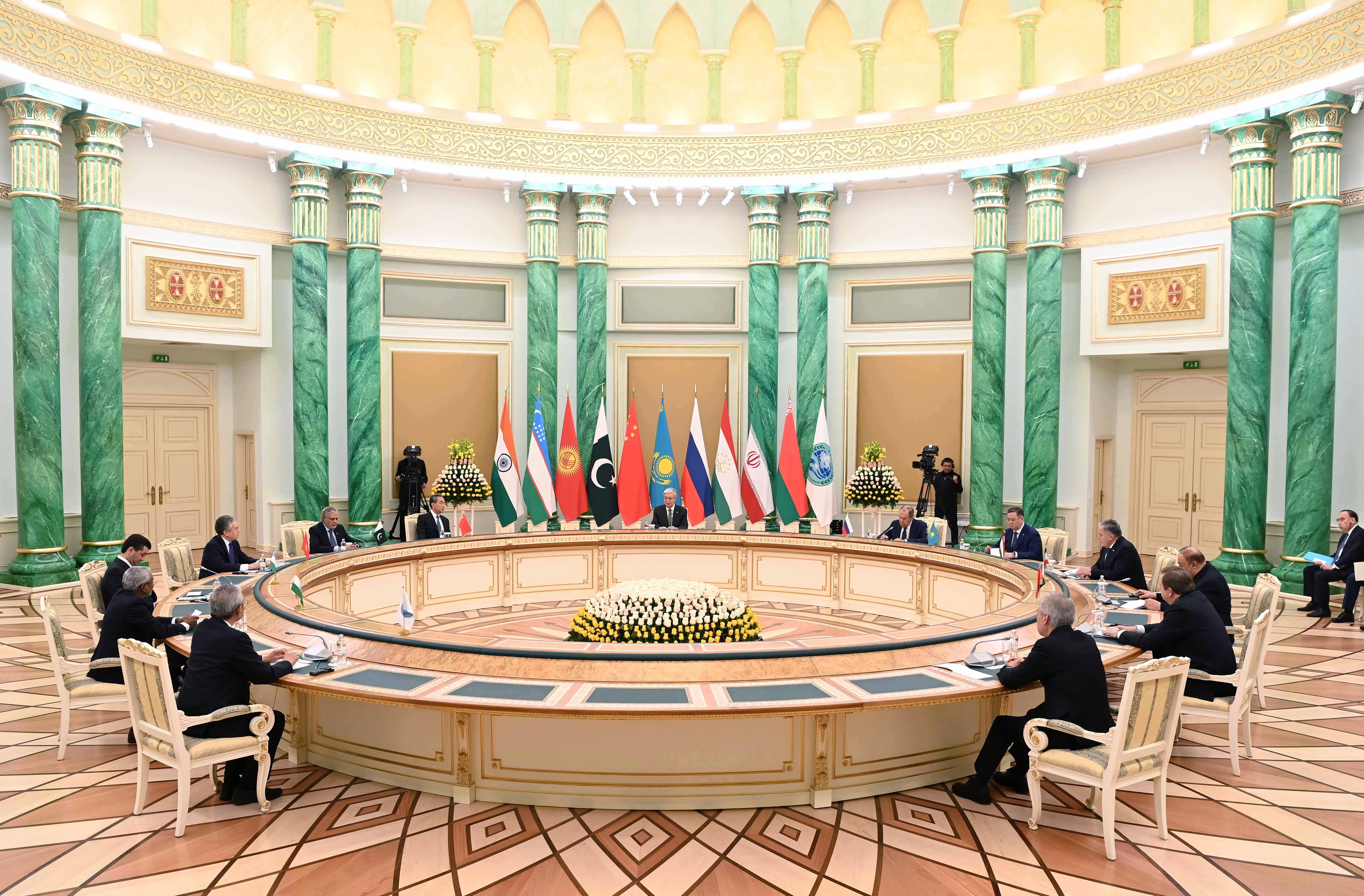 – Еліндегі ауыр жағдайға қарамастан Иранның, сондай-ақ алдағы уақытта қатарымызға қосылатын Беларусьтің өкілдері Астанадағы Сыртқы істер министрлерінің кеңесіне алғаш рет қатысып отырғанын ерекше атап өткім келеді. Сіздердің елдеріңіз «шанхай рухын» одан әрі күшейтуге және ШЫҰ аясындағы көпжақты ынтымақтастықты нығайтуға айтарлықтай үлес қосатынына сенімдімін. Қазірдің өзінде біздің ұйымға Еуразия құрлығындағы он мемлекет мүше. Бұл елдерде жер шары халқының жартысына жуығы тұрады, сондай-ақ әлемдік жалпы ішкі өнімнің төрттен бірі және жаһандық сауда-саттықтың 15 пайызы осы мемлекеттерге тиесілі. Қазақстан ШЫҰ-ның төрағасы ретінде Ұйымның әлеуетін одан әрі арттыру үшін бар күш-жігерін жұмсайды, – деді Мемлекет басшысы.