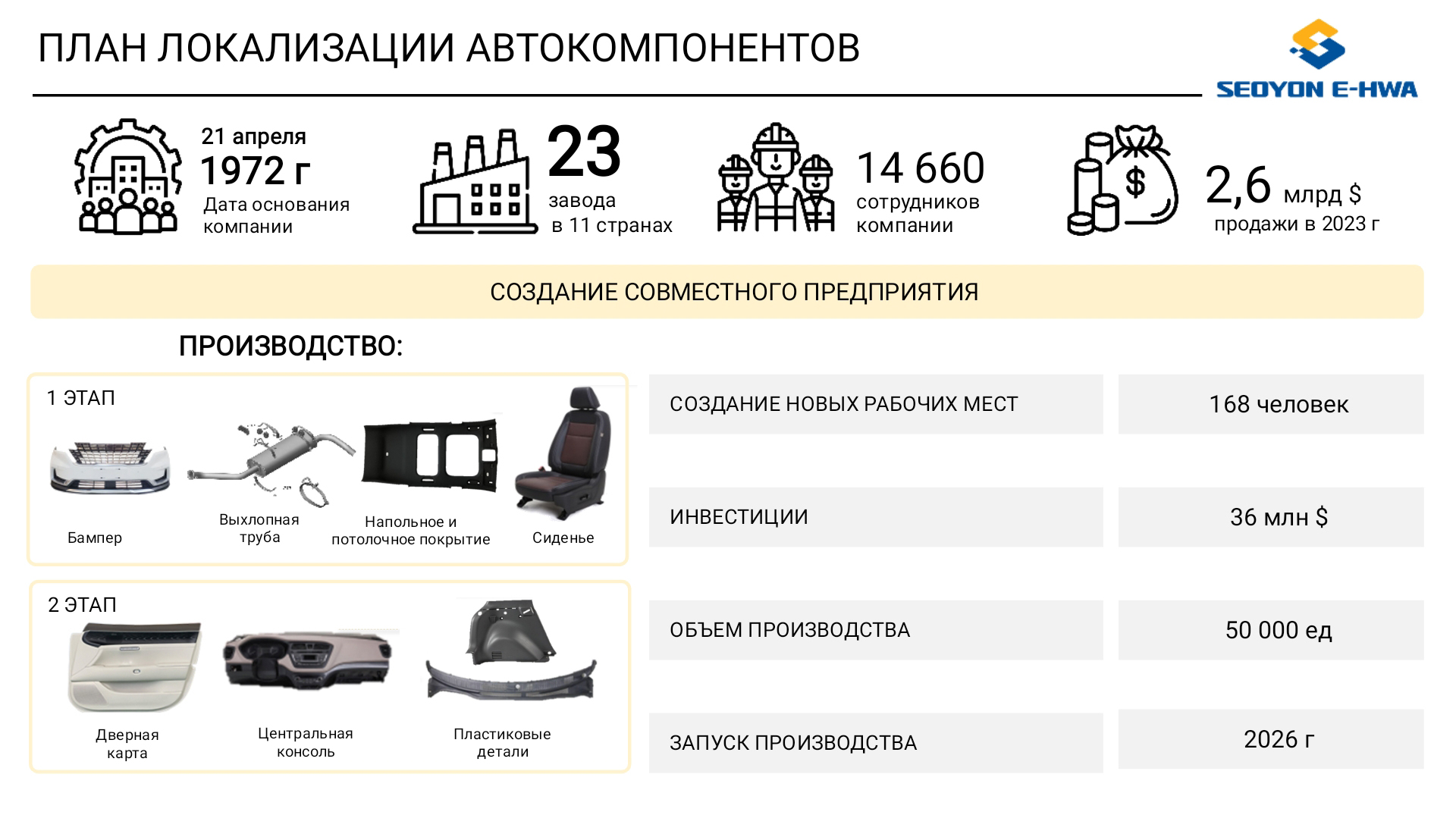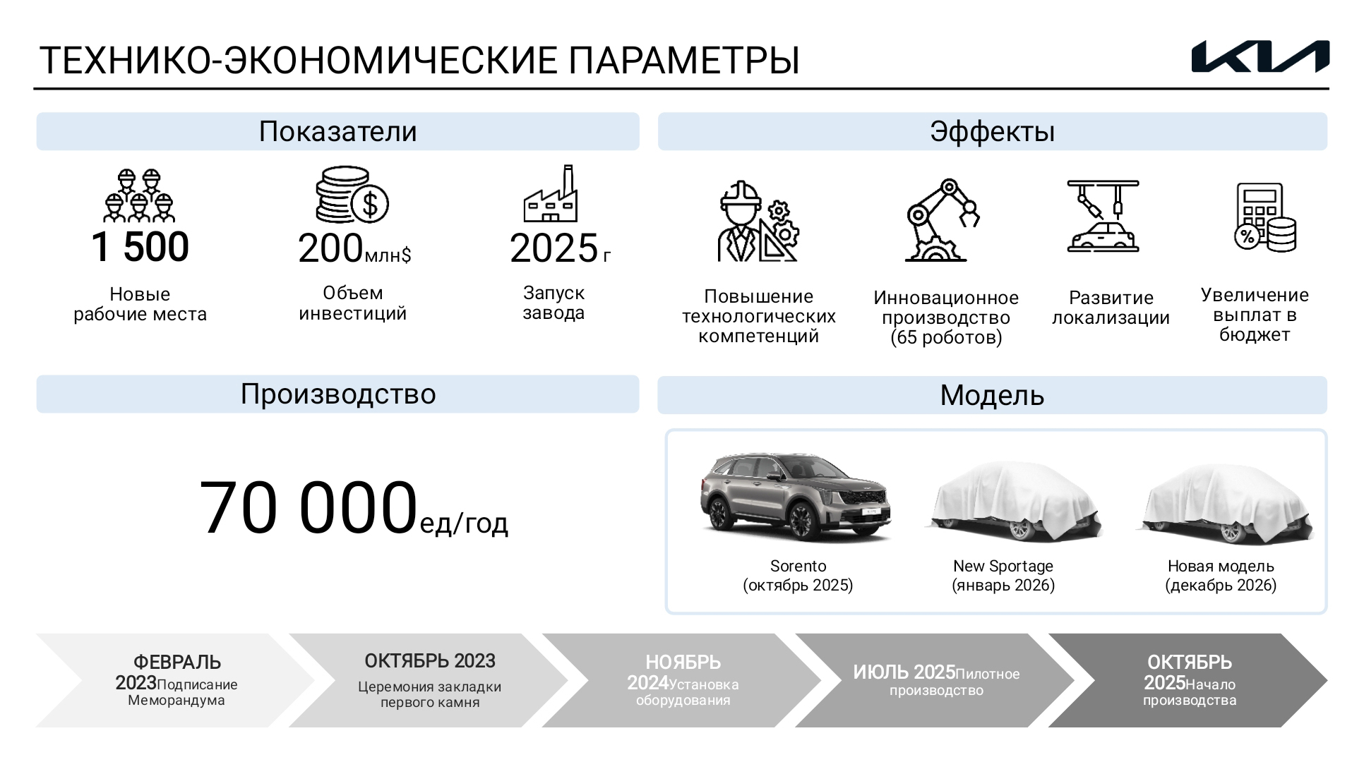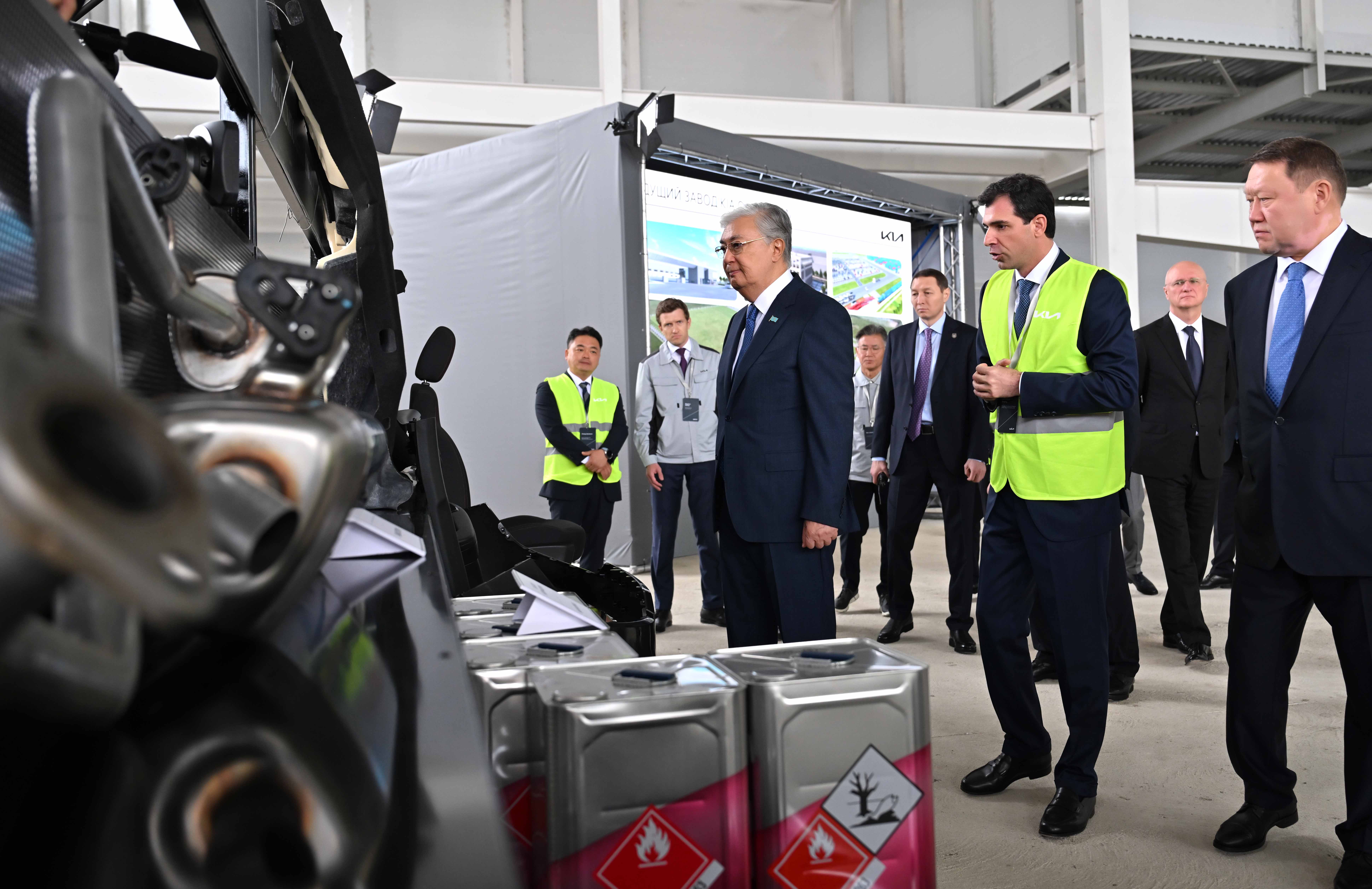 Қостанай қаласы Мемлекет басшысы Қасым-Жомарт Тоқаев Қостанай облысындағы KIA автомобильдерін шығаратын зауыттың құрылыс алаңына барды. Президентке құрылыс жұмыстары былтыр қазан айында басталғаны туралы баяндалды. Жоспарға сәйкес, конвейерден алғашқы көлік сынақ режимінде келесі жылдың шілде айында шығарылады. KIA Qazaqstan бас директоры Ким Дэ Ки зауыт 2025 жылдың қазан айында іске қосылатынын жеткізді. Автокәсіпорын бастапқы кезеңде Sorento моделін шығаруды жоспарлап отыр. 2026 жылдың қаңтар айынан бастап жаңартылған Sportage моделі құрастырылады. Президентке KIA зауыты жылына 70 мыңға жуық автокөлік шығара алатыны жөнінде мәлімет берілді. Кәсіпорында жаңадан 1500 тұрақты жұмыс орны ашылады. Мұнда өндірістің тиімділігін арттыруға әрі экологиялық тұрғыдан зиянсыз етуге бағытталған технологиялық шешімдер қолданылады. Автоматтандырылған заманауи кәсіпорынның дәнекерлеу желісінде, автокөлікті бояу және құрастыру жұмыстарына 70 робот пайдаланылады. Жобаның құны 200 миллион долларды құрайды, оның 80 пайызға жуығы тікелей шетелдік инвестицияның үлесінде. Сонымен қатар Қасым-Жомарт Тоқаевқа жаңа зауыттың жанынан қосалқы бөлшектер өндірісінің кластерін құру жобасы таныстырылды. Бүгінде Локализация орталығының құрылысы басталған. KIA компаниясы автокөлік компоненттері мен қосалқы бөлшектерін өндіруші жаһандық компанияларды тарту бойынша жұмыс жүргізіп жатыр. КСС Corporation компаниясы автокөлік компоненттері бөлімінің басқарушысы Пак Сэйон мен Seoyon Ehwa Global компаниясы жаһандық бизнесті басқару тобының жетекшісі Чанг Сэоквон Оңтүстік Кореяның өндірушілері Қазақстанда өз өндірісін ашуға әзір екенін айтты.