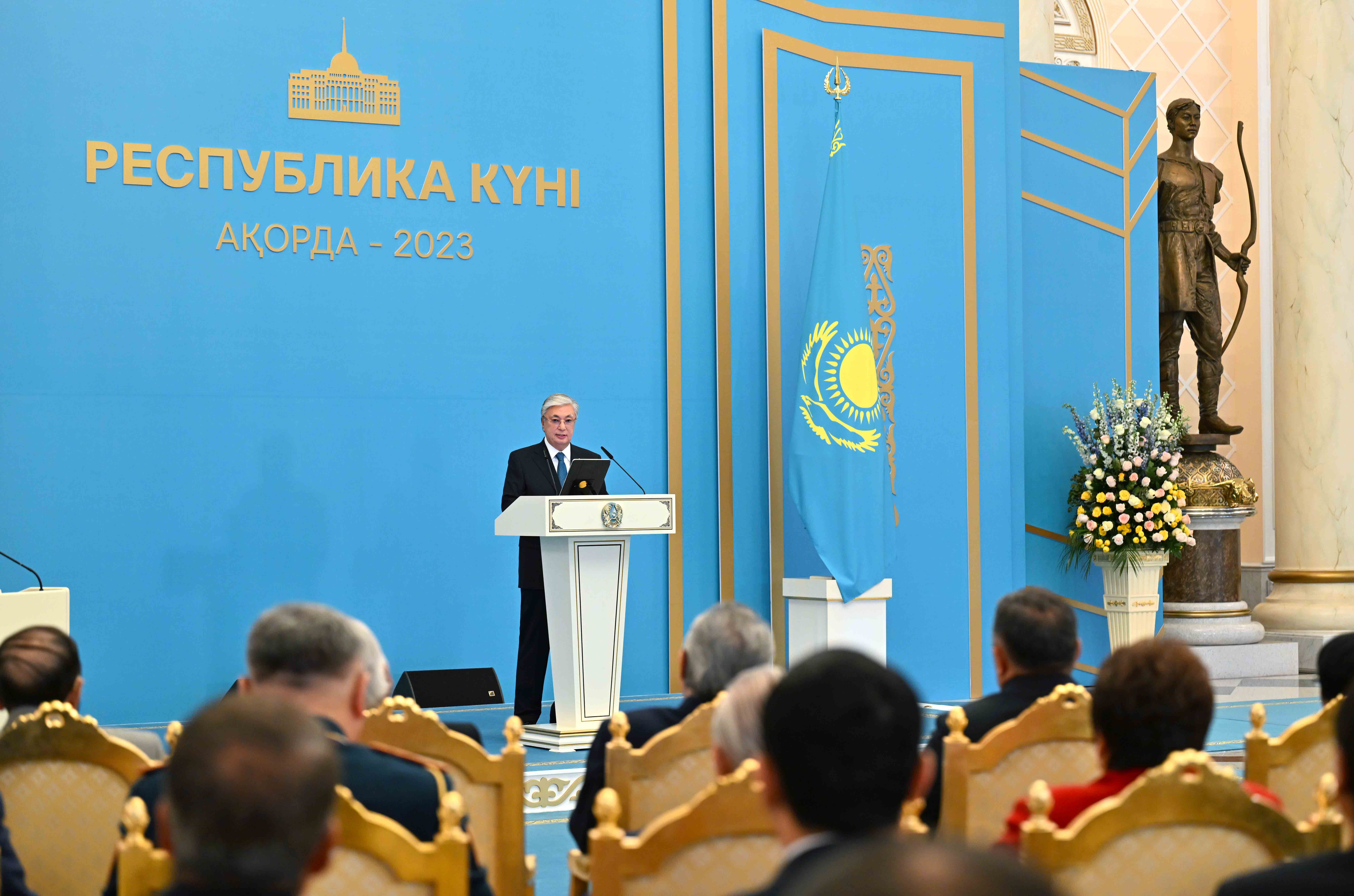 Президент, ең алдымен, салтанатты жиынға қатысушыларды еліміздің ең басты мейрамы – Республика күнімен құттықтады.