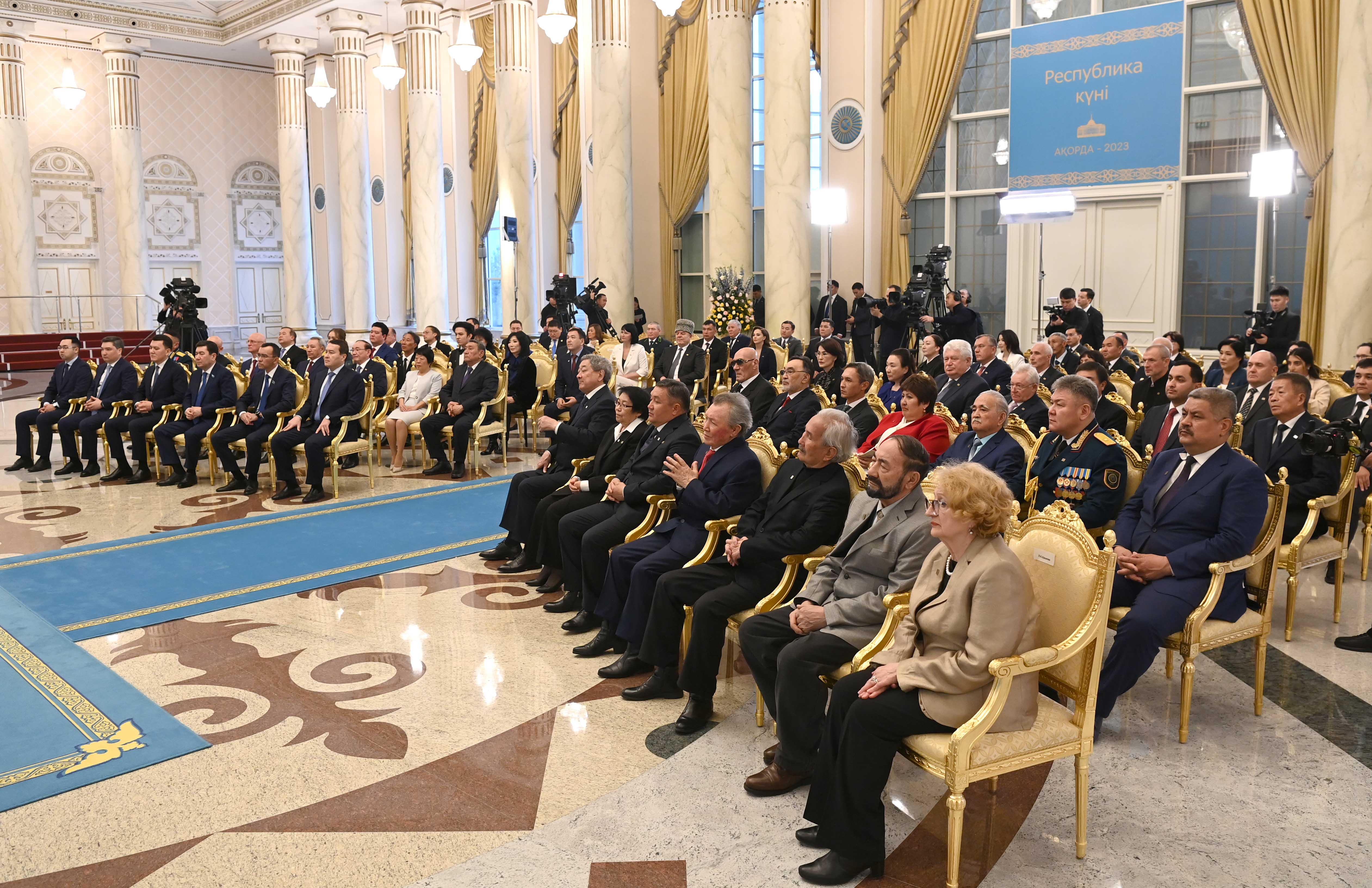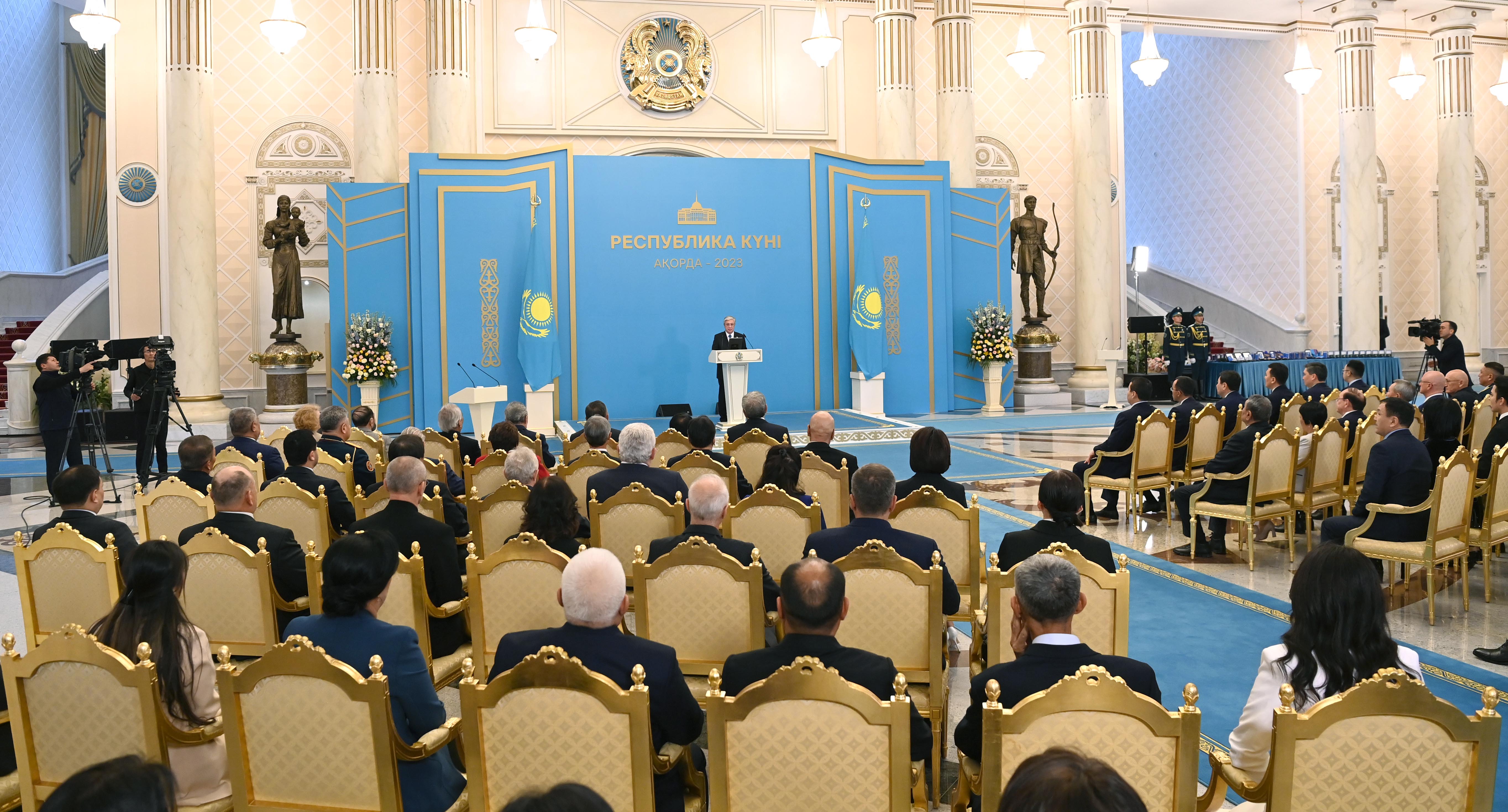 Президент сөзін қорытындылай келе, еліміздің дамуына елеулі үлес қосқан бір топ азаматқа жоғары мемлекеттік наградалар, сыйлықтар мен атақтар табыс етті.
