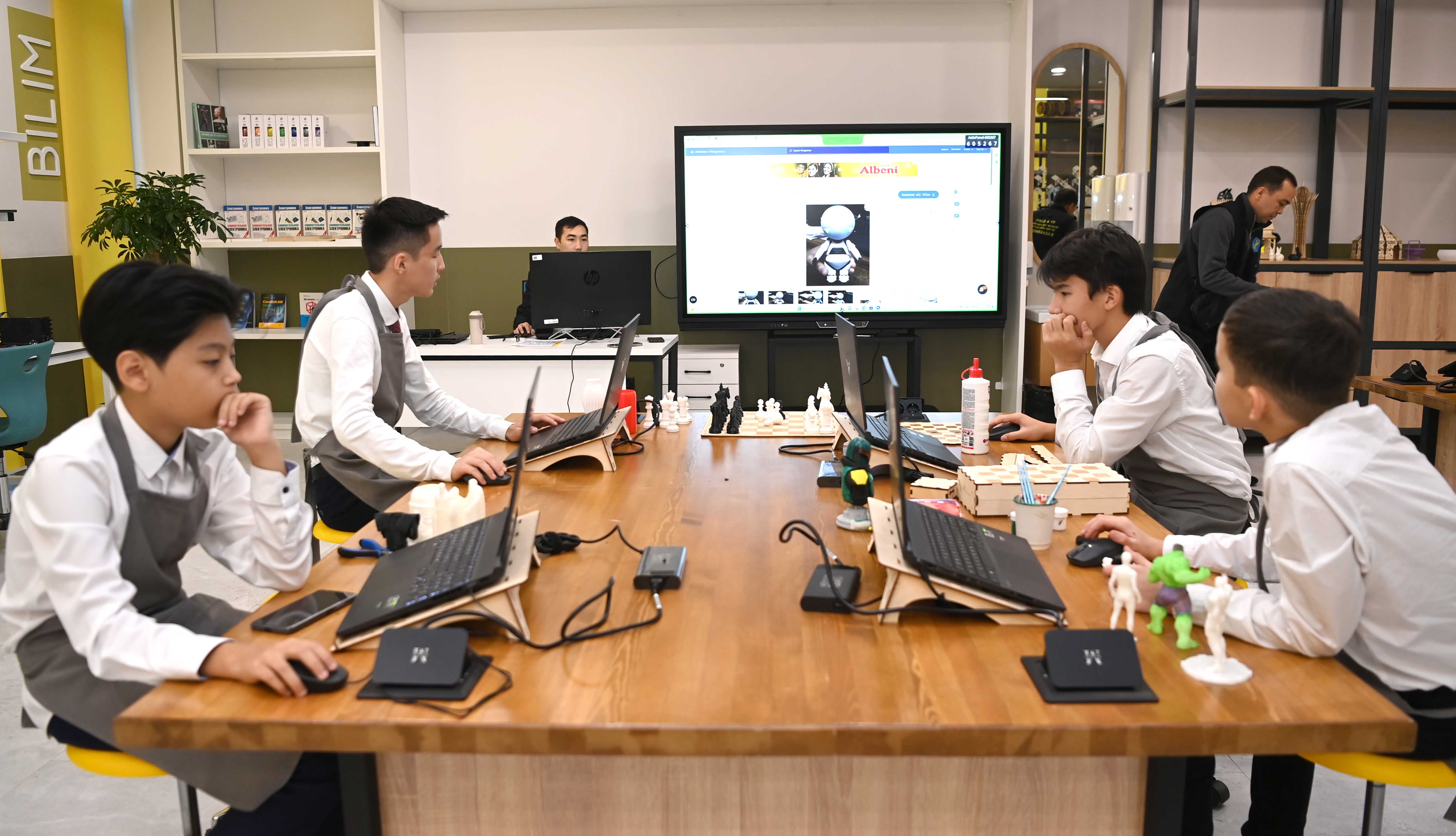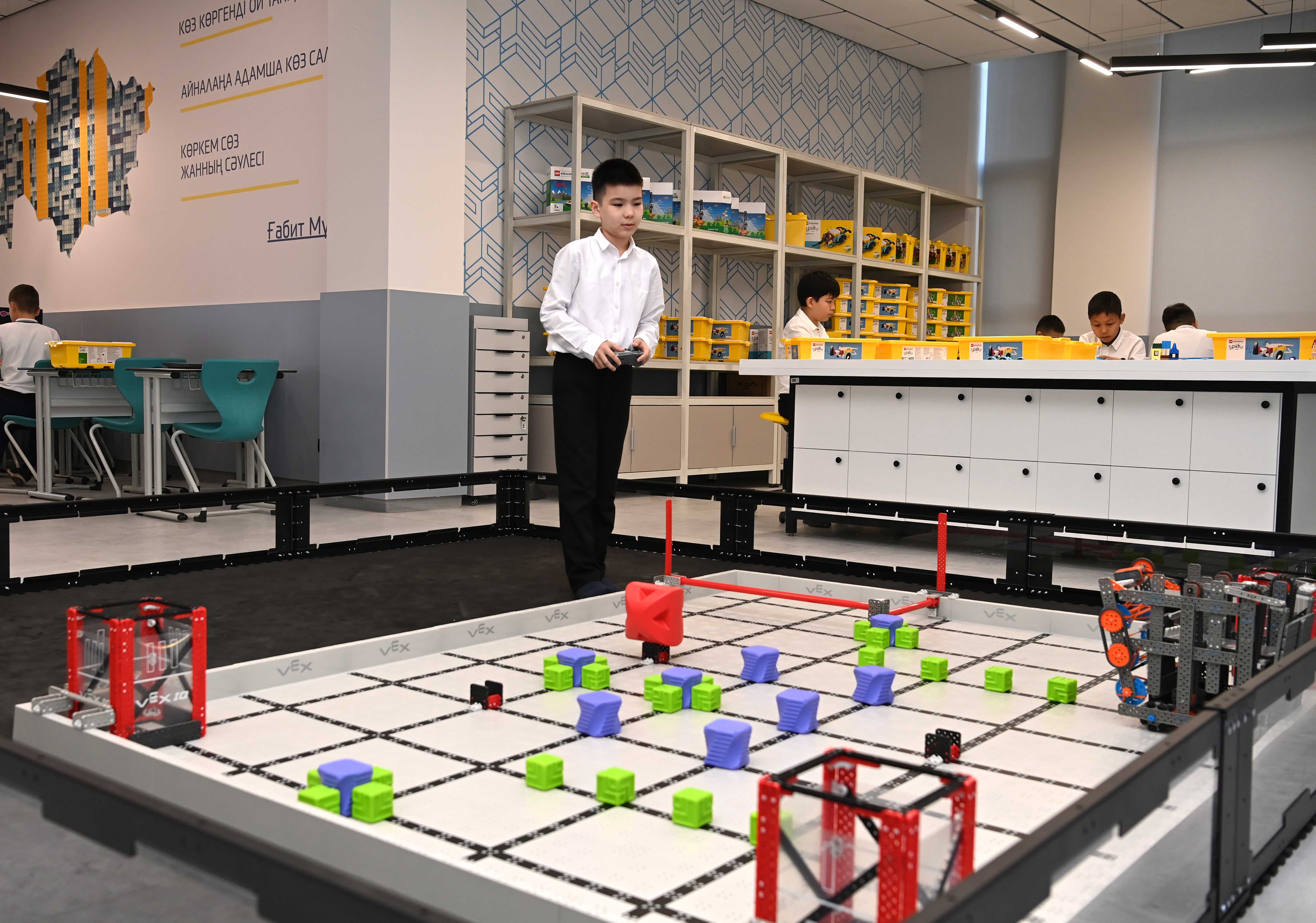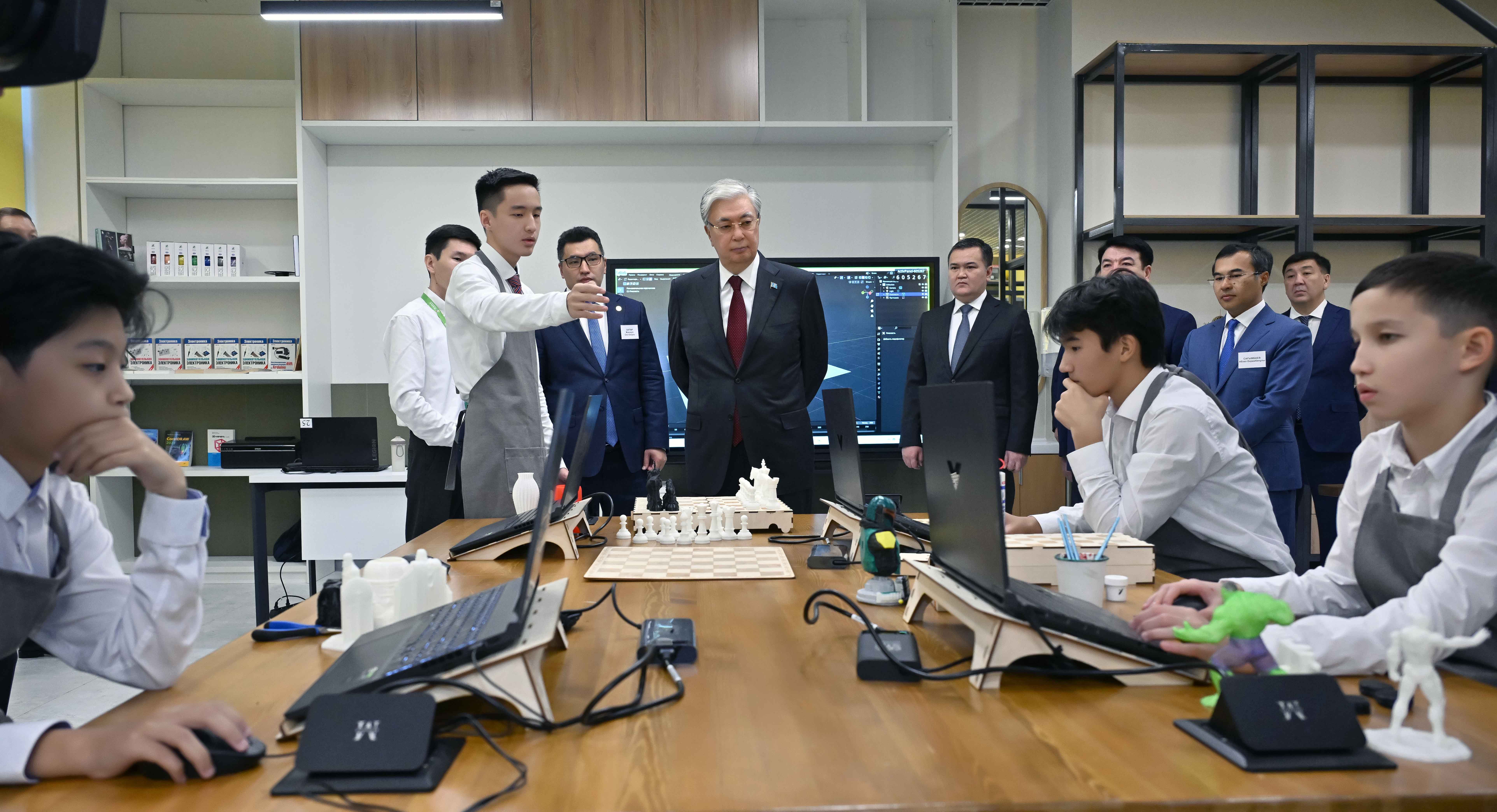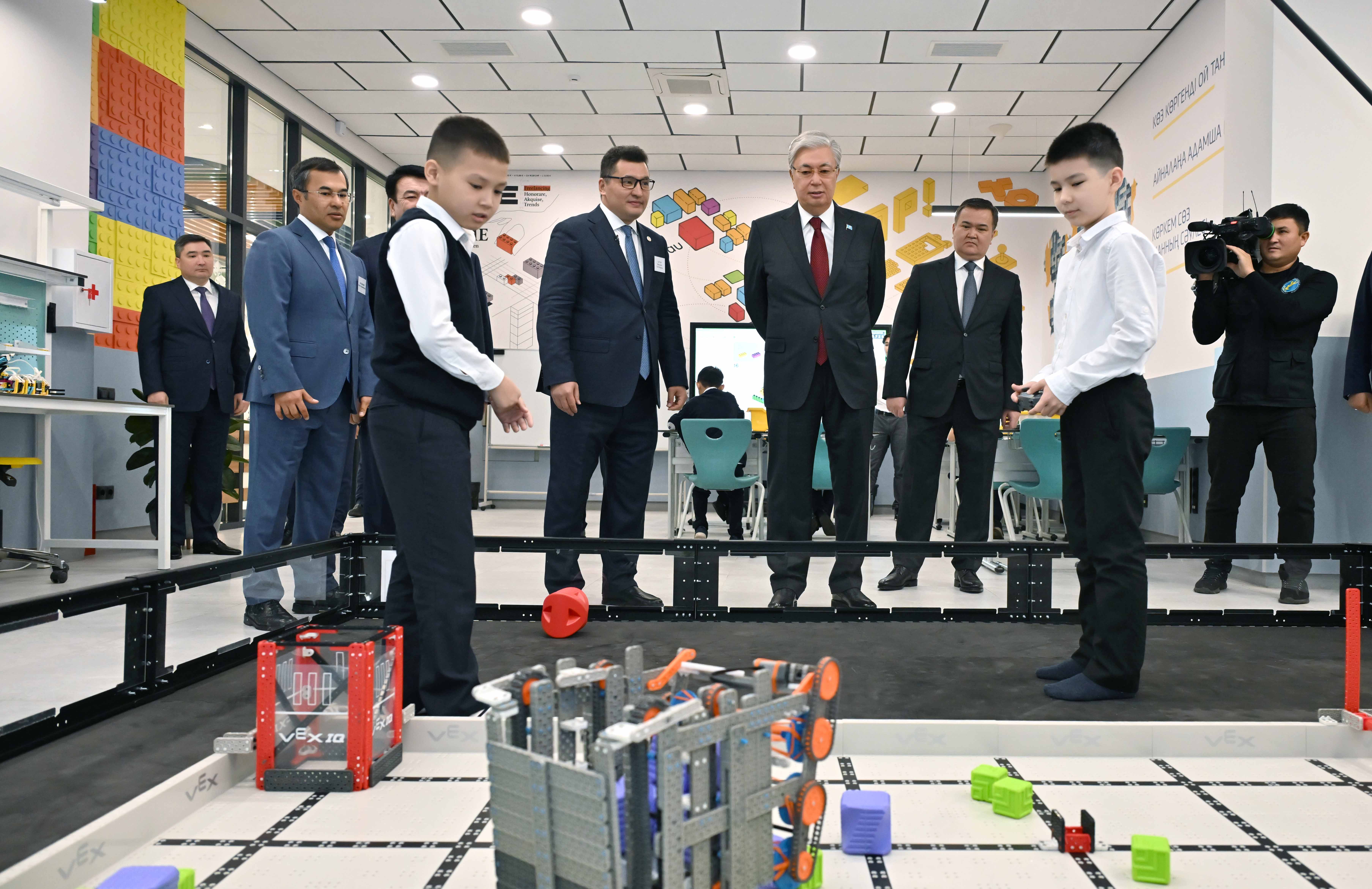 Глава государства осмотрел кабинеты по сборке Lego, робототехнике, 3D-моделированию, гончарному искусству, кружки ударных инструментов, домбры и плавательный бассейн. Президент также побеседовал с преподавателями центра, детьми и их родителями.