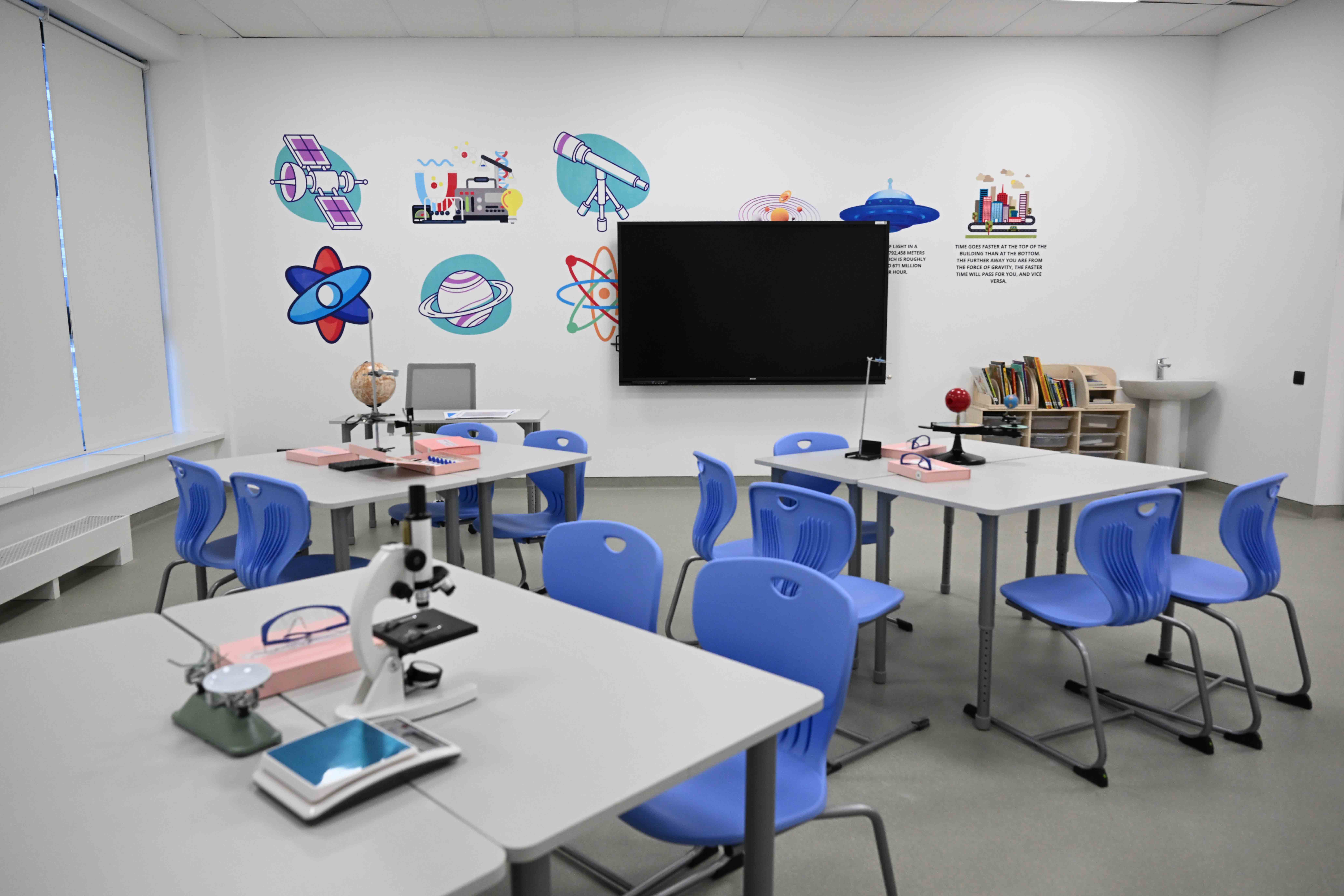 Учебные классы оснащены современными технологиями, создающими комфортные условия для обучения и раскрытия потенциала каждого ученика. Школа также располагает спортивной инфраструктурой: футбольным стадионом, теннисным кортом, мини-футбольным полем и двумя бассейнами.