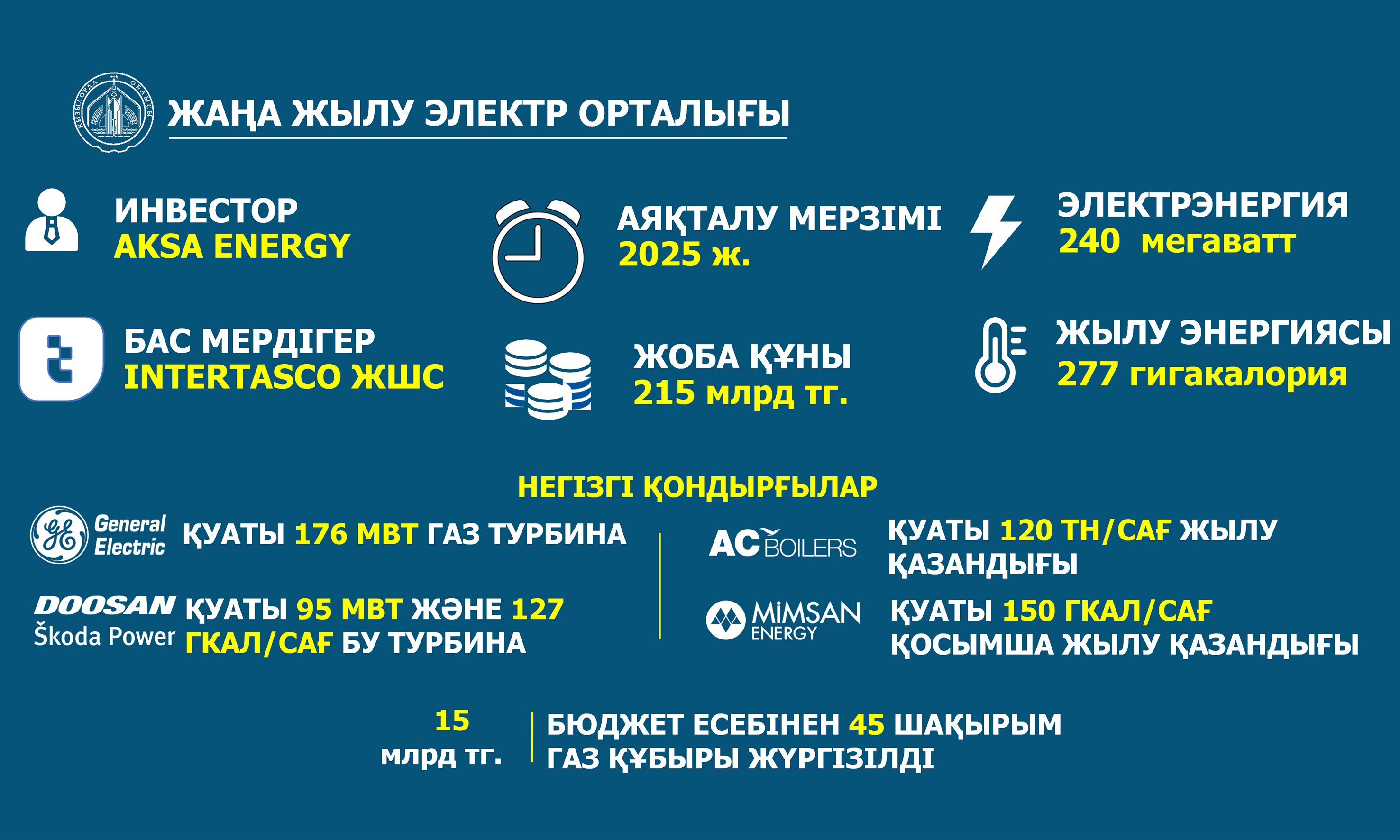 Общая стоимость проекта — 215 млрд тенге. Теплоэлектростанция полностью построена за счет инвестиций турецкой компании Aksa Energy.