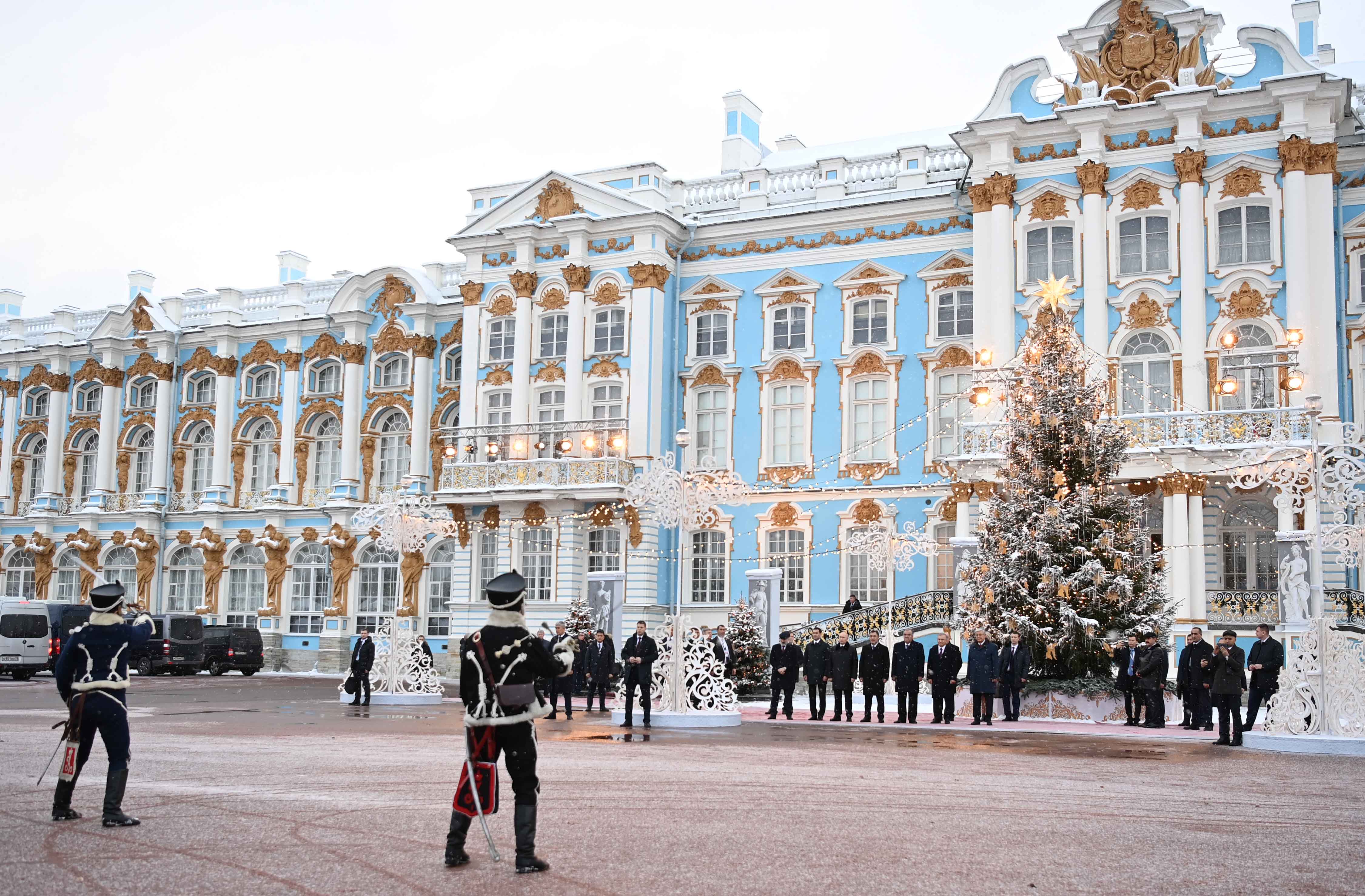 Затем главы государств посетили музей-заповедник «Царское село» и осмотрели залы Екатерининского дворца. Царскосельский дворцово-парковый ансамбль – признанный шедевр архитектуры и садово-паркового искусства XVIII – начала XX веков. Бывшая летняя резиденция российских императоров – это один их самых посещаемых музеев России, который в 2022 году посетили 2,9 млн человек. В Екатерининском дворце, который является центральным объектом Царского села, находится легендарная Янтарная комната.