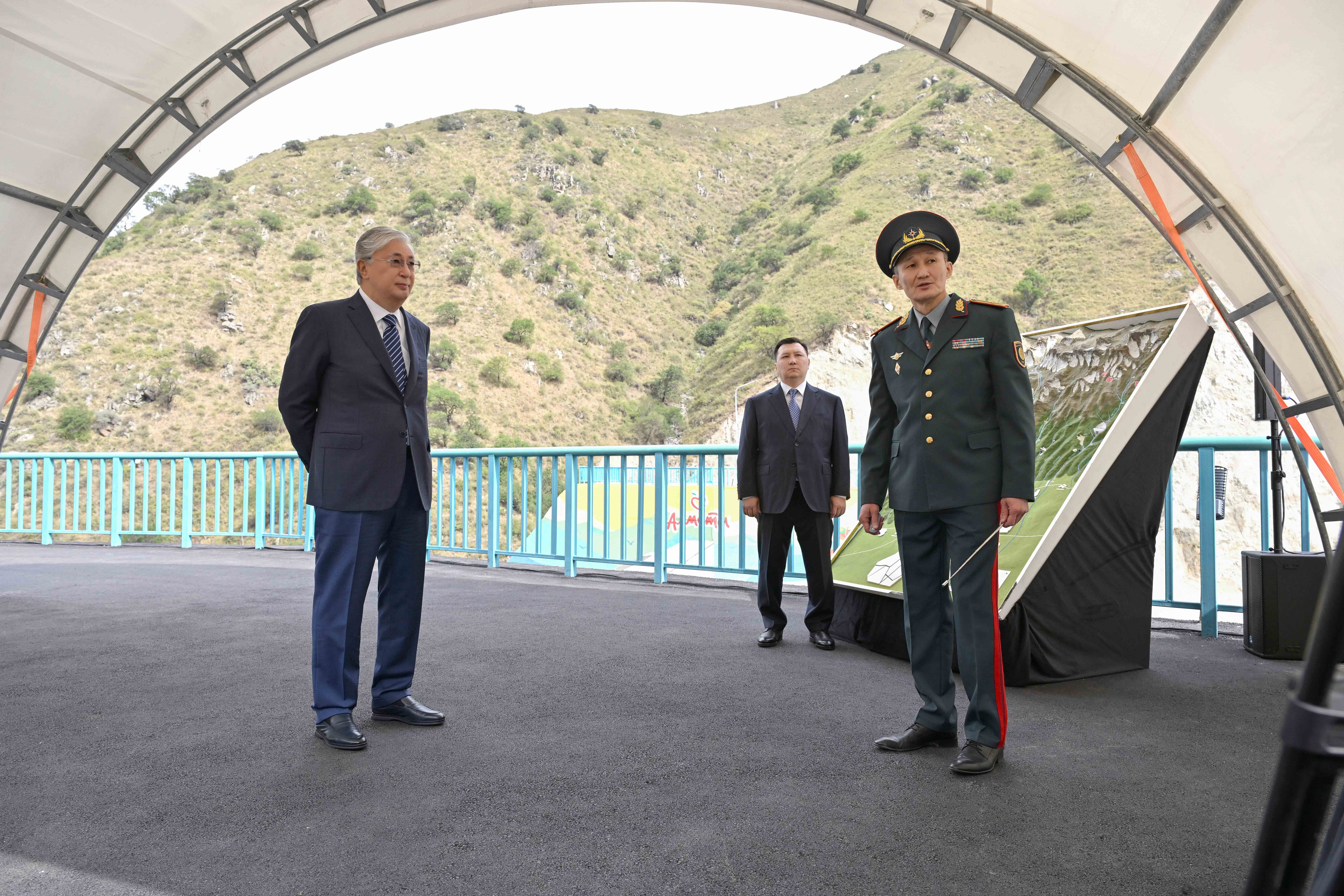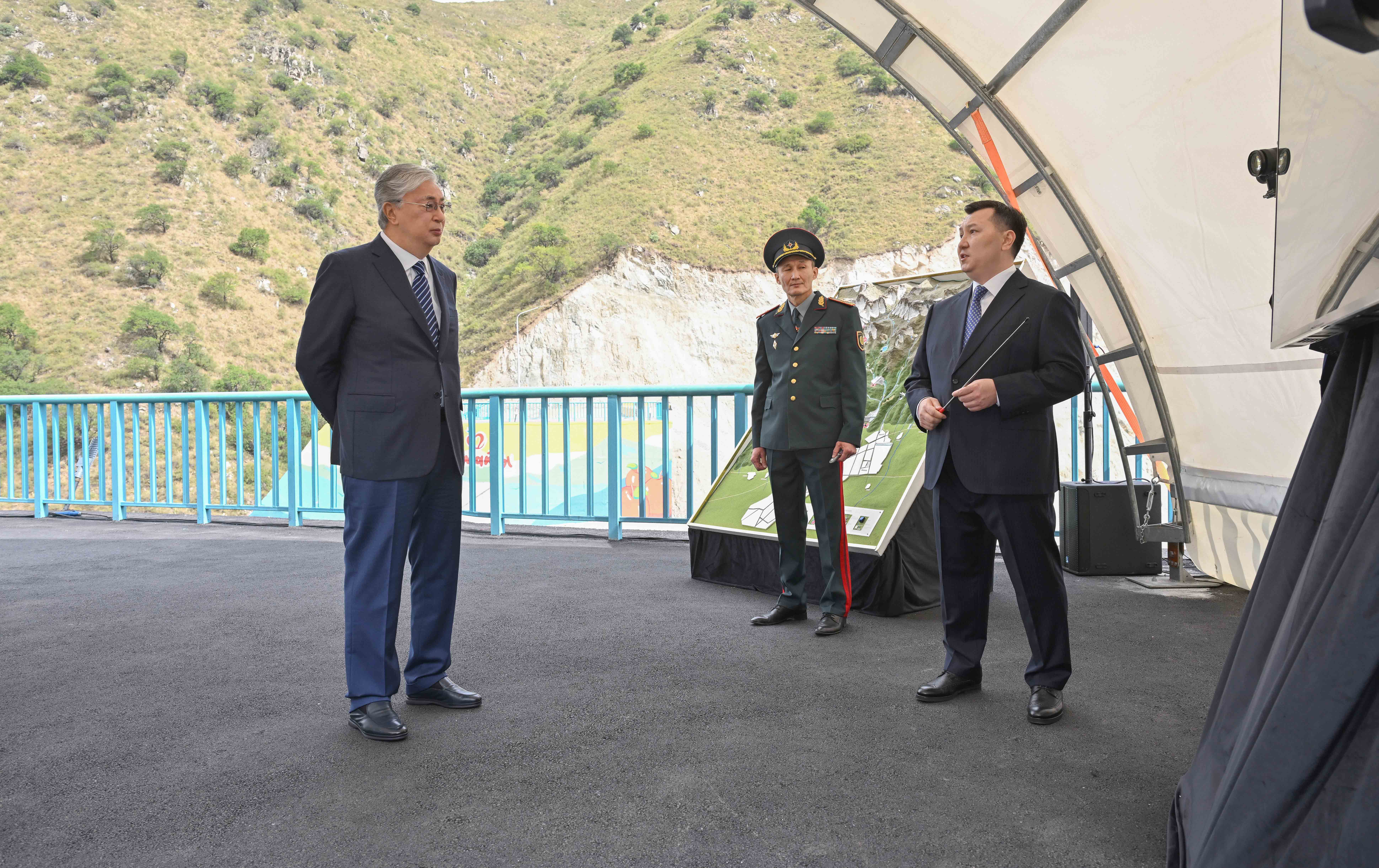 Рабочая поездка Президента Касым-Жомарта Токаева в город Алматы началась с посещения селезадерживающей плотины, которая была сдана 1 июня 2023 года.