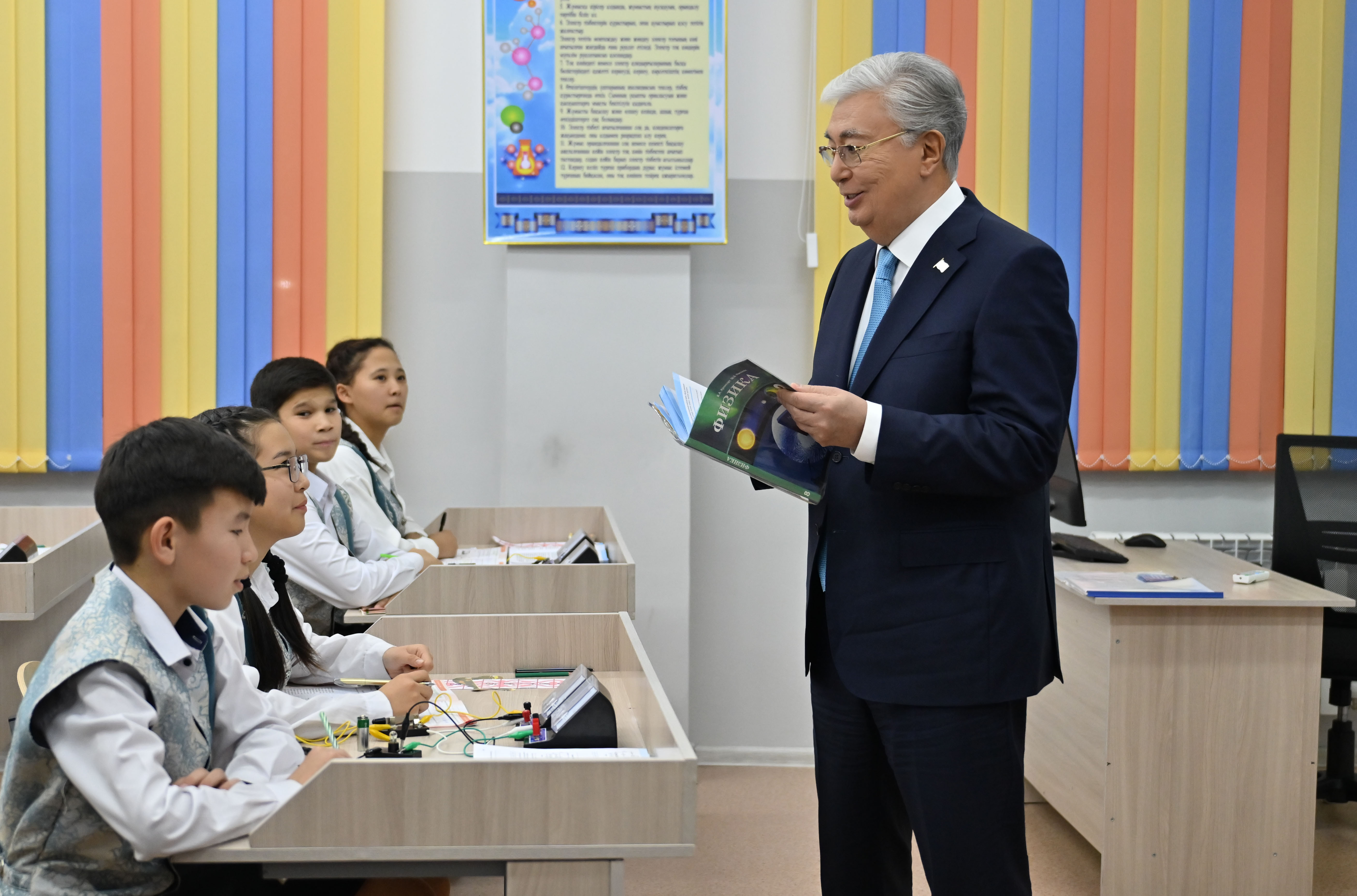 Президент осмотрел учебное заведение и побеседовал с учениками. Глава государства подарил образовательному учреждению школьный автобус.