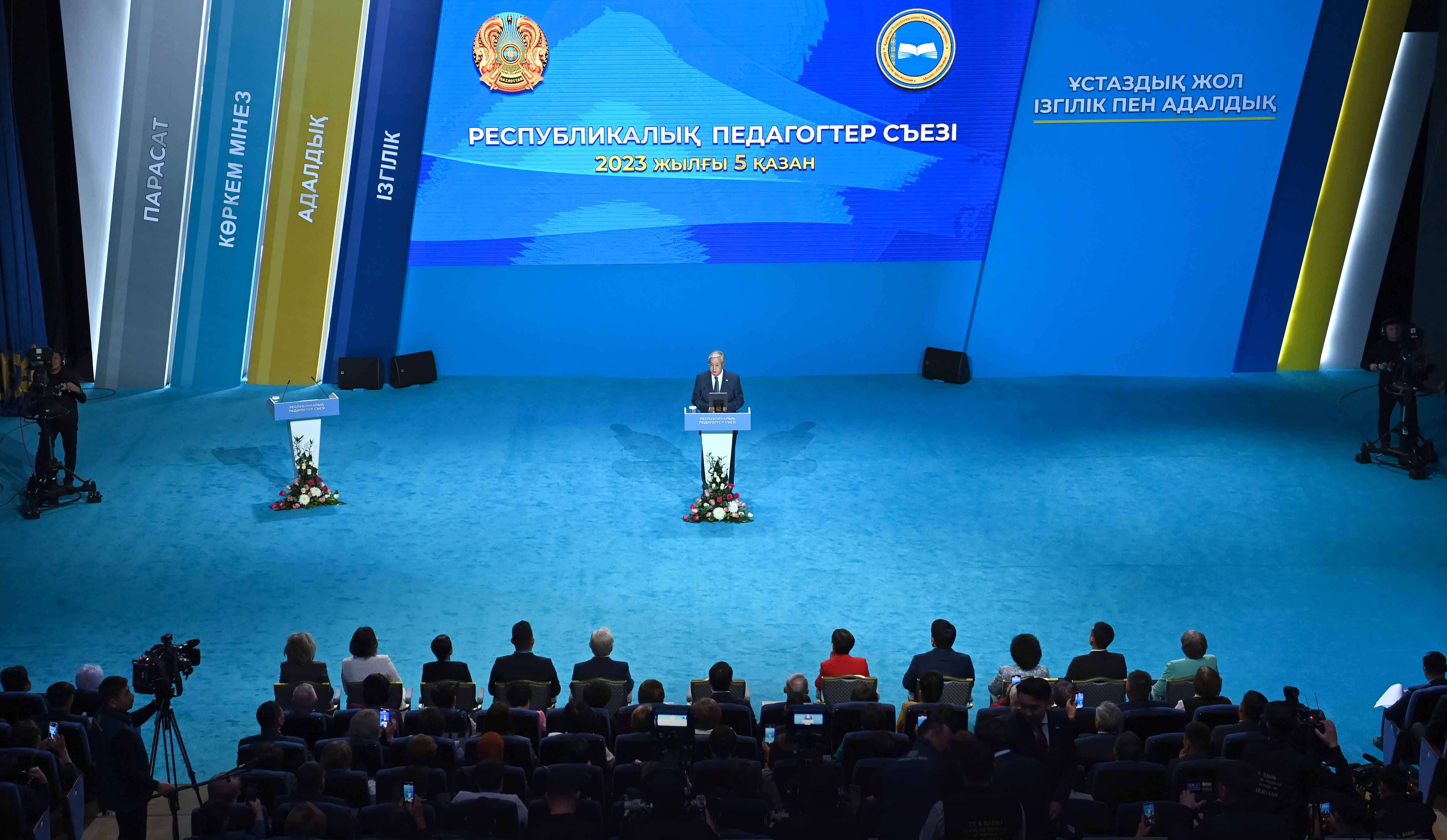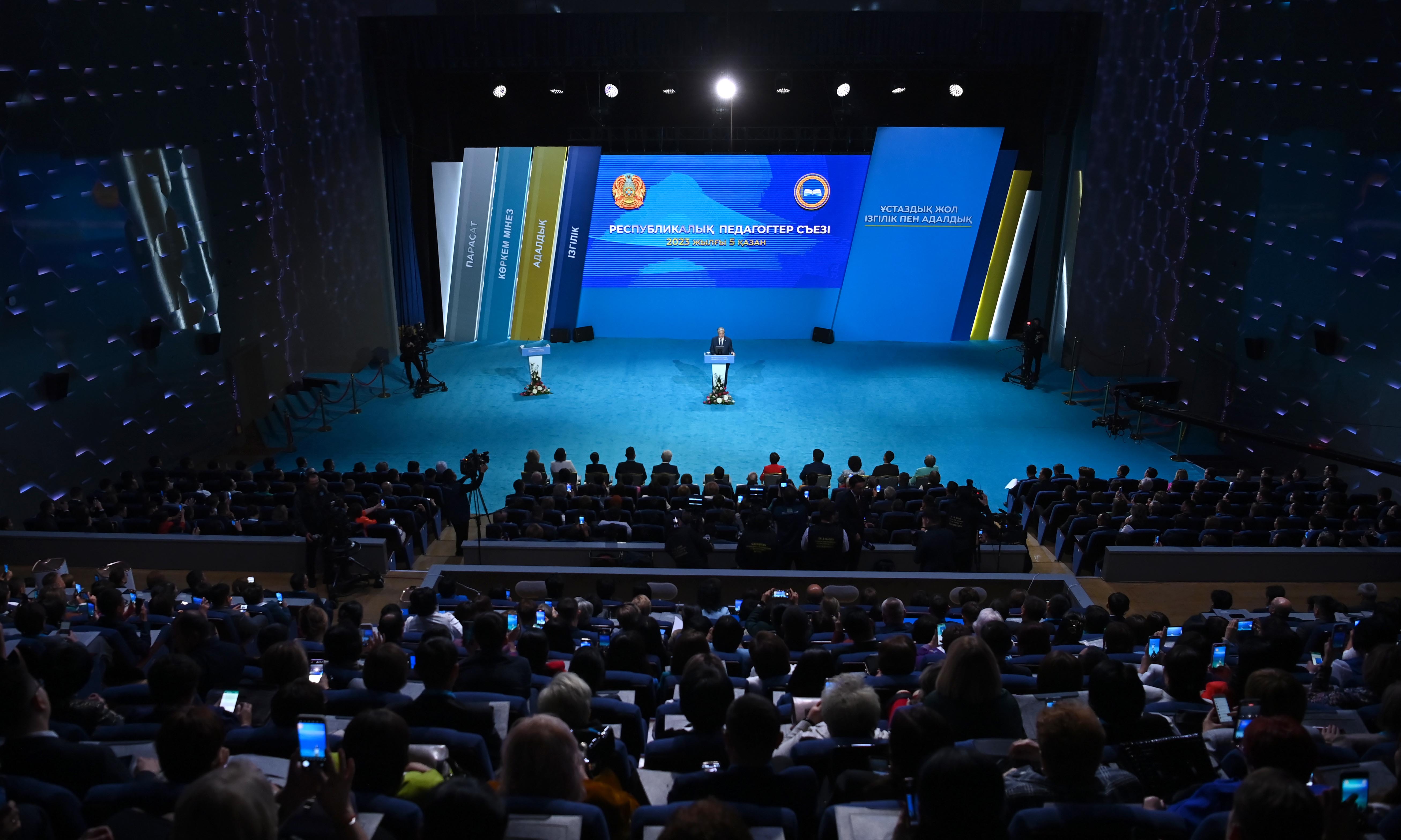 – По моей инициативе в 2019 году был принят специальный закон «О статусе педагога». За последние четыре года заработная плата учителей выросла в 2 раза. Недавно зарплата воспитателей детских садов увеличилась на 30 %. Продлен трудовой отпуск учителей. Учителя были освобождены от всей дополнительной работы, не входящей в круг их прямых обязанностей. Большое значение придается повышению профессиональной квалификации учителей. За три года около 220 преподавателей прошли обучение за рубежом по программе «Болашак». Выросли требования к молодым людям, выбравшим профессию учителя. Стипендии студентам педагогических специальностей увеличены в 2,5 раза. Одним словом, подготовка квалифицированных преподавателей остается приоритетной задачей, – подчеркнул Касым-Жомарт Токаев.