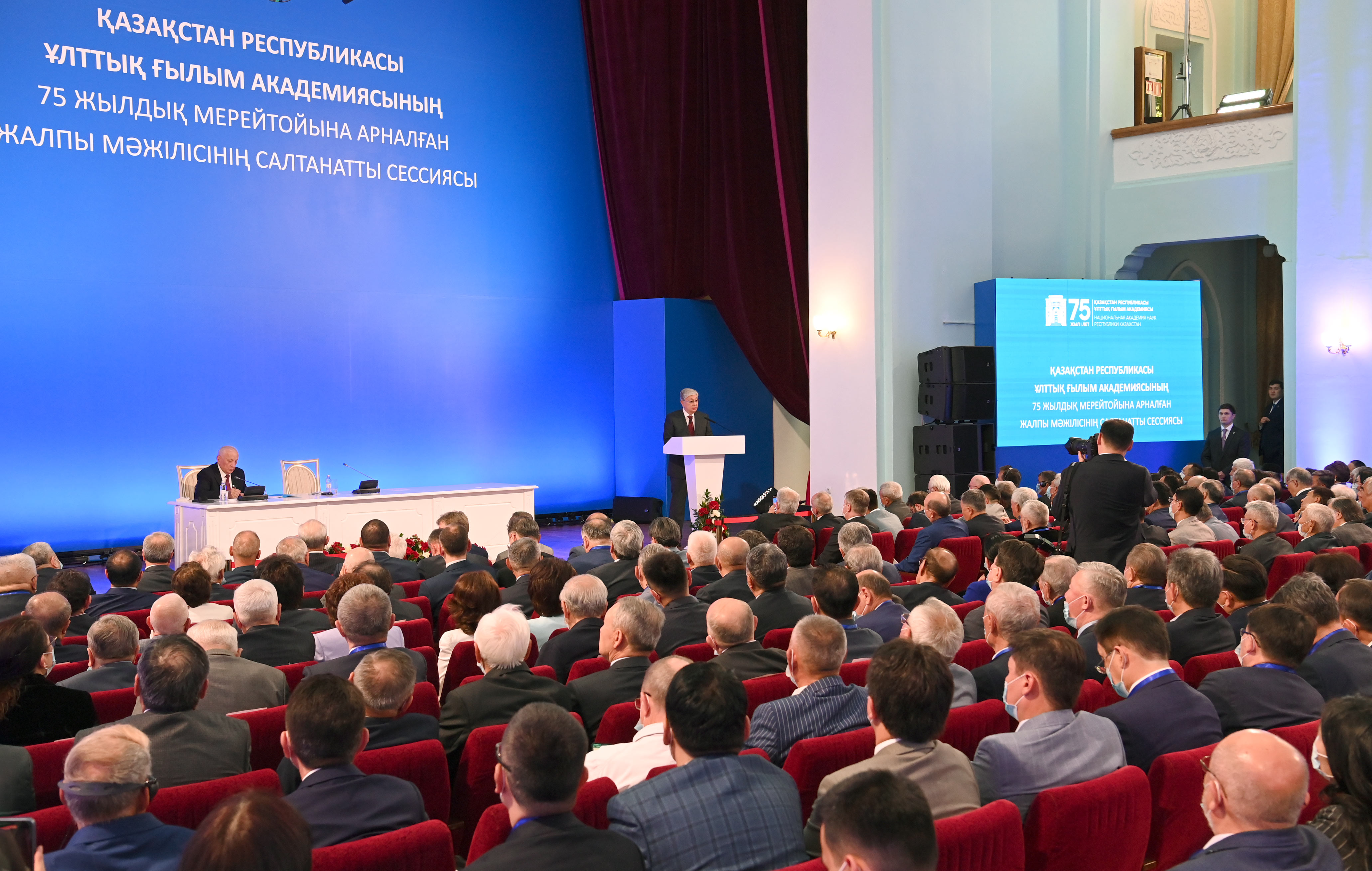 Касым-Жомарт Токаев поздравил участников торжественного собрания с 75-летием НАН, особо отметив роль науки в прогрессе человечества.