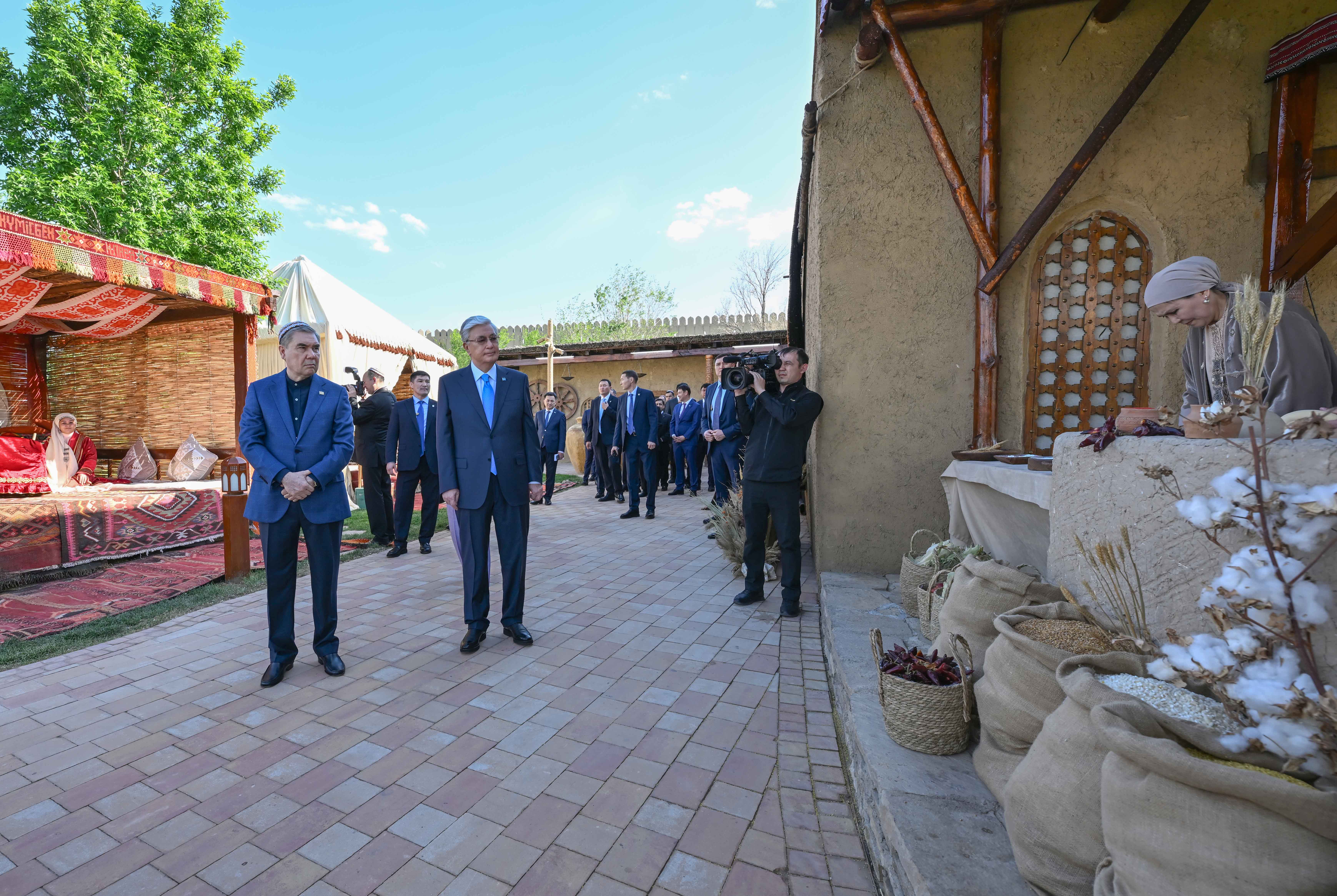 Касым-Жомарт Токаев и Гурбангулы Бердымухамедов осмотрели восточный базар, где были представлены разнообразные виды зерновых культур. Также они ознакомились с национальными блюдами и работами мастеров таких народных ремесел, как деревообработка, ткачество, войлоковаляние, гончарное ремесло и ювелирное искусство.