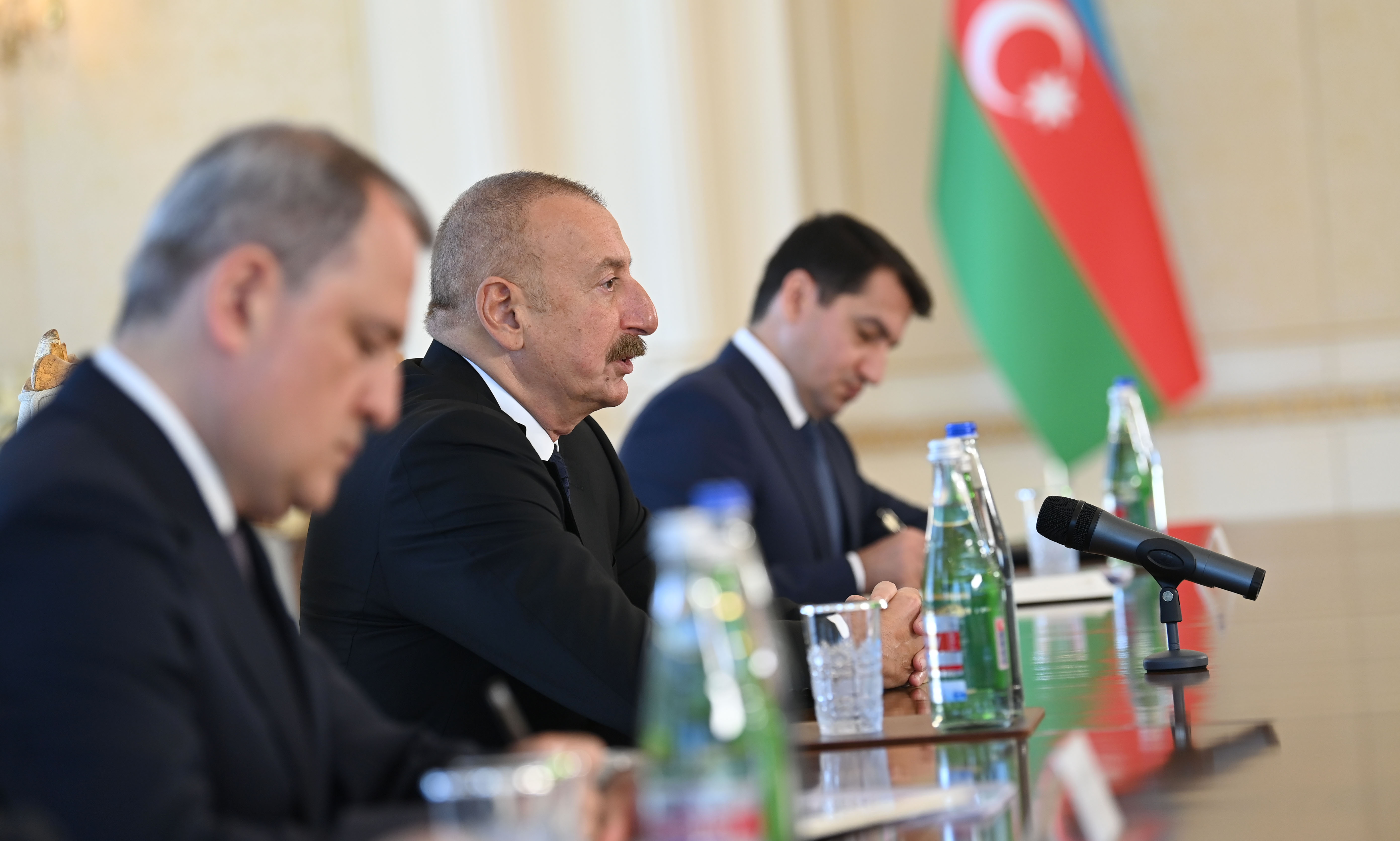 – Уважаемый Касым-Жомарт Кемелевич, еще раз от всей души хочу Вас приветствовать, сказать – добро пожаловать. Хотел бы выразить благодарность за то, что Вы приняли приглашение и посещаете нас с официальным визитом, который, я уверен, будут иметь большое значение для будущего развития наших отношений. В первую очередь, хотел бы еще раз в присутствии делегаций поблагодарить за награждение меня высшим орденом Республики Казахстан «Алтын Қыран». Для меня большая честь удостоиться этой награды. Я рассматриваю это как свидетельство дружбы и братства наших народов и высокую оценку тому, что Азербайджан делает в плане укрепления наших отношений. Также только что была сделана презентация дара Казахстана Азербайджану – центра творческого развития детей, который будет построен на освобожденных территориях. И это еще одно проявление братского отношения к нашему народу, вклад в дело восстановления Карабаха, – подчеркнул Президент Азербайджана.