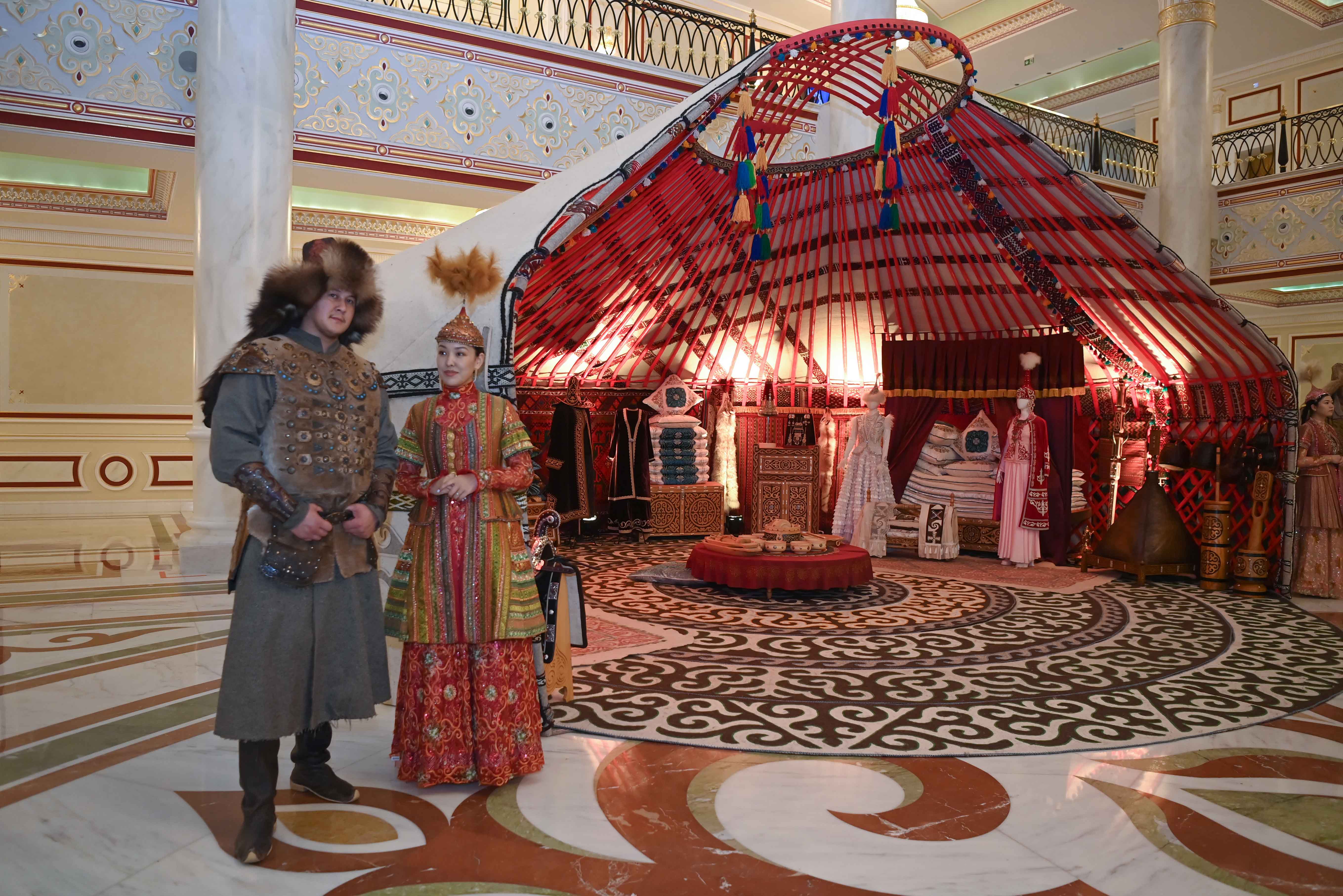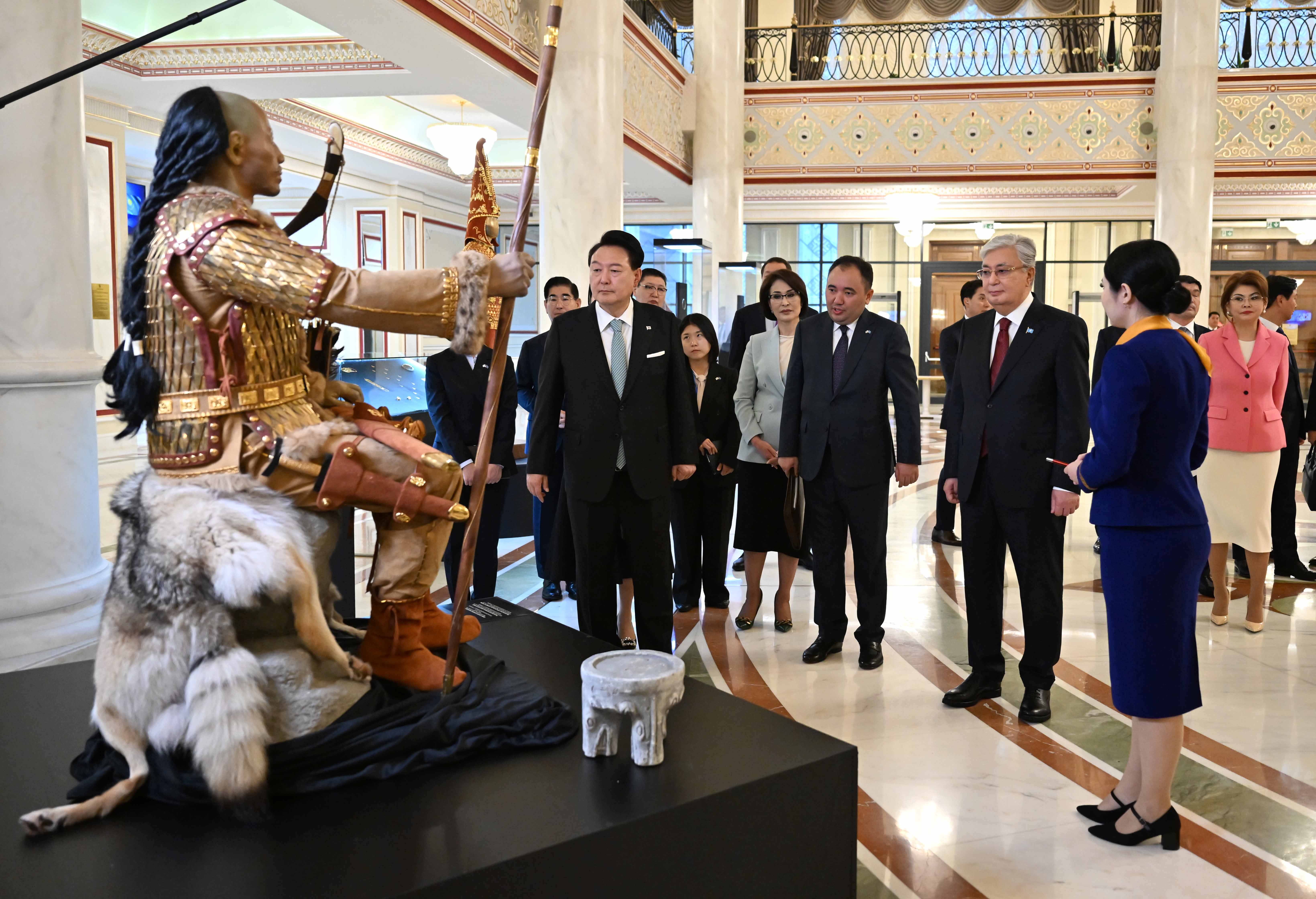 Перед началом мероприятия лидеры двух стран посетили выставку «Ұлы дала алтыны» («Золото Великой степи»), организованную в фойе Казахского национального музыкально-драматического театра имени Калибека Куанышбаева.