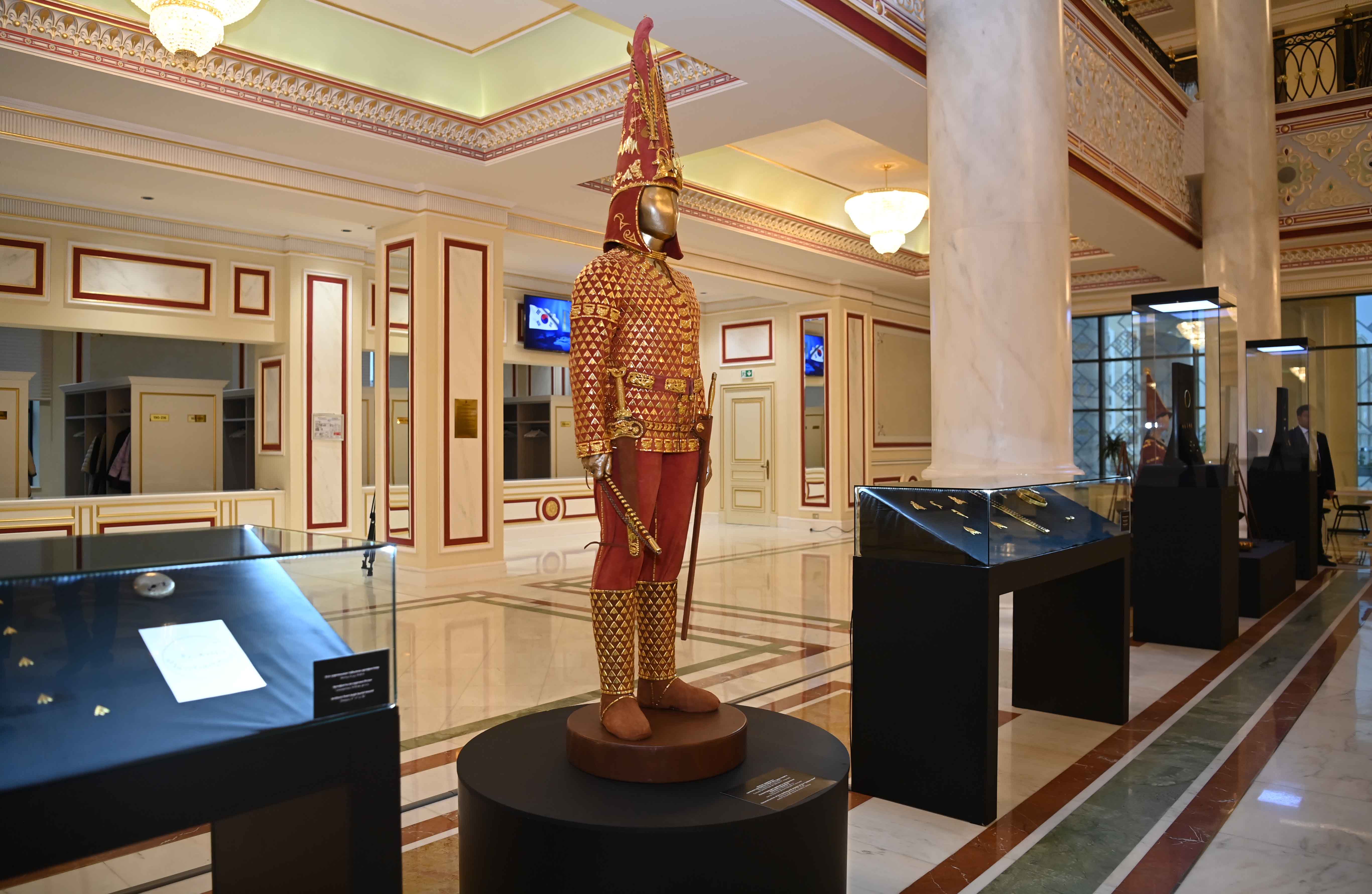 Президентам были представлены исторические артефакты из золота. Главными экспонатами выставки стали реконструированные одежда и оружие «Золотого человека», найденного при раскопках Иссыкского кургана.