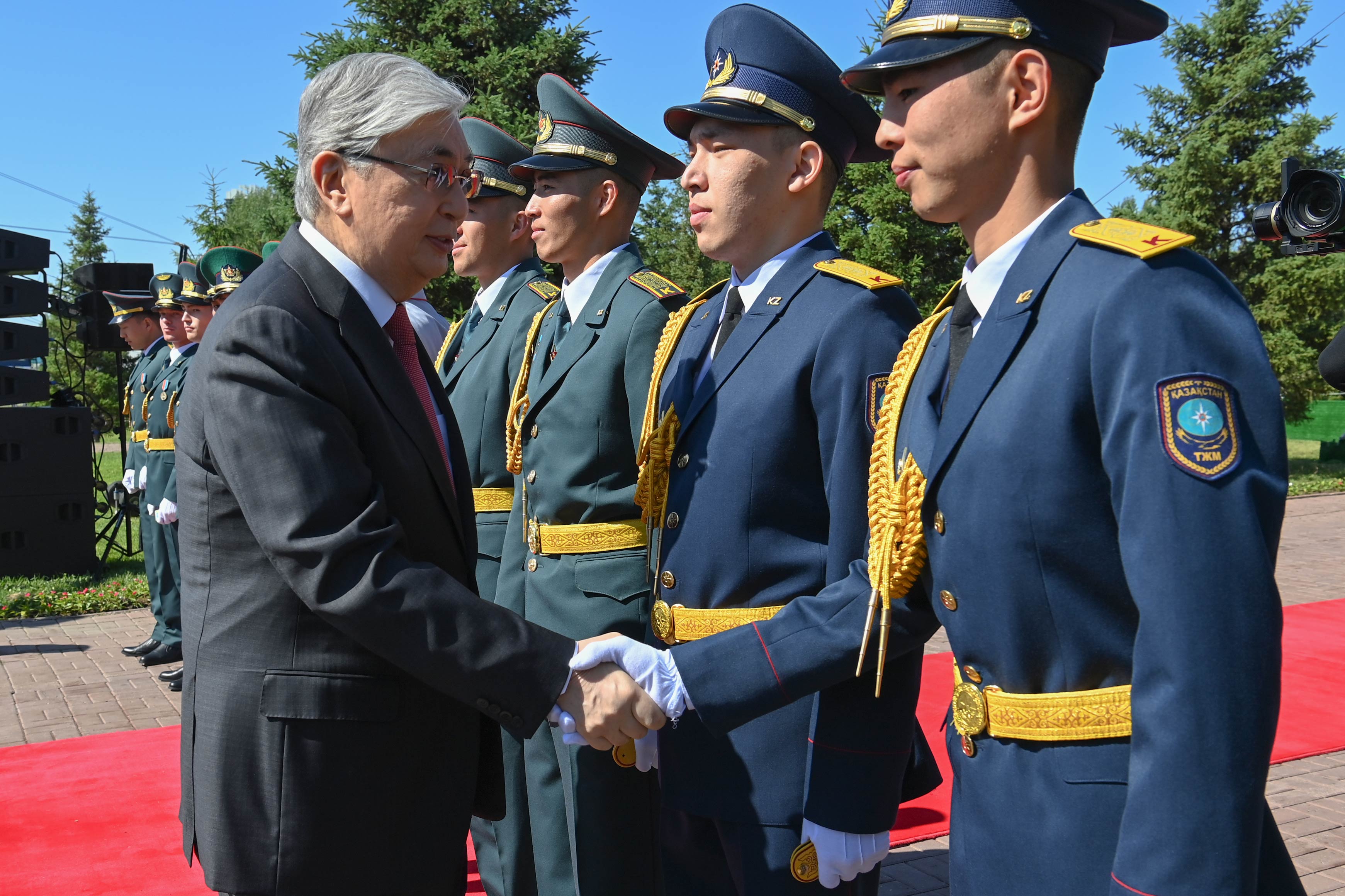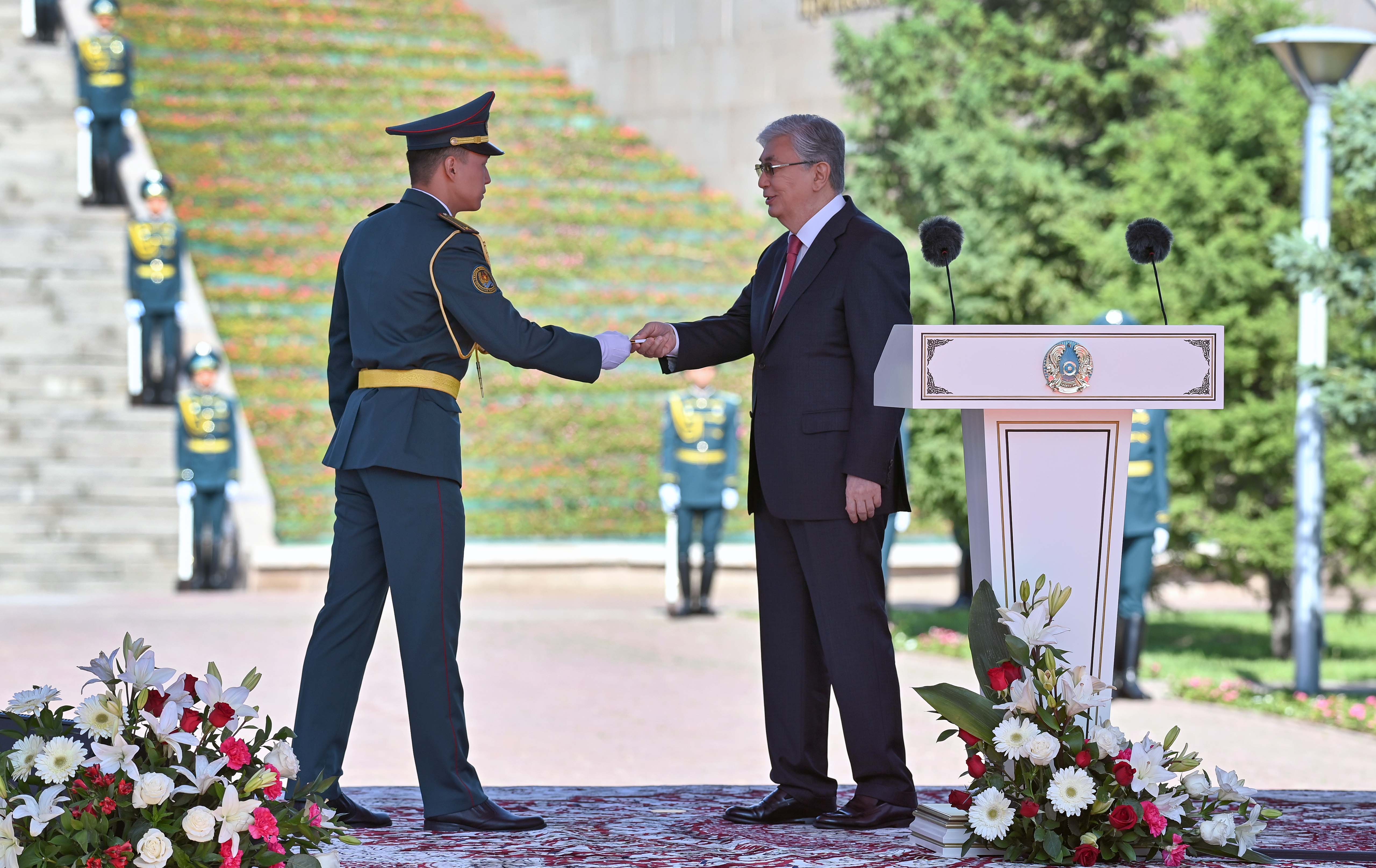 В завершение своей речи Касым-Жомарт Токаев напомнил, что стало доброй традицией присвоение офицерских званий лучшим курсантам в рамках церемонии торжественного поднятия флага.