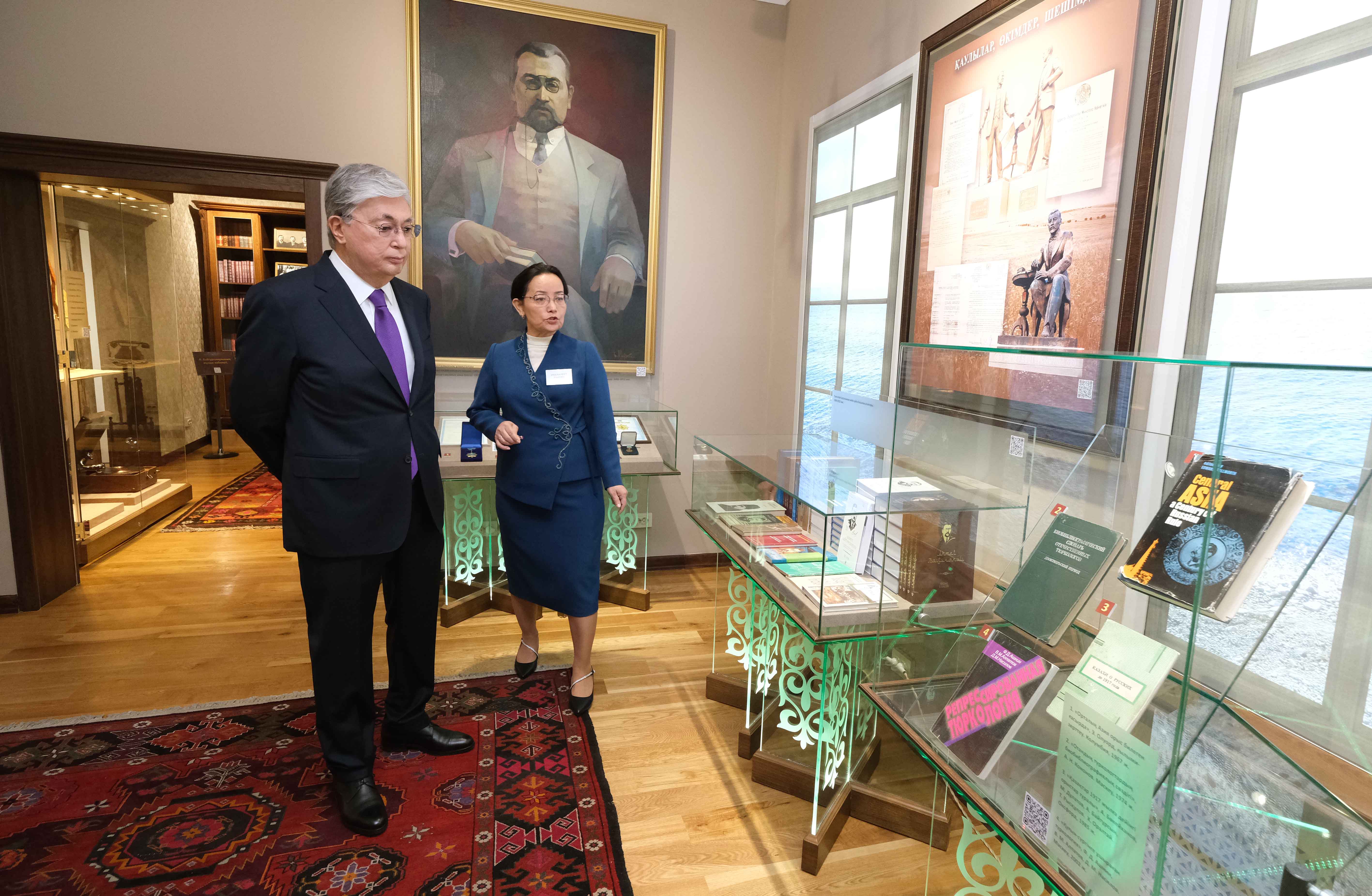 Президент ознакомился с экспозицией залов «Ұлттық рухтың ұлы тіні», «Қазақ санасының шамшырағы» и рабочим кабинетом Ахмета Байтурсынова. Всего в музее собрано около 500 экспонатов, связанных с жизнью и творчеством великого деятеля.