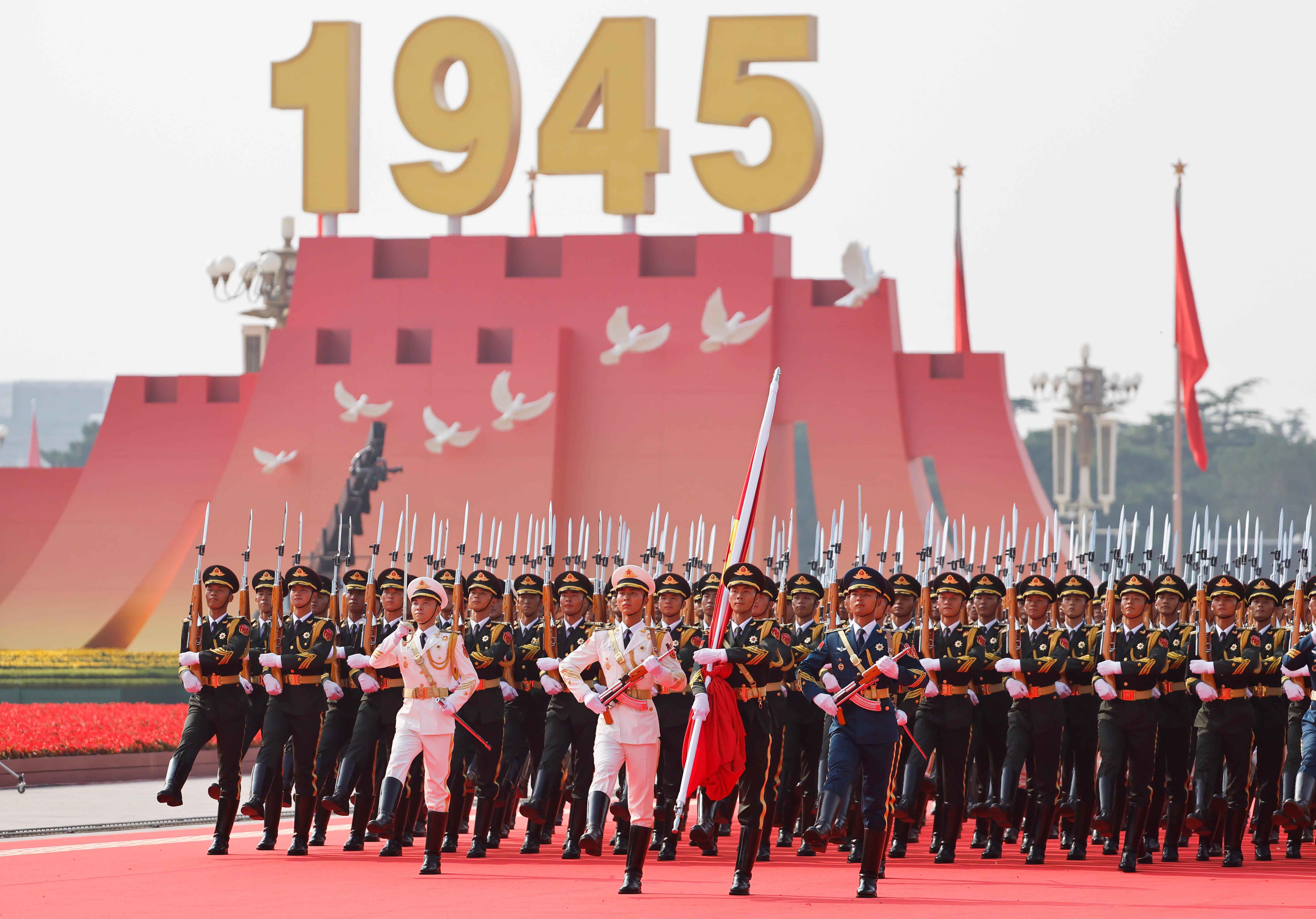 В параде приняли участие 45 расчетов Народно-освободительной армии Китая общей численностью более 10 тыс. военнослужащих. Было задействовано свыше 100 летательных аппаратов и несколько сотен единиц наземной техники.