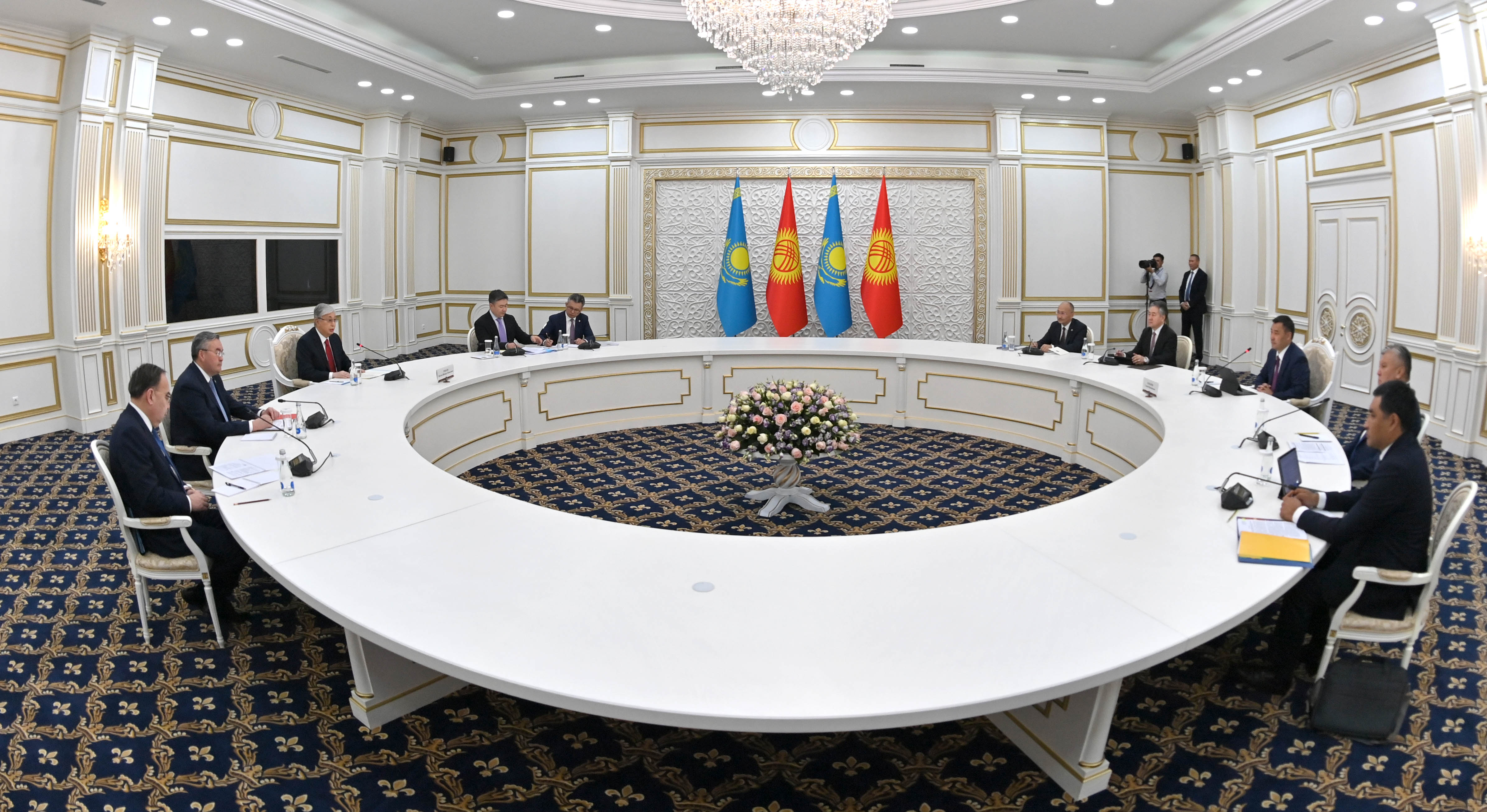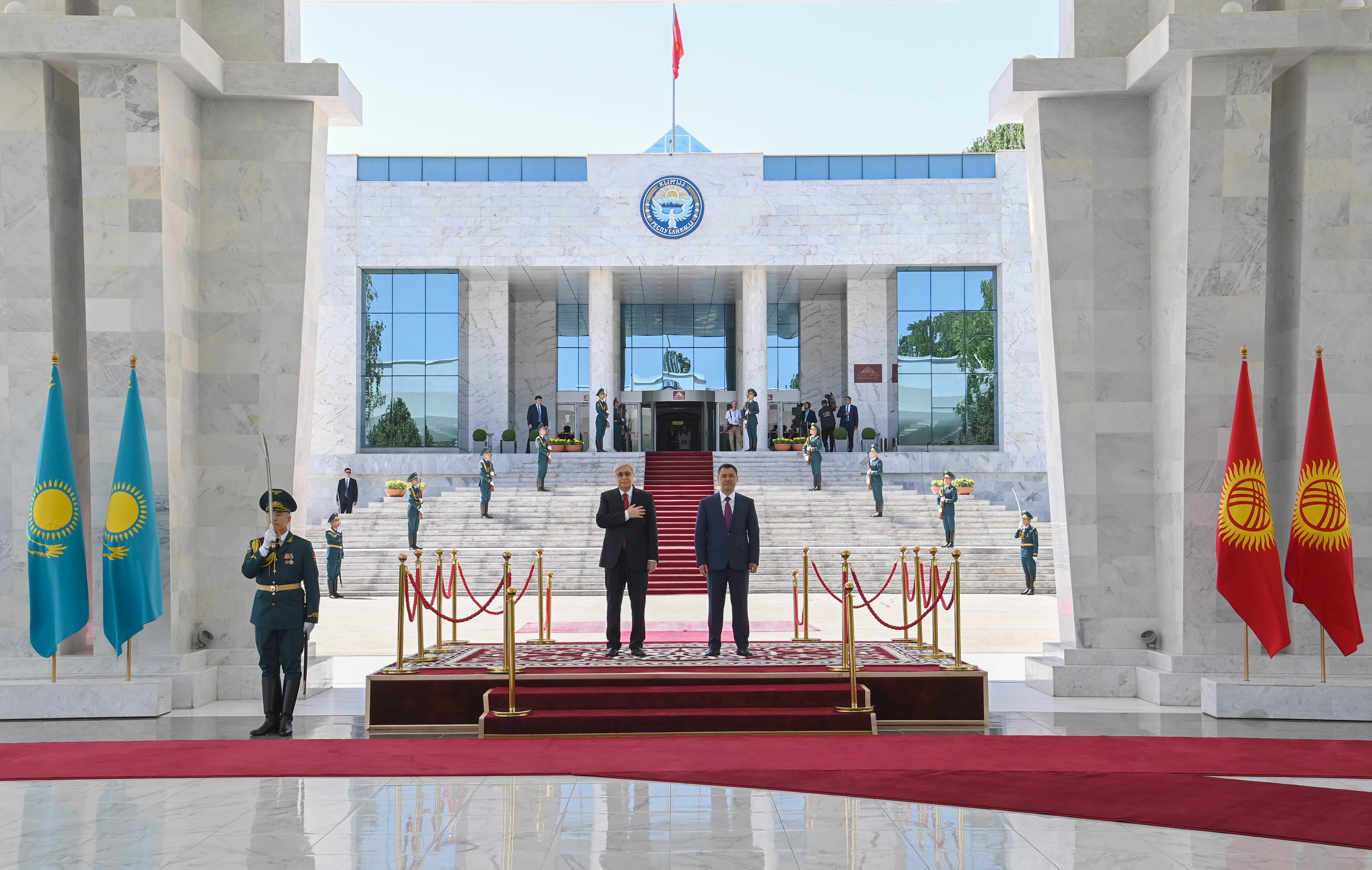 Переговорам предшествовала официальная церемония в мраморном шатре «Ақ кеме» в резиденции Президента Кыргызстана «Ала-арча». Начальник Почетного караула отдал рапорт главам государств. После исполнения гимнов Казахстана и Кыргызстана Касым-Жомарт Токаев и Садыр Жапаров представили друг другу членов официальных делегаций.