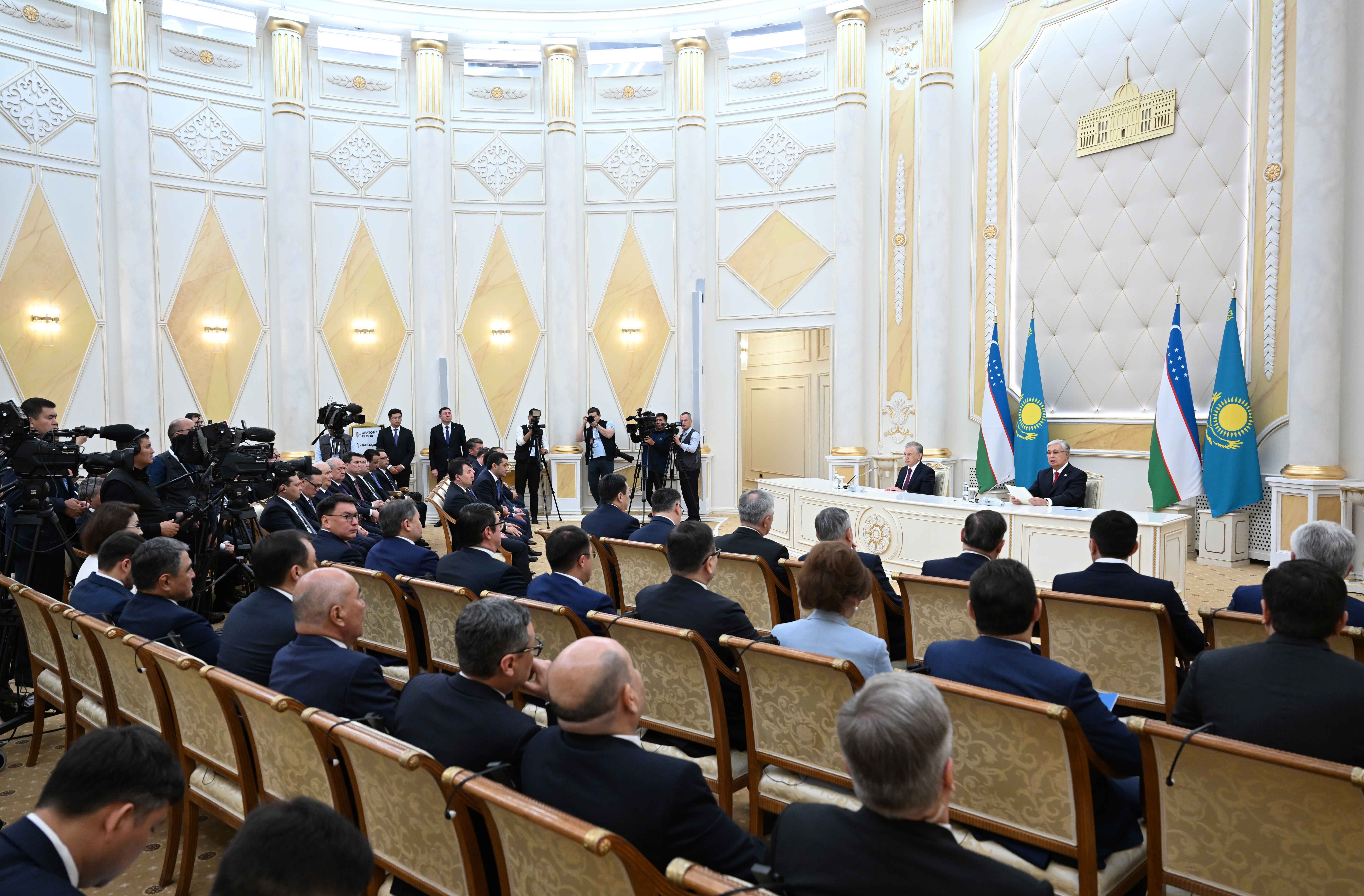 По завершении двусторонних переговоров и заседания Высшего межгосударственного совета Касым-Жомарт Токаев и Шавкат Мирзиёев выступили с совместным заявлением для представителей средств массовой информации.