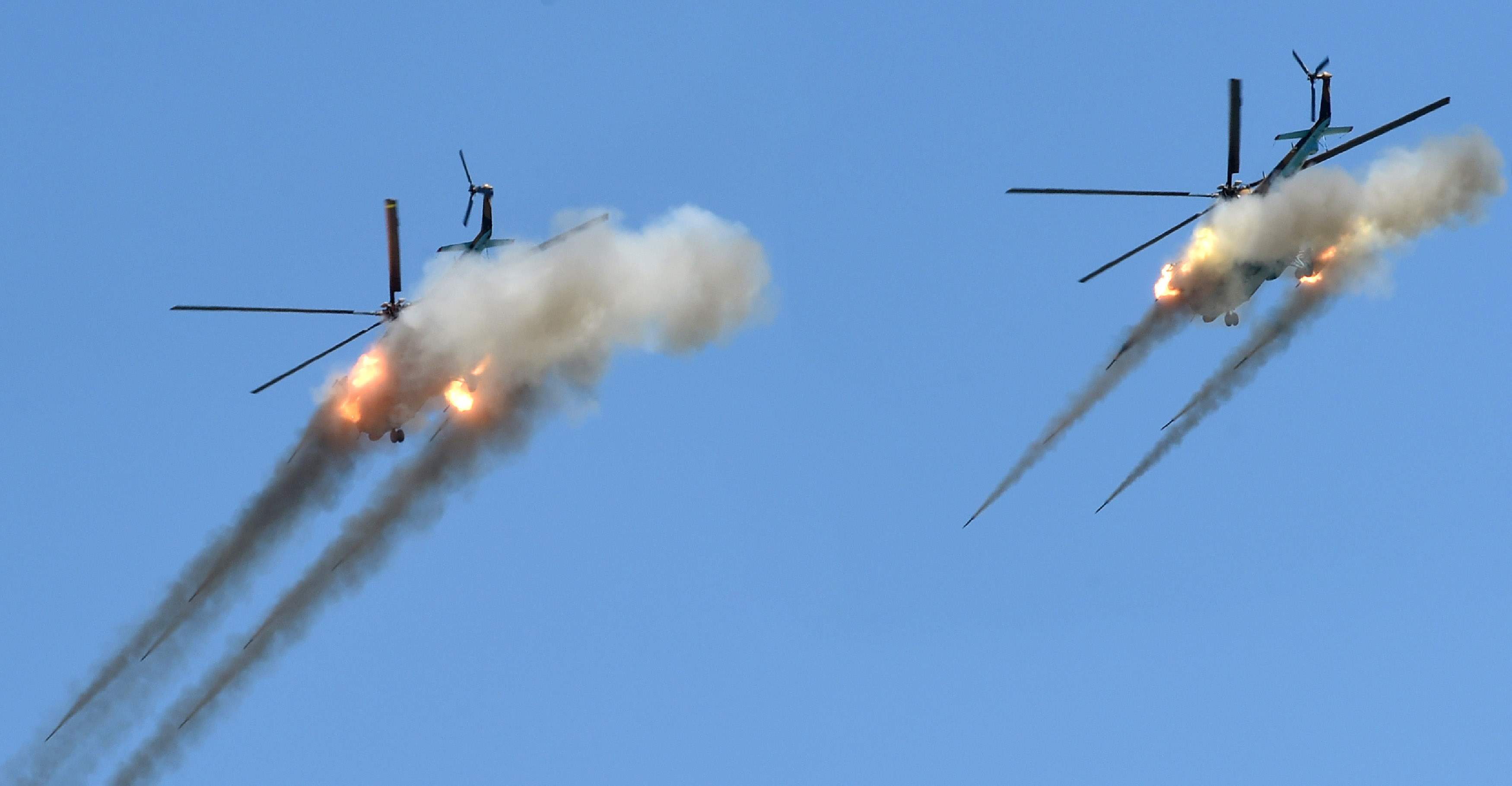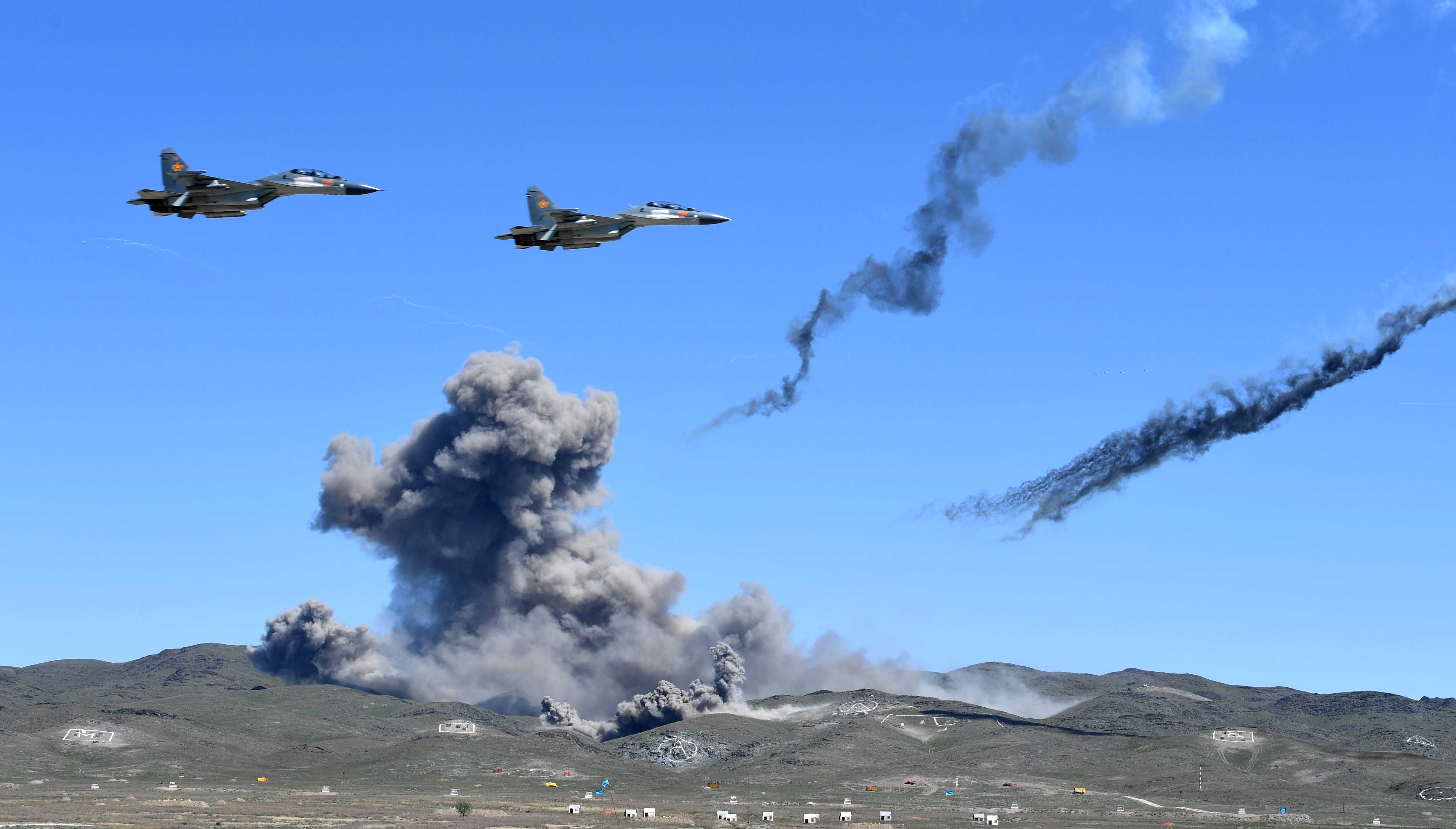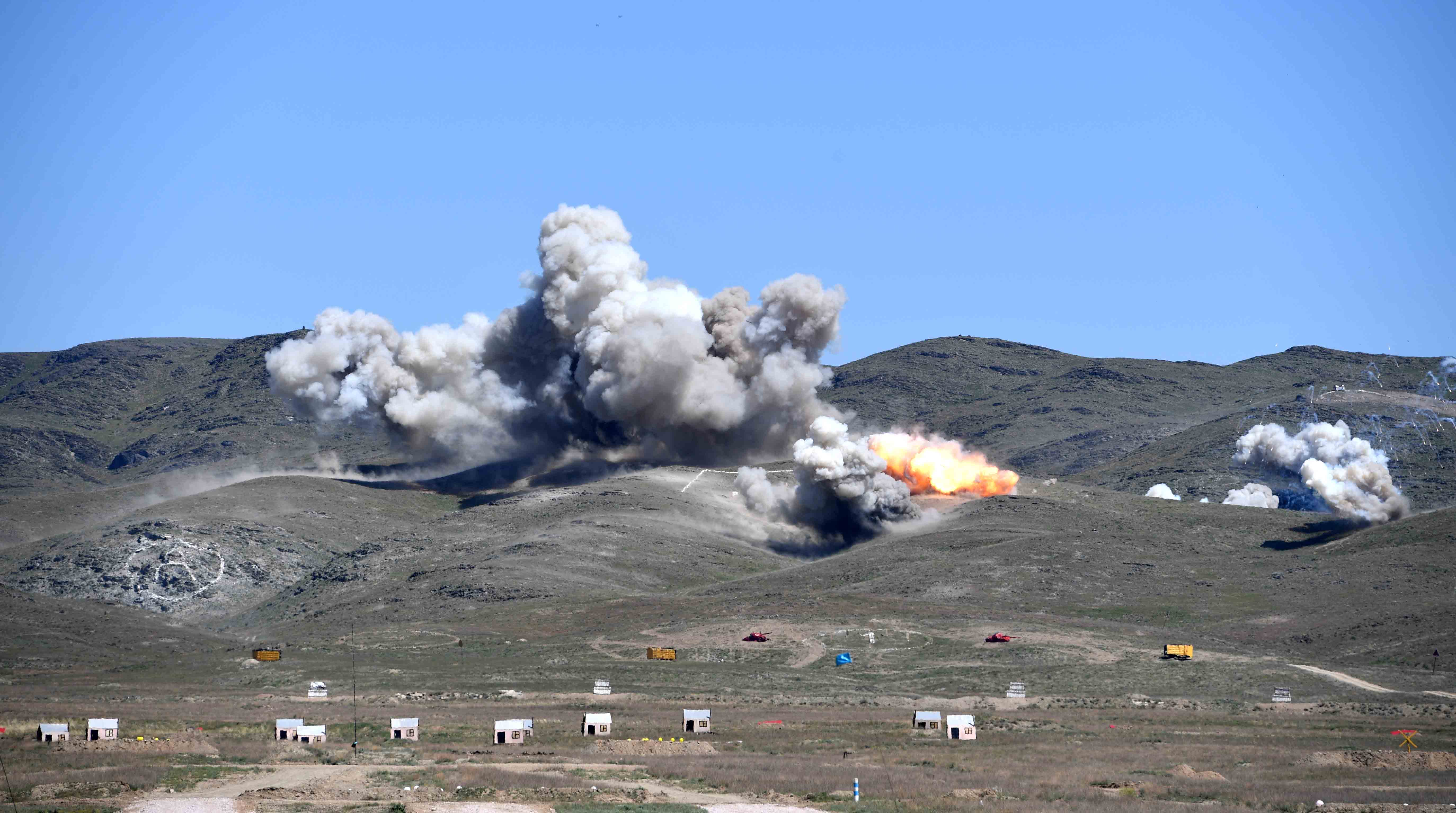 During the execution of tactical episodes on the destruction of the conventional base of illegal armed formations, the capabilities of the missile and artillery weapons were demonstrated: the Tochka-U tactical missile systems, Grad rocket launcher and Prima rocket launchers, MSTA-B and D-30 howitzer, Solntsepek heavy flamethrower systems, Shturm-S anti-tank missile system, etc. Ground forces and troops of the Air Defence Forces fired real rocket launches, bombing, combat firing from all types of weapons. Aircraft and helicopters of the front and army aviation of the Air Force conducted an air battle in the sky. Zhetysu Barysy aerobatic team showed aerobatics figures.