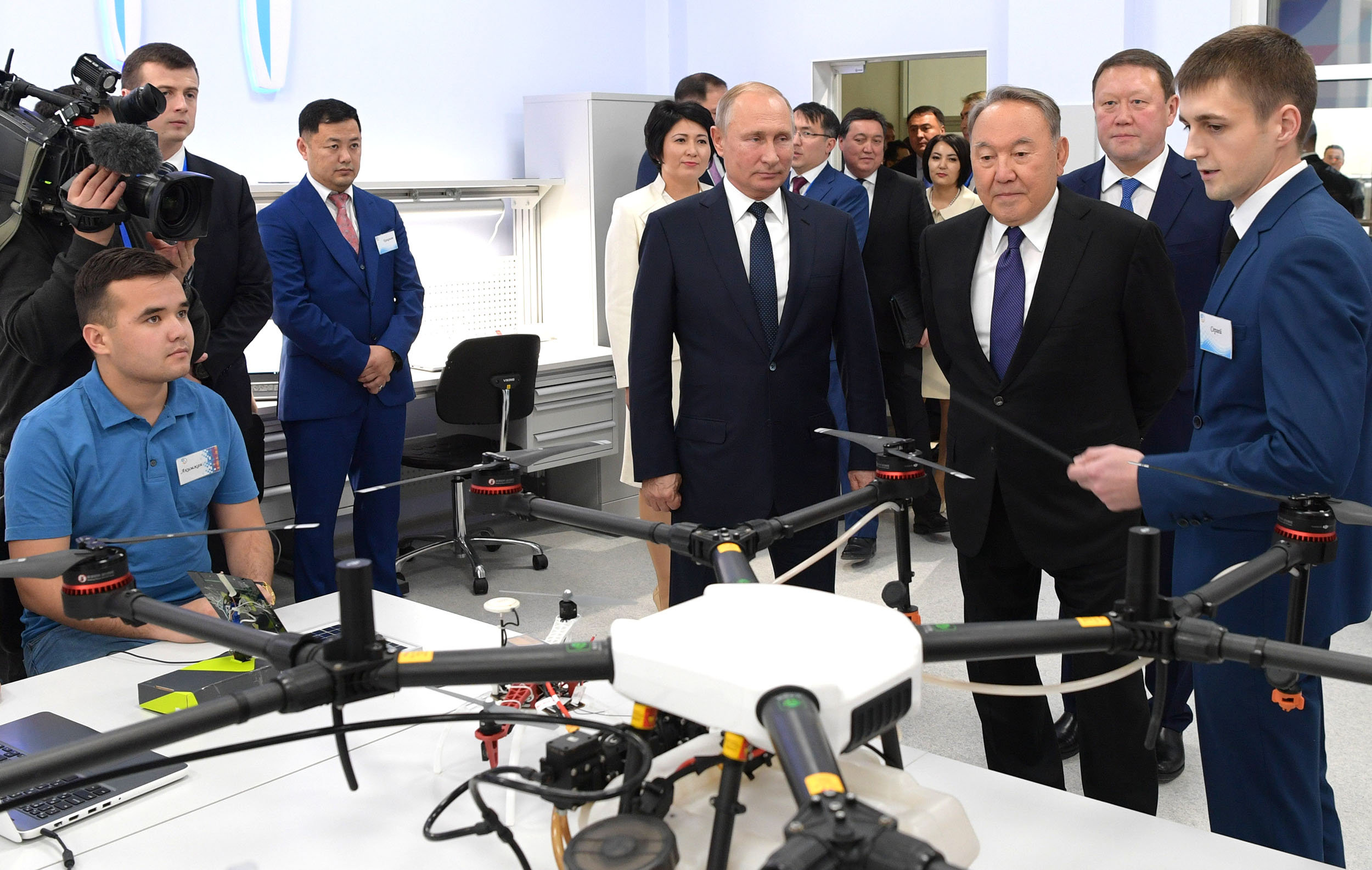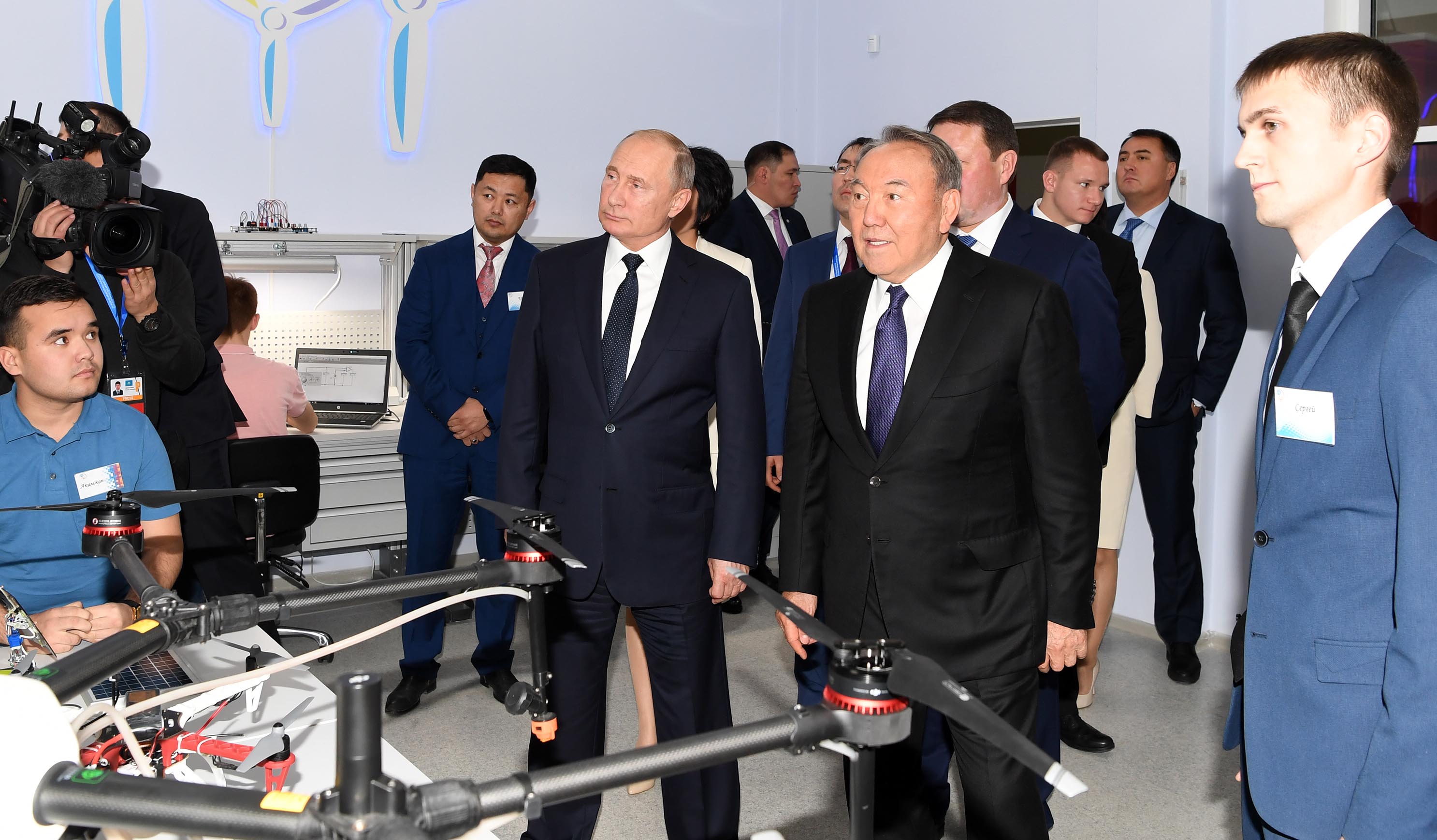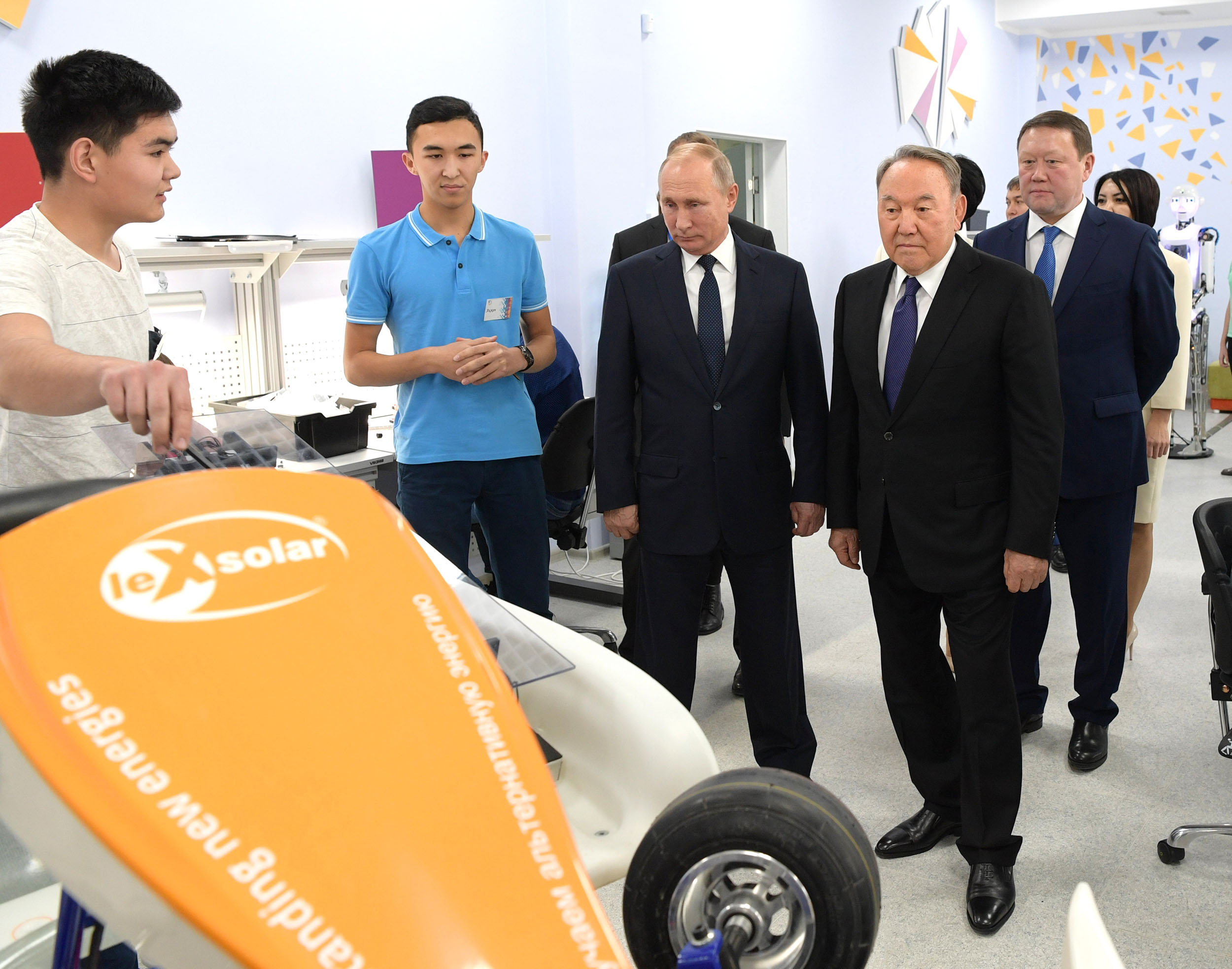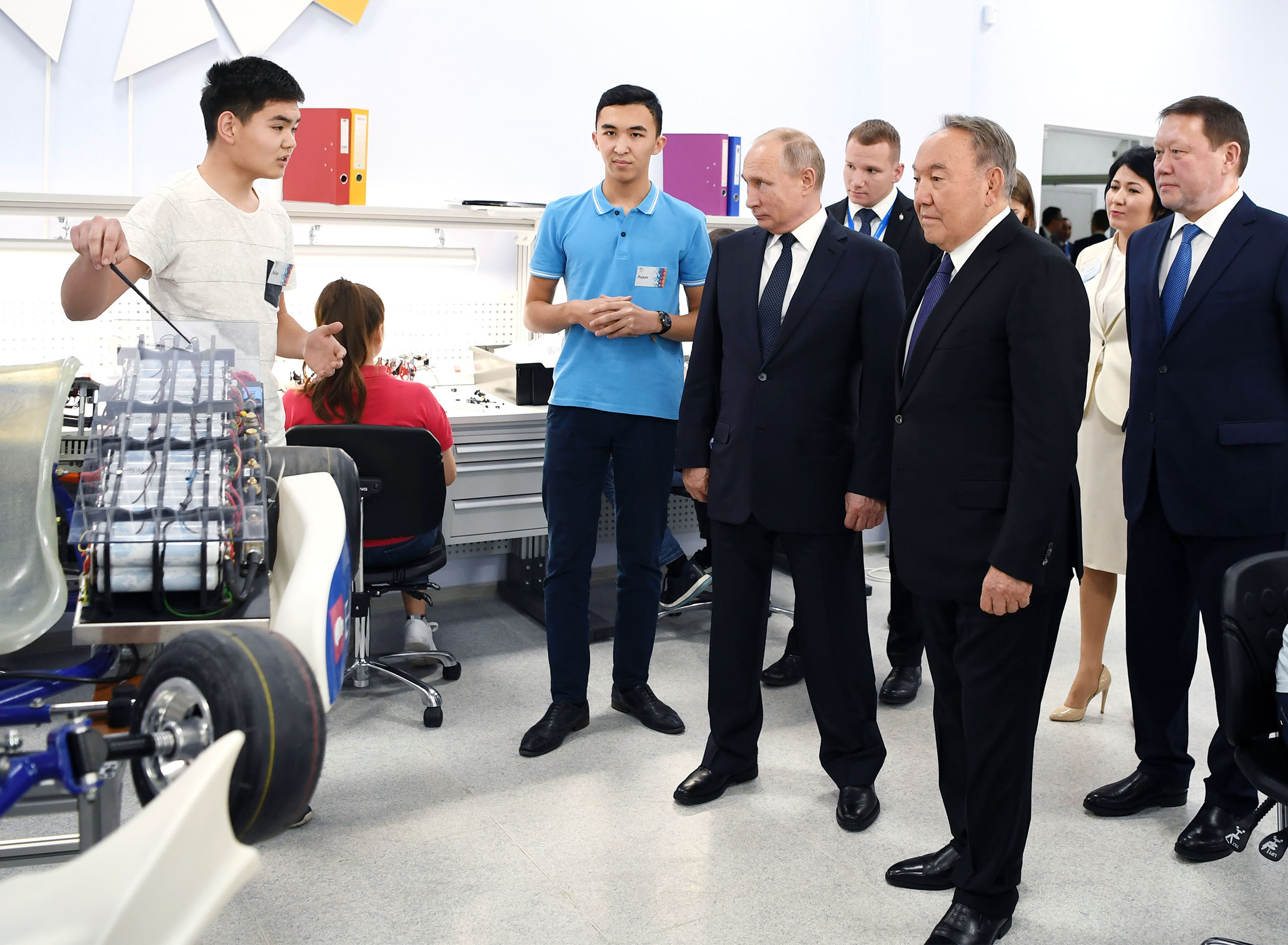 At the close of the Cross-Border Cooperation Forum, the presidents of Kazakhstan and Russia surveyed the classrooms and laboratories, which use innovative technologies in the educational process. The two leaders also got acquainted with the students' works and talked with the schoolchildren.