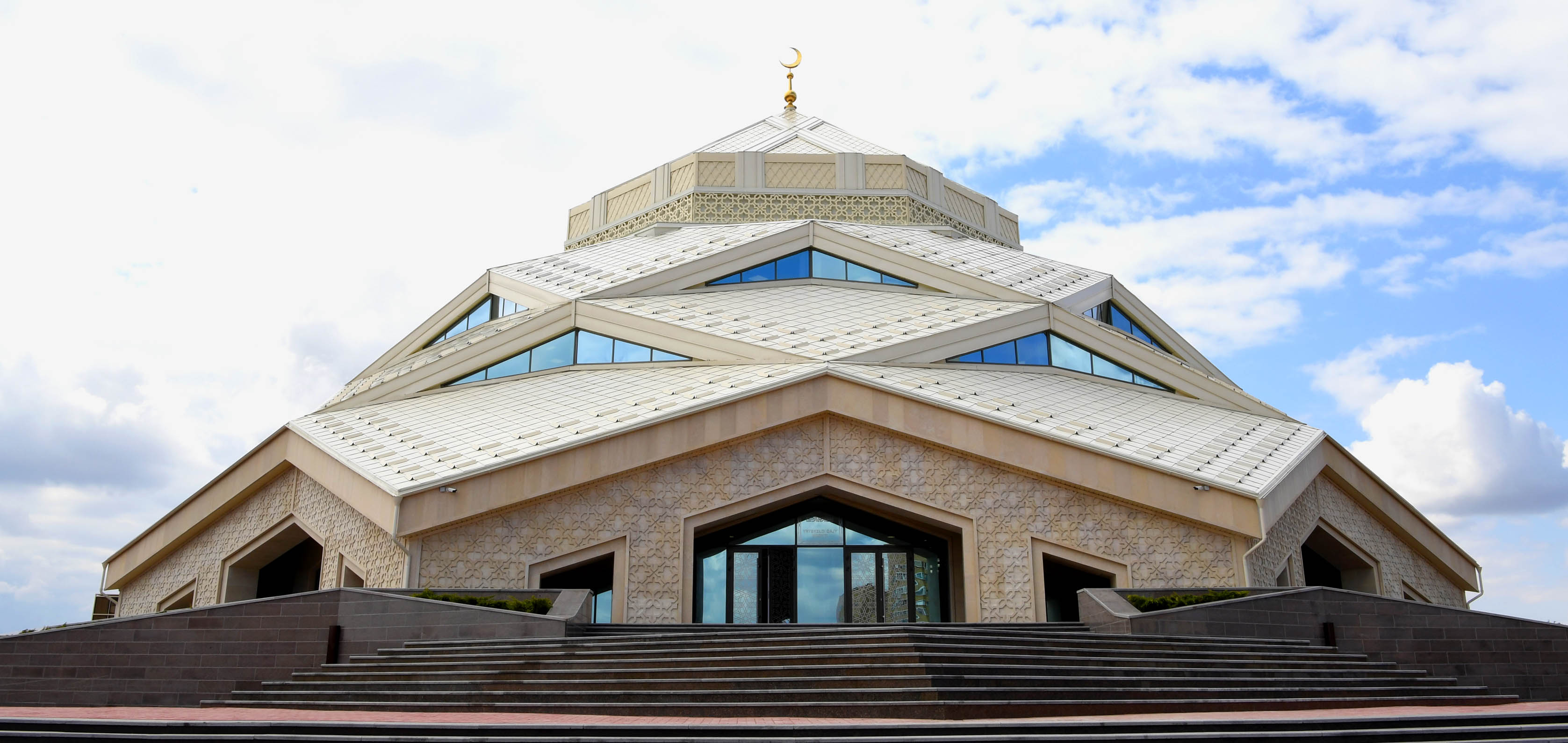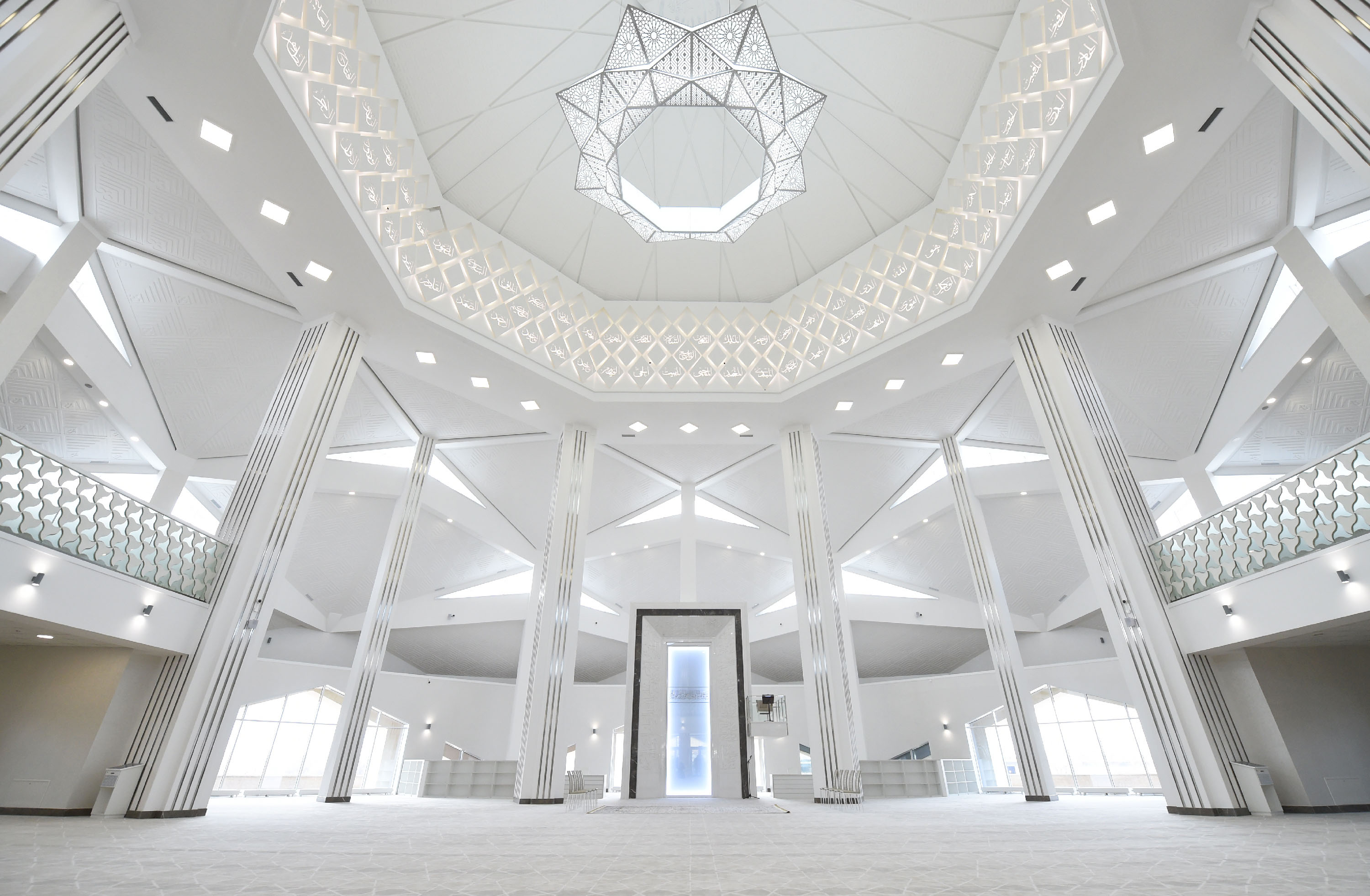 The construction of the mosque on the right bank of the Ishim River started in 2016. The new mosque was built at the expense of charitable means. The building is made in the style of postmodernism, using traditional ornaments and decorative elements. The main building has a complex, hemispherical shape, consisting of triangular inclined planes, culminating in a dome, with a diameter of 26 meters. Externally, the mosque’s design resembles a flower and a diamond at the same time.