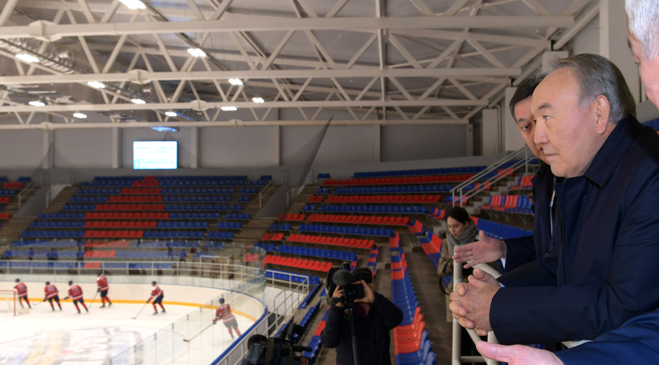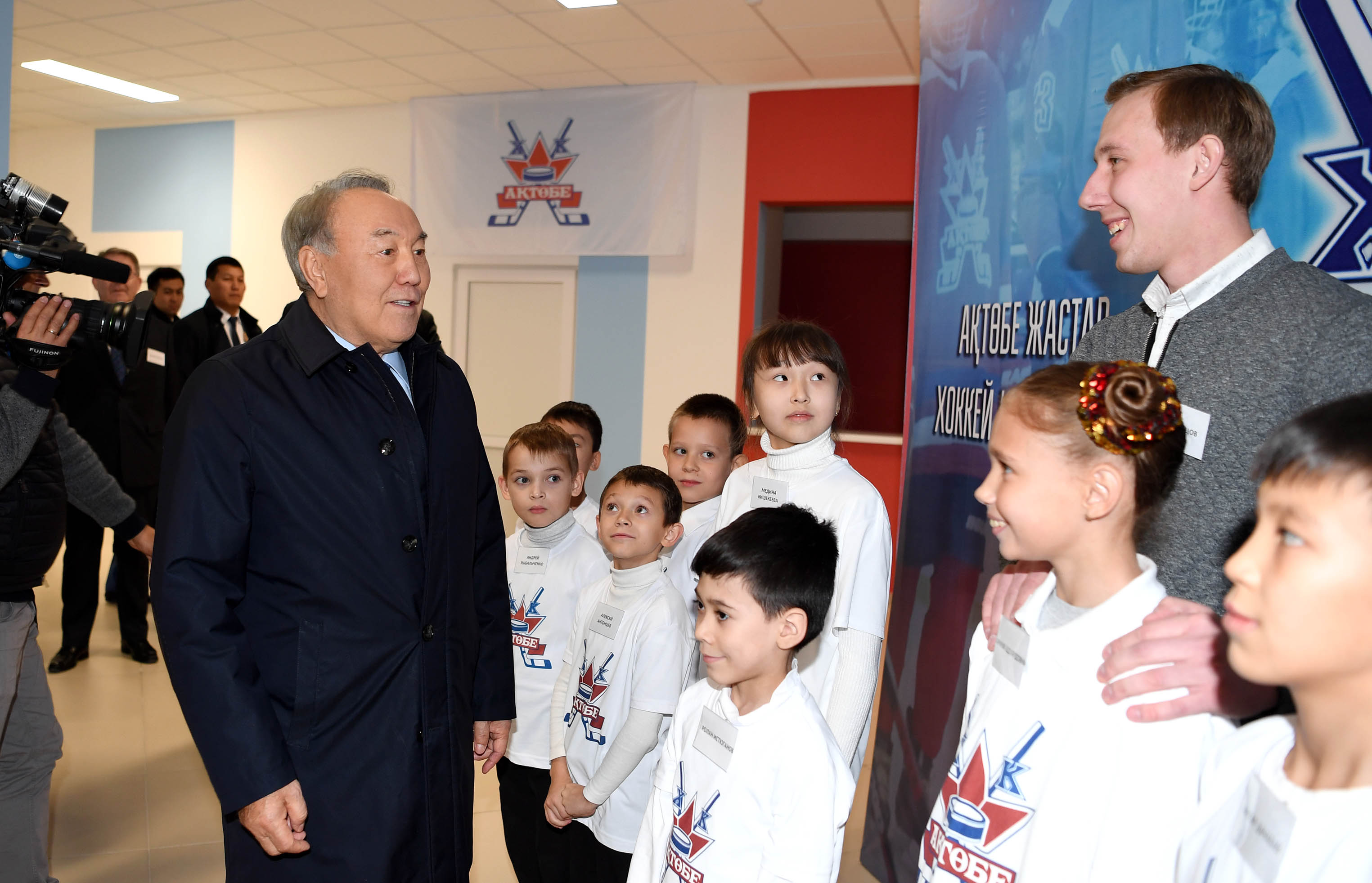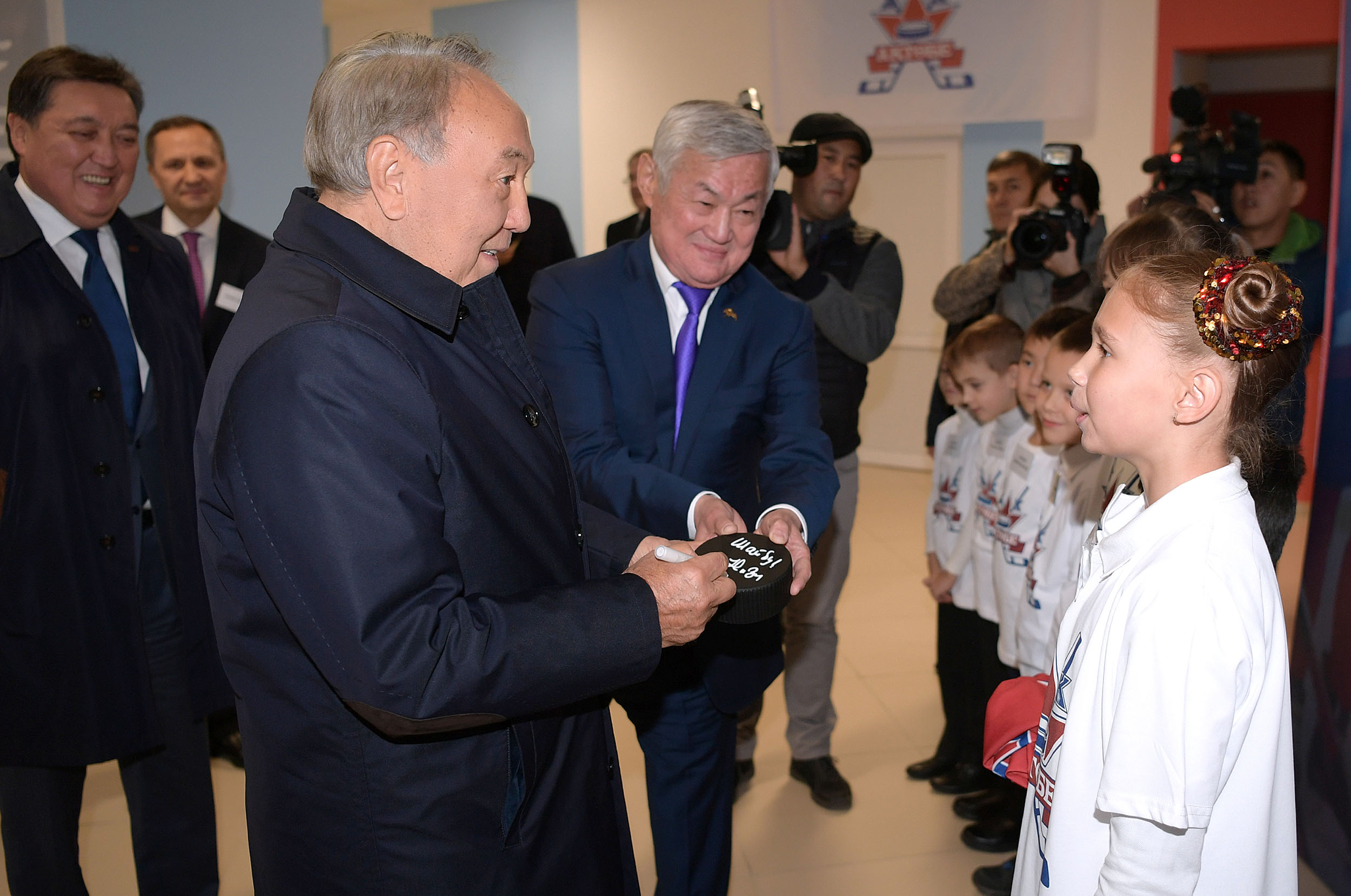Nursultan Nazarbayev congratulated young hockey players, and in their face all Aktobe residents with the opening of the Ice Palace and made a memorable inscription on a symbolic puck.