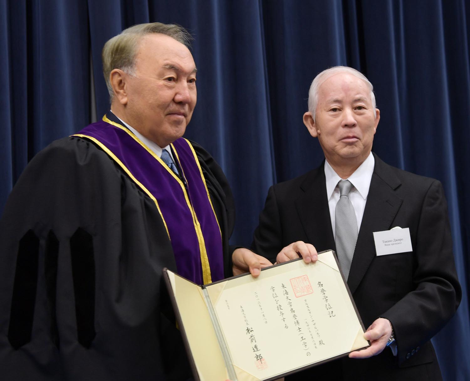 Tokai University Rector Yamada Kiyoshi emphasized that Nursultan Nazarbayev has been awarded the diploma and medal of Doctor for his contribution to Kazakhstan’s modernization for the period of its independence, as well as the development of scientific and educational services in accordance with international standards.