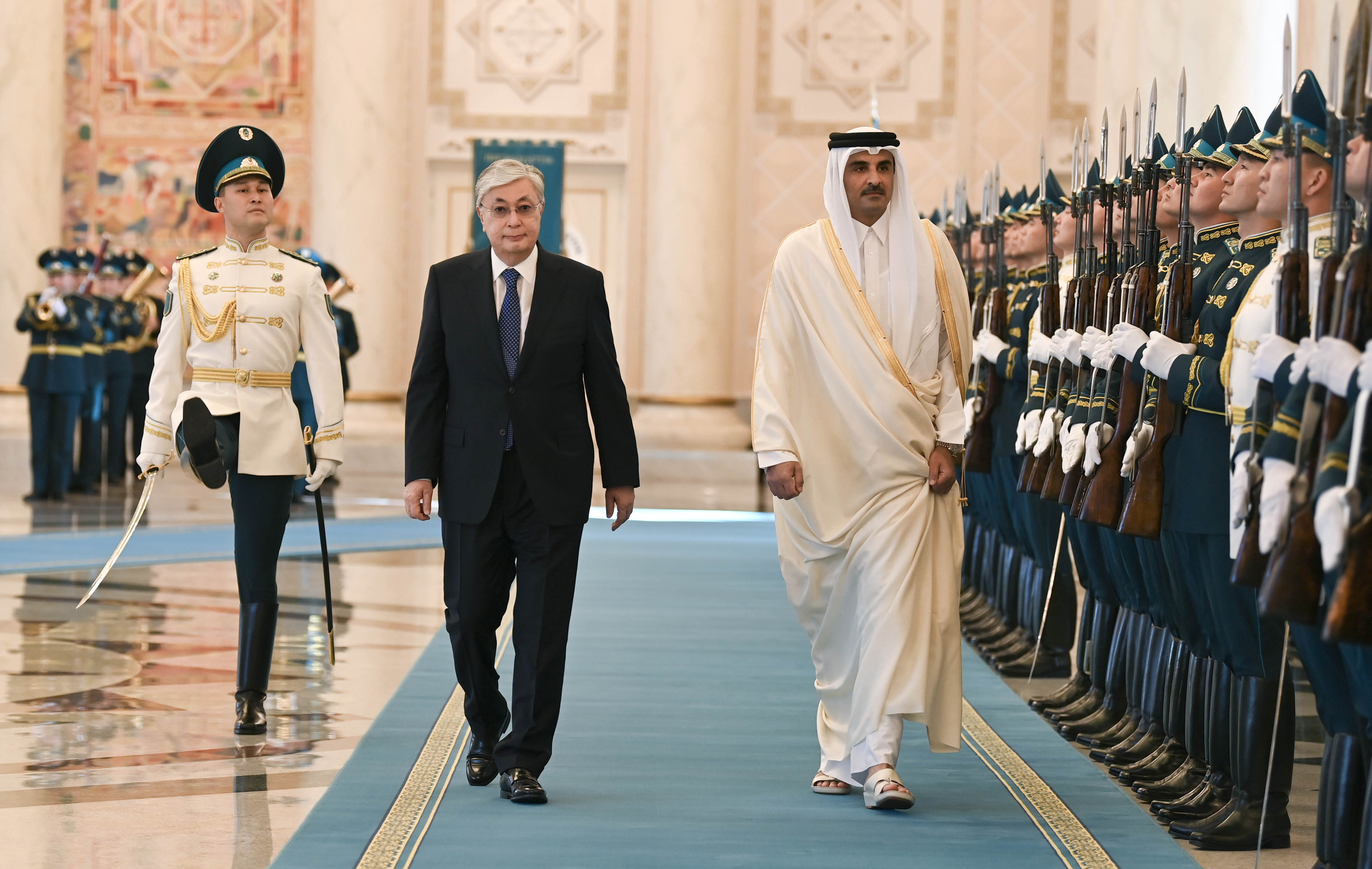 The talks were preceded by an official welcoming ceremony for the Amir of Qatar at the Akorda residence. After the national anthems of the two countries were played, the Head of the Honor guard company gave a welcome report to the presidents of Kazakhstan and Qatar, and then the leaders proceeded to the “Eastern hall” for the meeting in the narrow format.