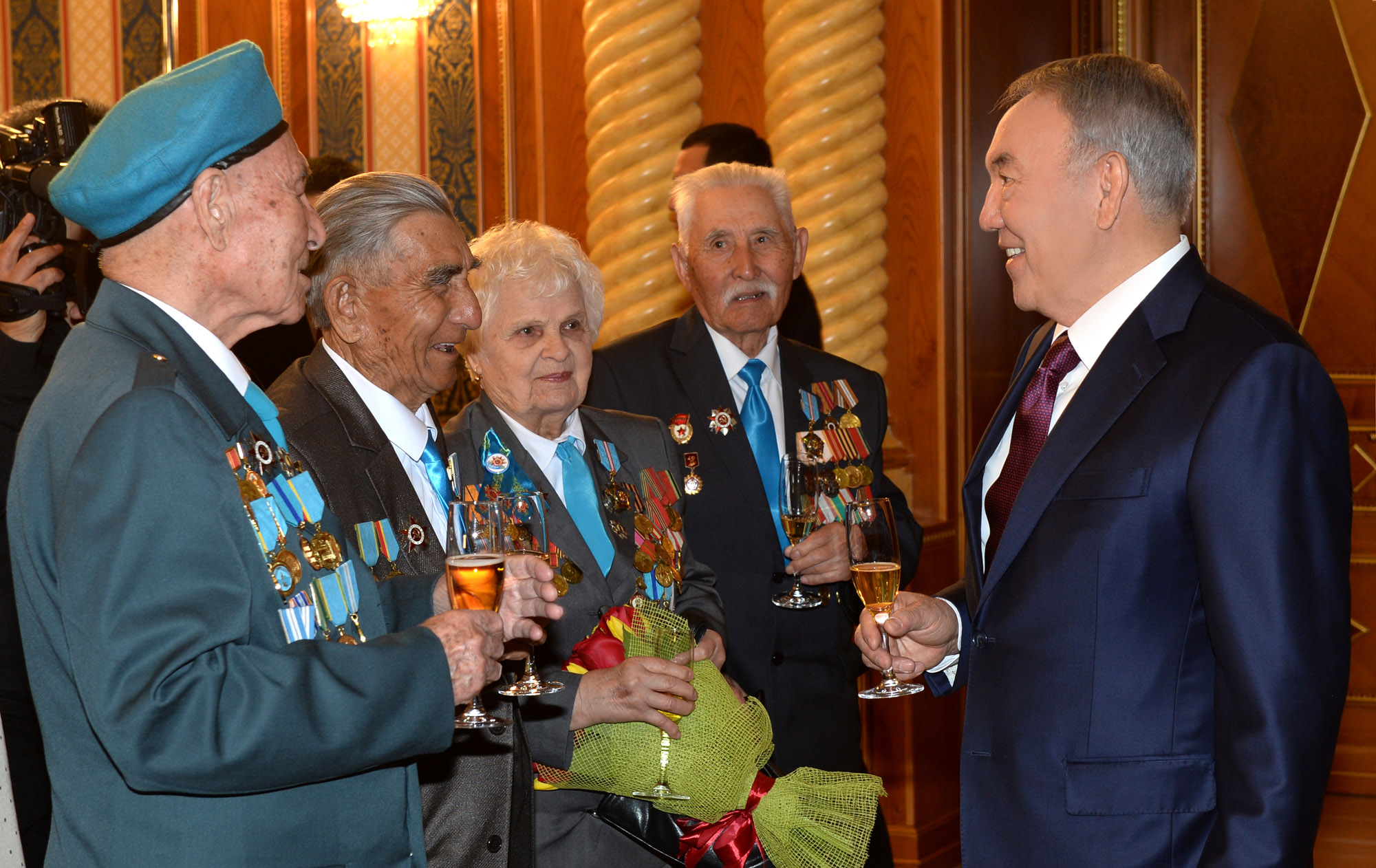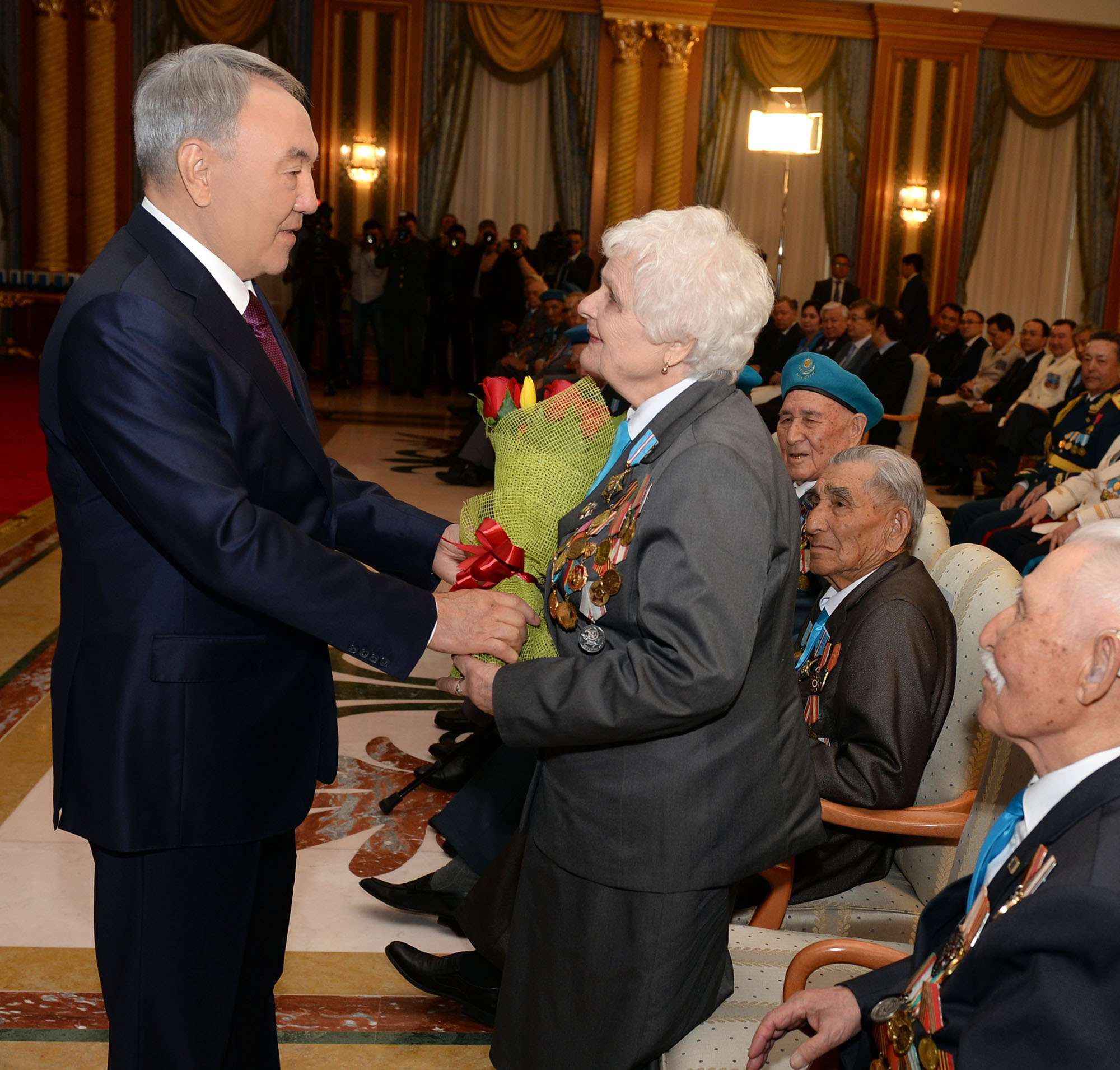 – Бүгін оған елдің бостандығы мен бейбіт өмірін қорғап қалған ардагерлер қатысып отыр. Біз сіздерге «Барыс» және «Құрмет» ордендерін тапсырамыз. Бұл – бүгінгі ұрпақ сіздерге ұсына алатын сый-құрметтің титтей бір бөлшегі ғана. Бүкіл ел, бүкіл әлем фашизмнен қорғап қалғандарыңыз үшін сіздерге борыштар. Ардагерлерді марапаттау үзілмес ұрпақ сабақтастығын айғақтайды. Сіздердің майдан даласы мен бейбіт өмірдегі ерліктеріңіз әрдайым батырлық пен патриотизм үлгісі болып қала бермек. Ұлы Жеңіске қол жеткізгендердің барлығы үшін ең үздік марапат – тәуелсіз Қазақстан, өркендеу үстіндегі еліміз, азаматтарымыздың бақуат өмірі. Бұл сіздердің ерліктеріңіздің бекер кетпегенін дәлелдейді. Бүгінде сіздердің істеріңізді қазақстандықтардың жаңа ұрпағы табысты жалғастыруда. Ел олардың да еңбегін бағалайды, – деді Нұрсұлтан Назарбаев.