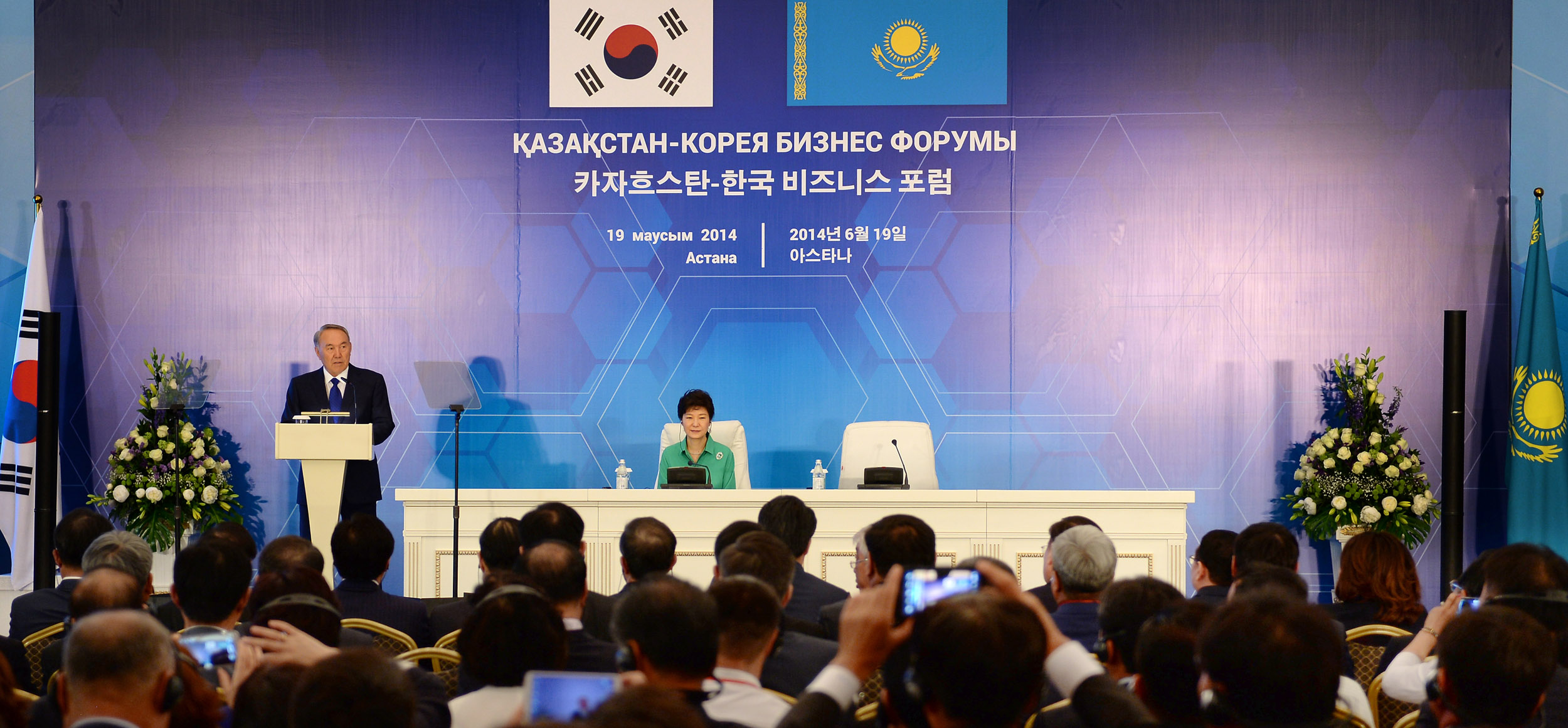 – Былтырғы қазан айында мен «Еуразиялық бастама» тұжырымдамасын ұсындым, оның мақсаты – Еуразияны біріктіру және оны бүкіл халықаралық қоғамдастықтың өсіп-өркендеу орталығы ретінде дамыту. Қазақстан Еуразияның дәл орталығында БРИКС елдерімен, соның ішінде Ресей, Үндістан және Қытаймен іргелес орналасқан, сондықтан ол Еуропа мен Азия арасын жалғастырушы буын қызметін атқарады. Қазақстан мен Корея әртүрлі салалардағы бірлескен жобаларды ілгерілете отырып, ортақ күш-жігер арқылы бейбіт әрі өркендеген Еуразия дәуірінің басталуында негізгі рөл атқаратын болады деп үміттенемін. Кәсіпкерлерден осы мақсаттың жүзеге асырылуына бірлесе күш-жігер жұмсауды өтінемін, – деді Пак Кын Хе.