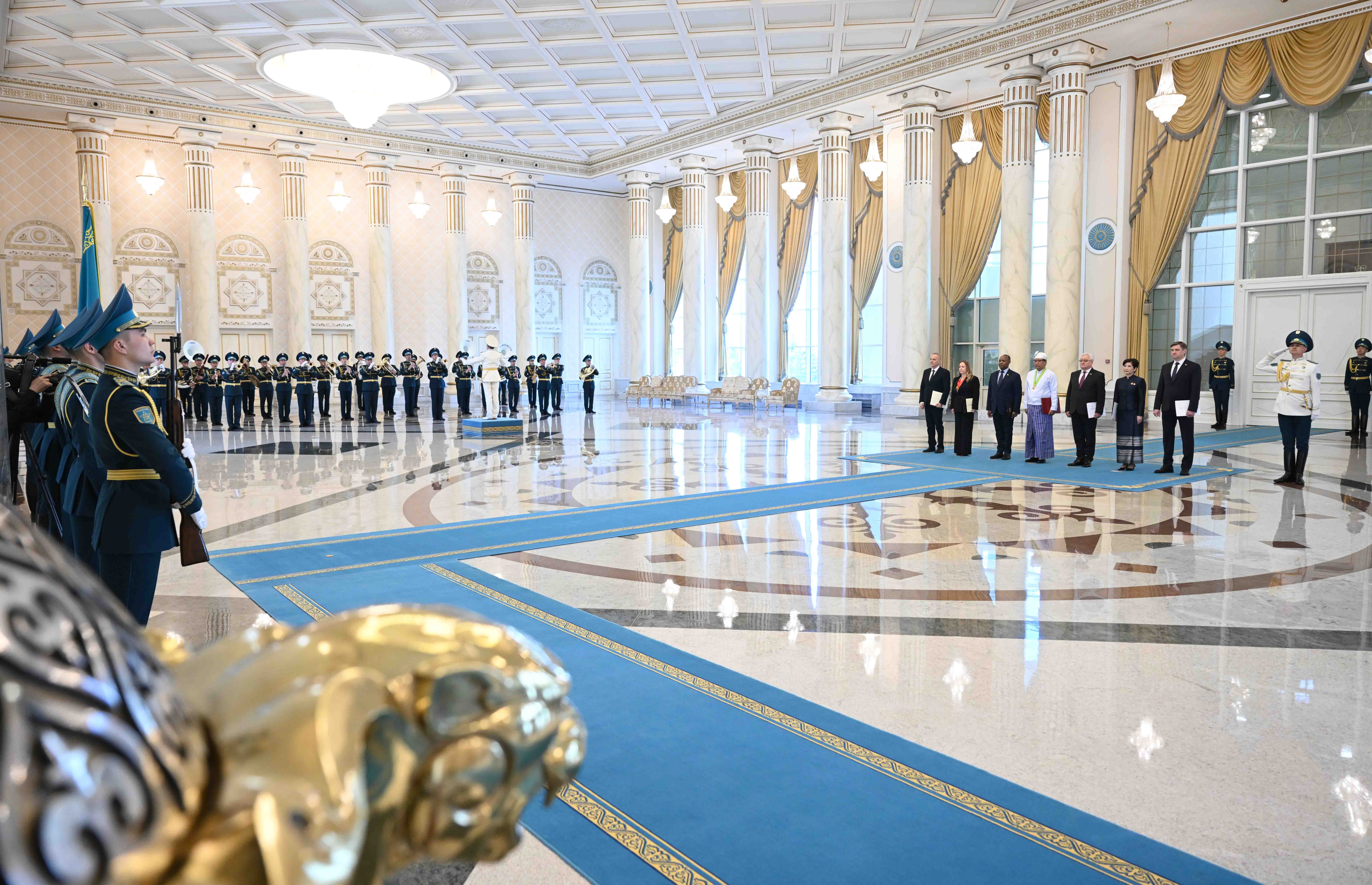 «Ақорда» резиденциясында жеті мемлекеттің төтенше және өкілетті елшілерінің Қазақстан Президентіне сенім грамоталарын табыстау рәсімі өтті. Сенім грамоталарын Беларусь Республикасының елшісі Алексей Богданов, Таиланд Корольдігінің елшісі Пияпин Нийомреркс, Молдова Республикасының елшісі Штефан Горда, Мьянма Одағы Республикасының елшісі Тит Линн Оун, Кения Республикасының елшісі Питер Мутуку Матуки, Албания Республикасының елшісі Блерта Кадзадеш, Италия Республикасының елшісі Антонелло де Риу тапсырды. Мемлекет басшысы дипломаттарды Қазақстандағы миссияларының басталуымен құттықтап, еліміз олардың қызметіне жан-жақты қолдау көрсететінін жеткізді. Қасым-Жомарт Тоқаев Қазақстанның бейбіт әрі көпвекторлы сыртқы саясат ұстанатынын айтты. Президенттің айтуынша, халықаралық қатынастарда диалог пен ықпалдастық қағидаттары басшылыққа алынуға тиіс және БҰҰ Жарғысын қатаң сақтау айрықша маңызды. '