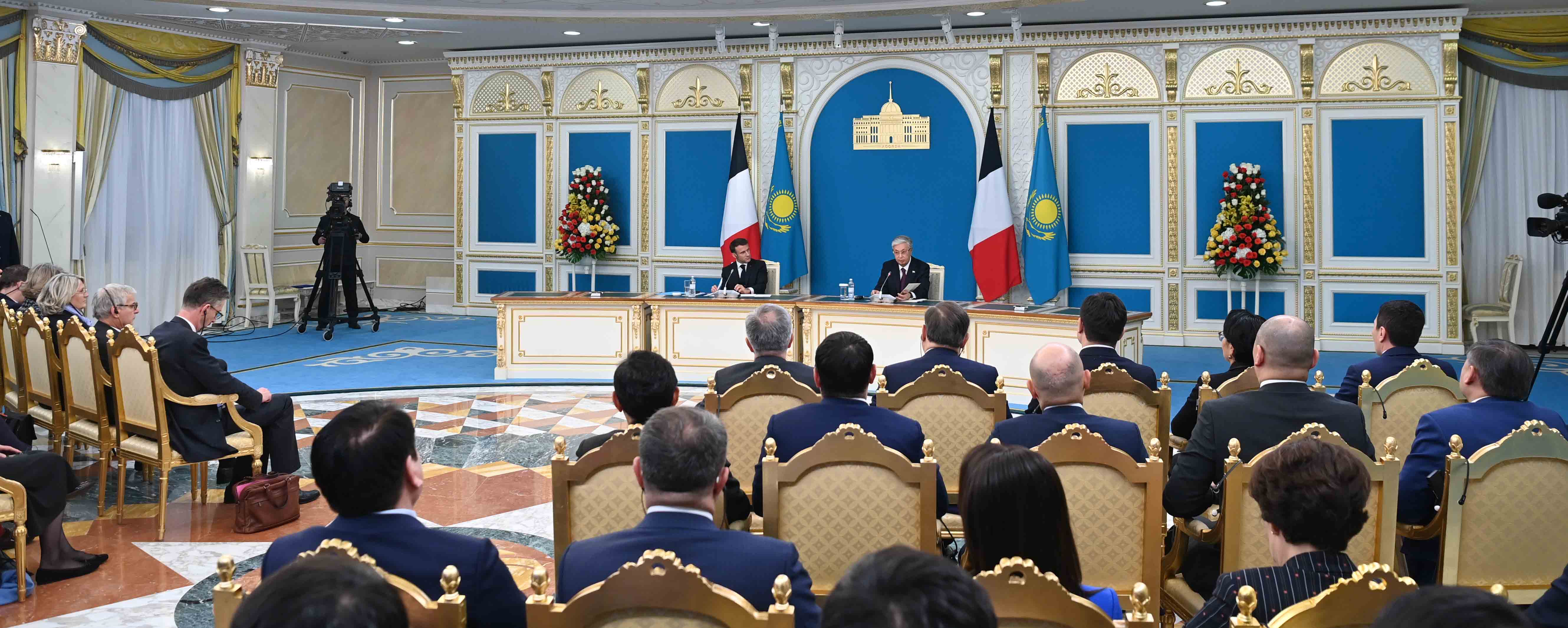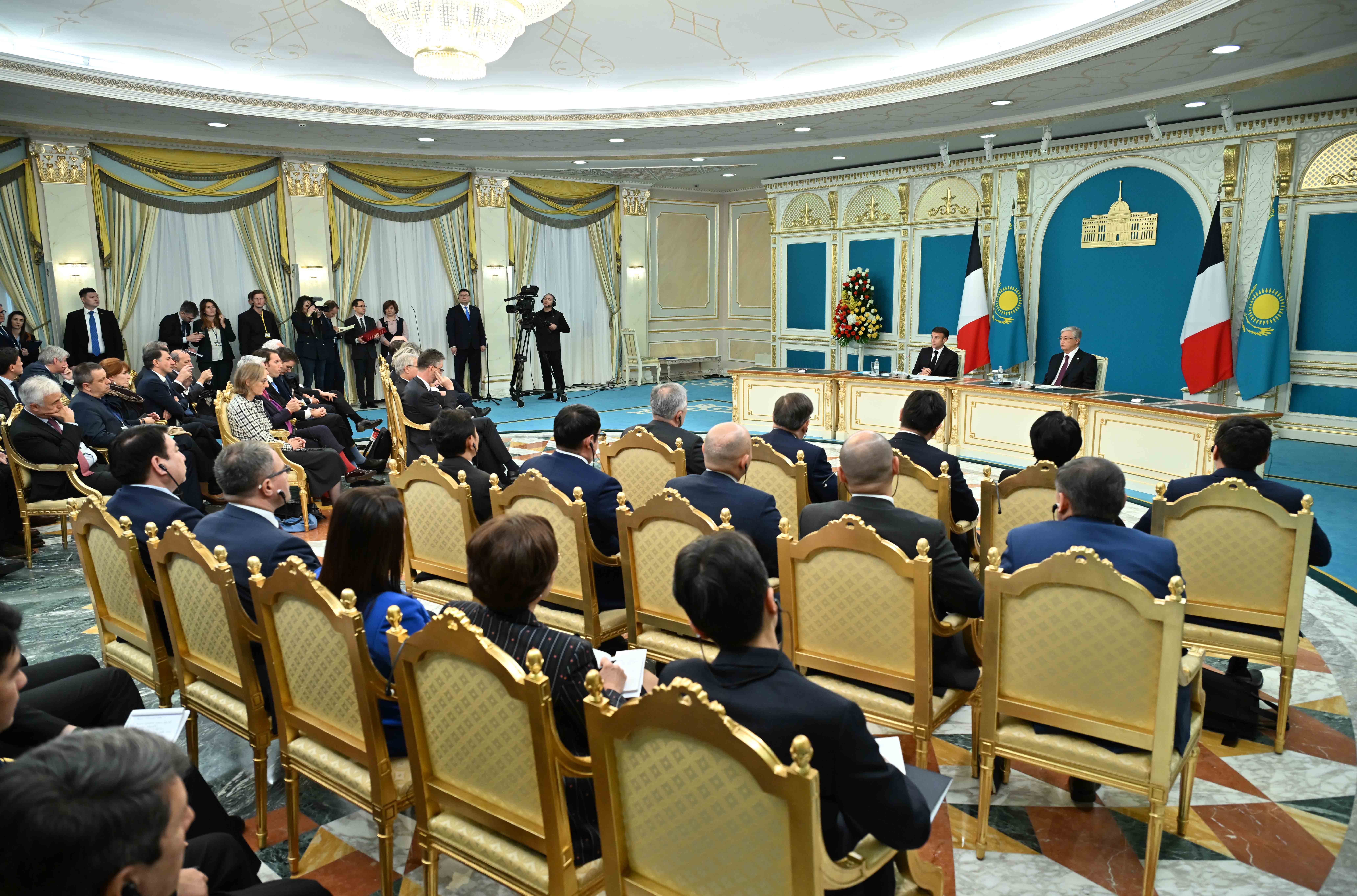 Екіжақты келіссөздерден кейін Мемлекет басшысы Қасым-Жомарт Тоқаев пен Франция Президенті Эмманюэль Макрон бұқаралық ақпарат құралдарының өкілдері үшін бірлескен мәлімдеме жасады.