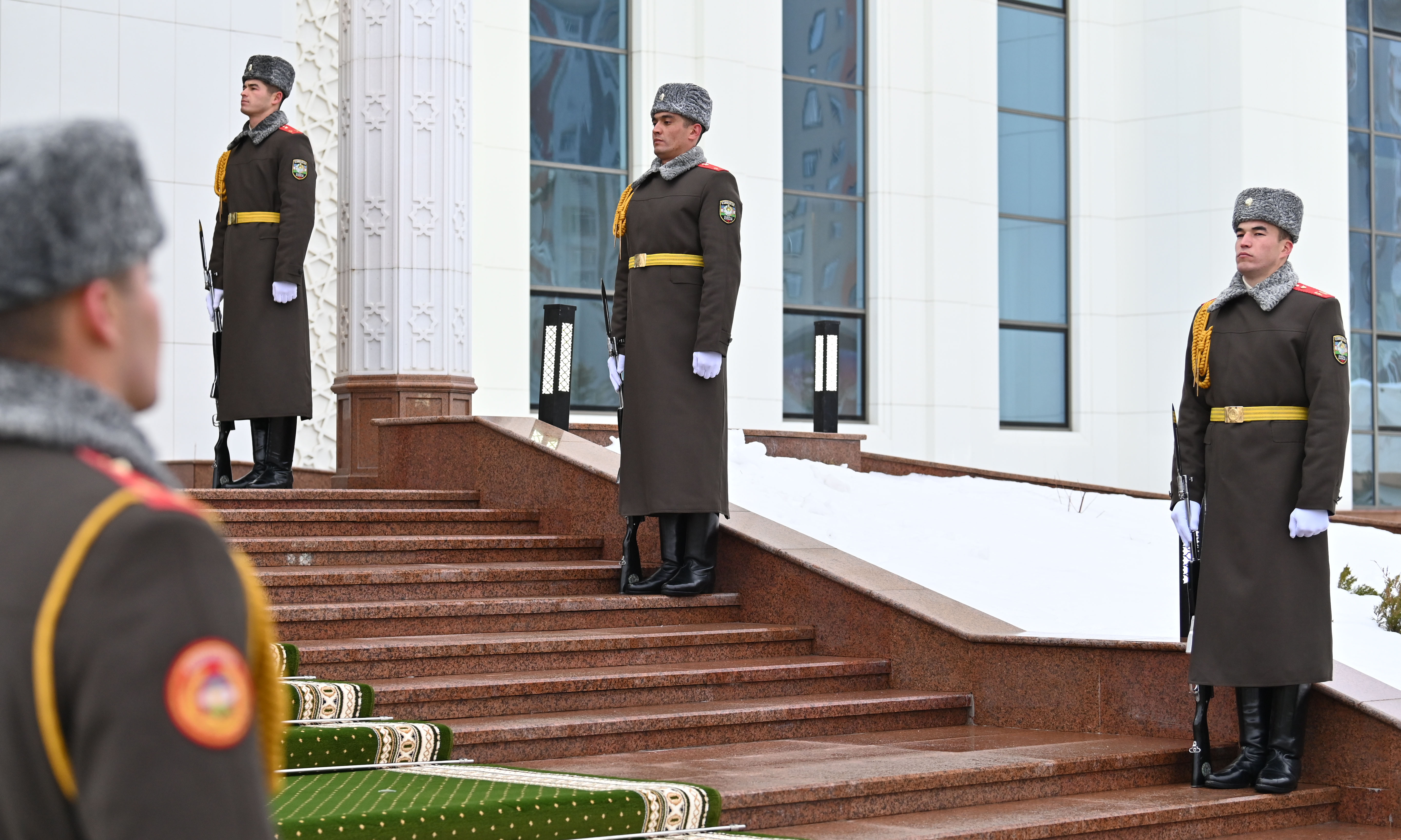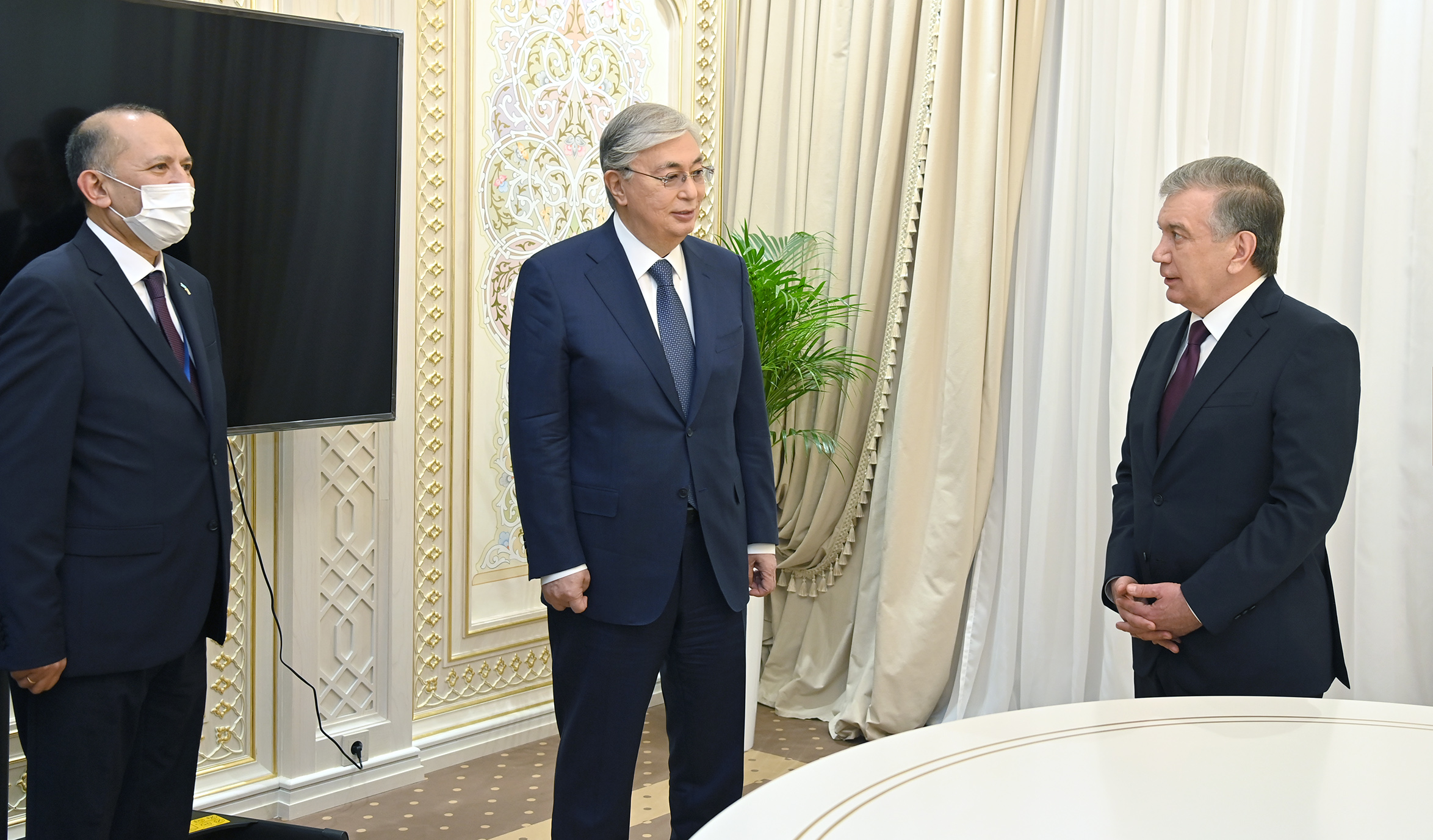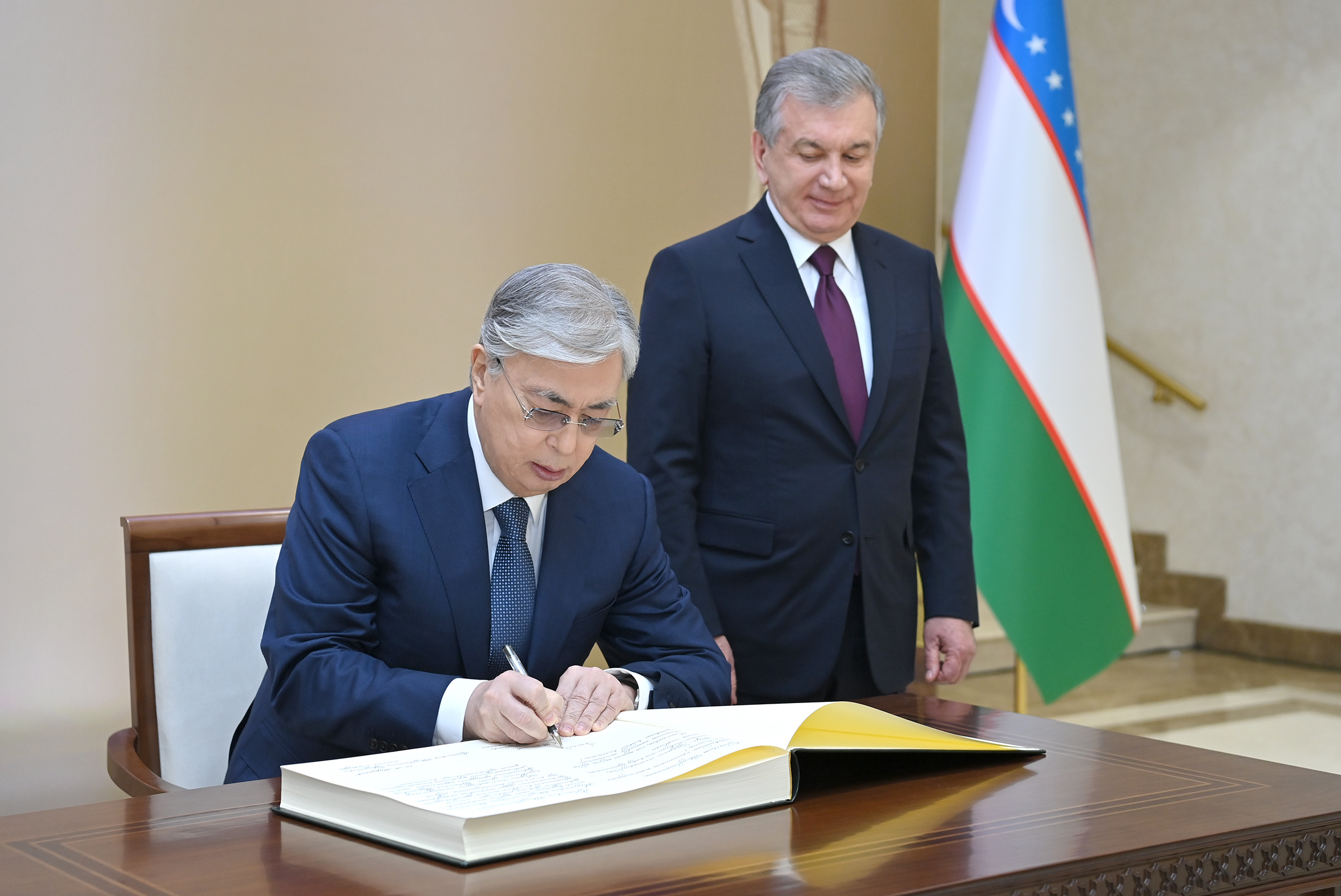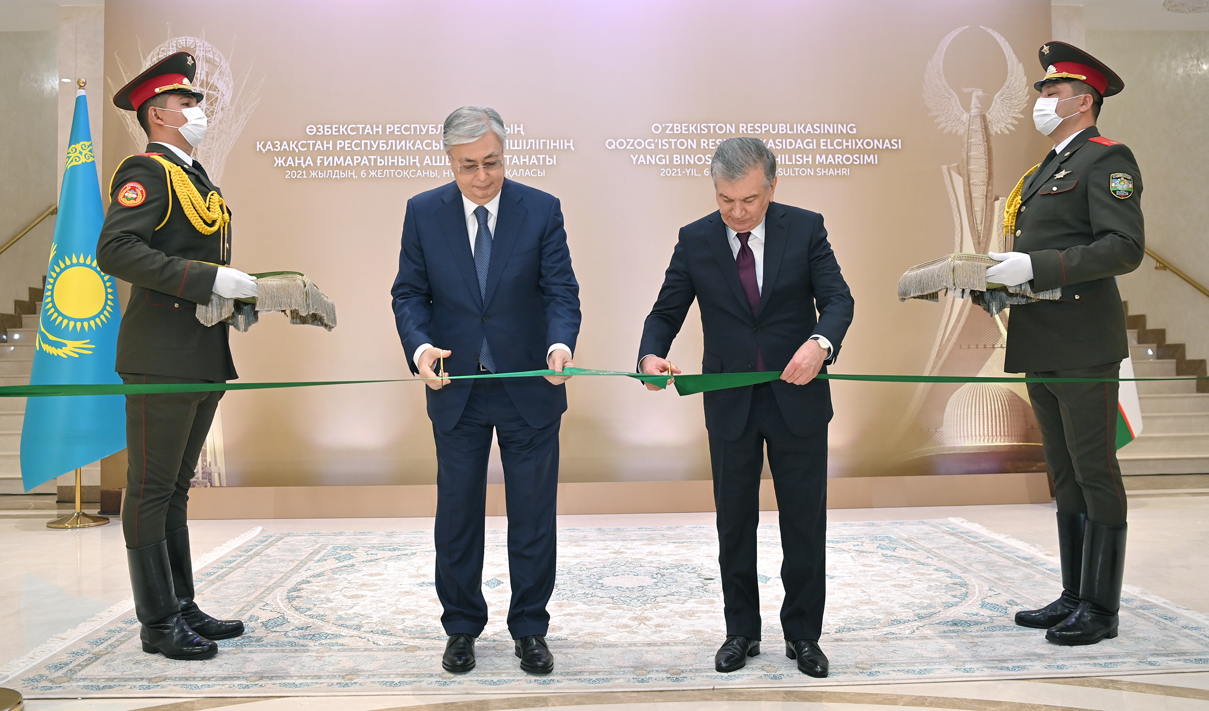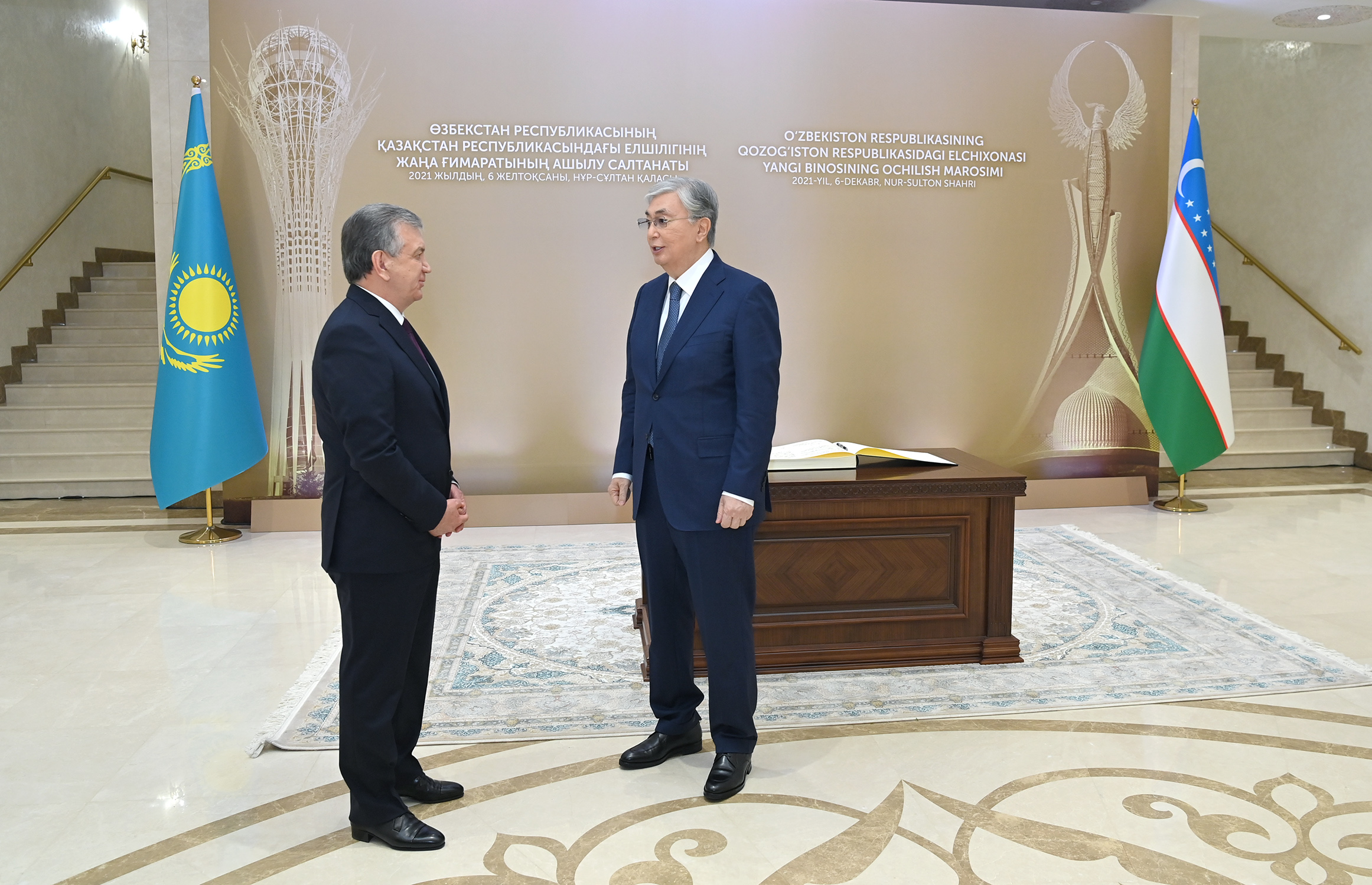 Мемлекеттер басшылары салтанатты шарада лента қиған соң, Президент оркестрі екі елдің мемлекеттік әнұрандарын орындады. Бұдан кейін Қасым-Жомарт Тоқаев пен Шавкат Мирзиёев елшіліктің жаңа ғимаратын аралап шықты.