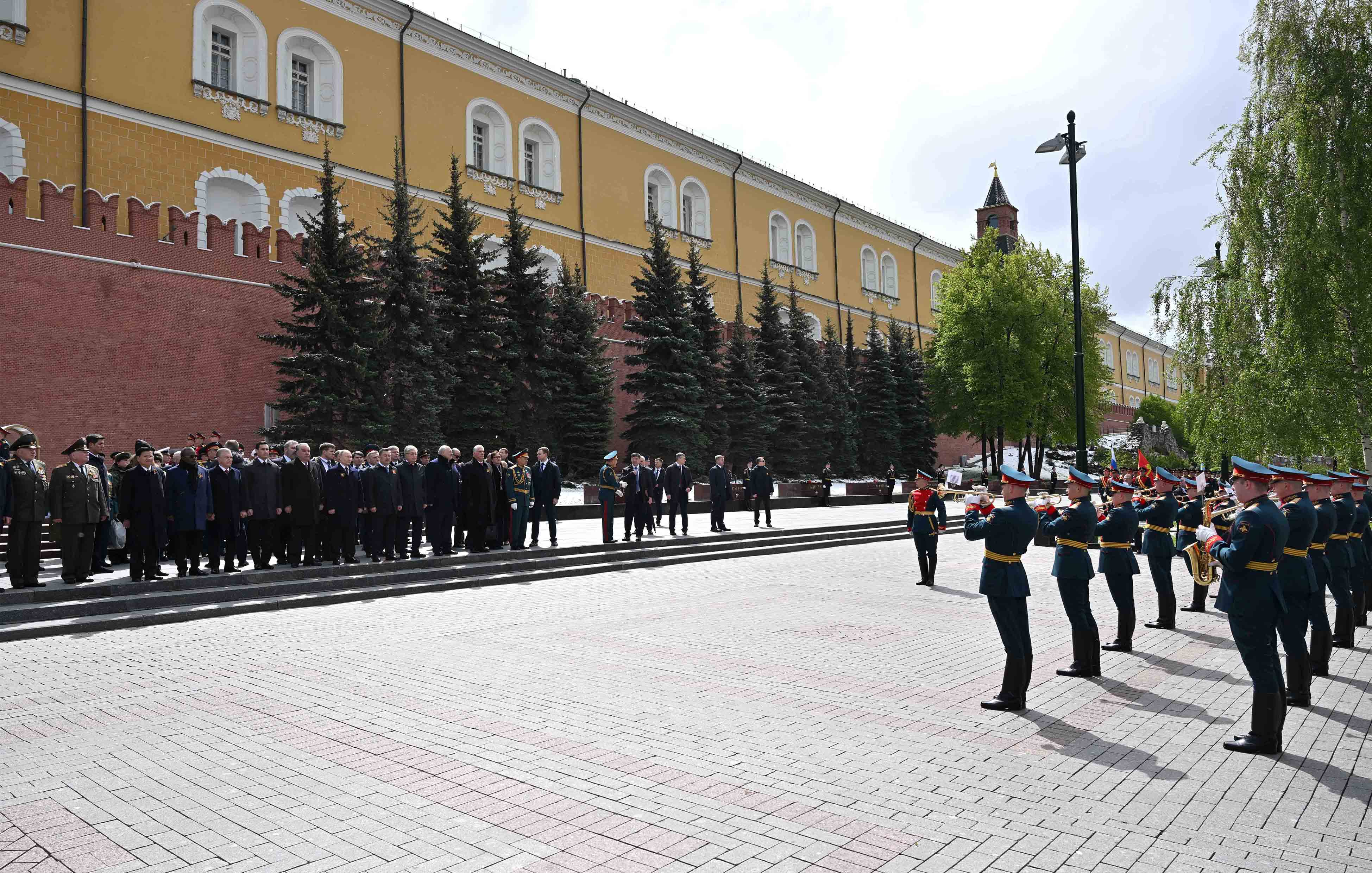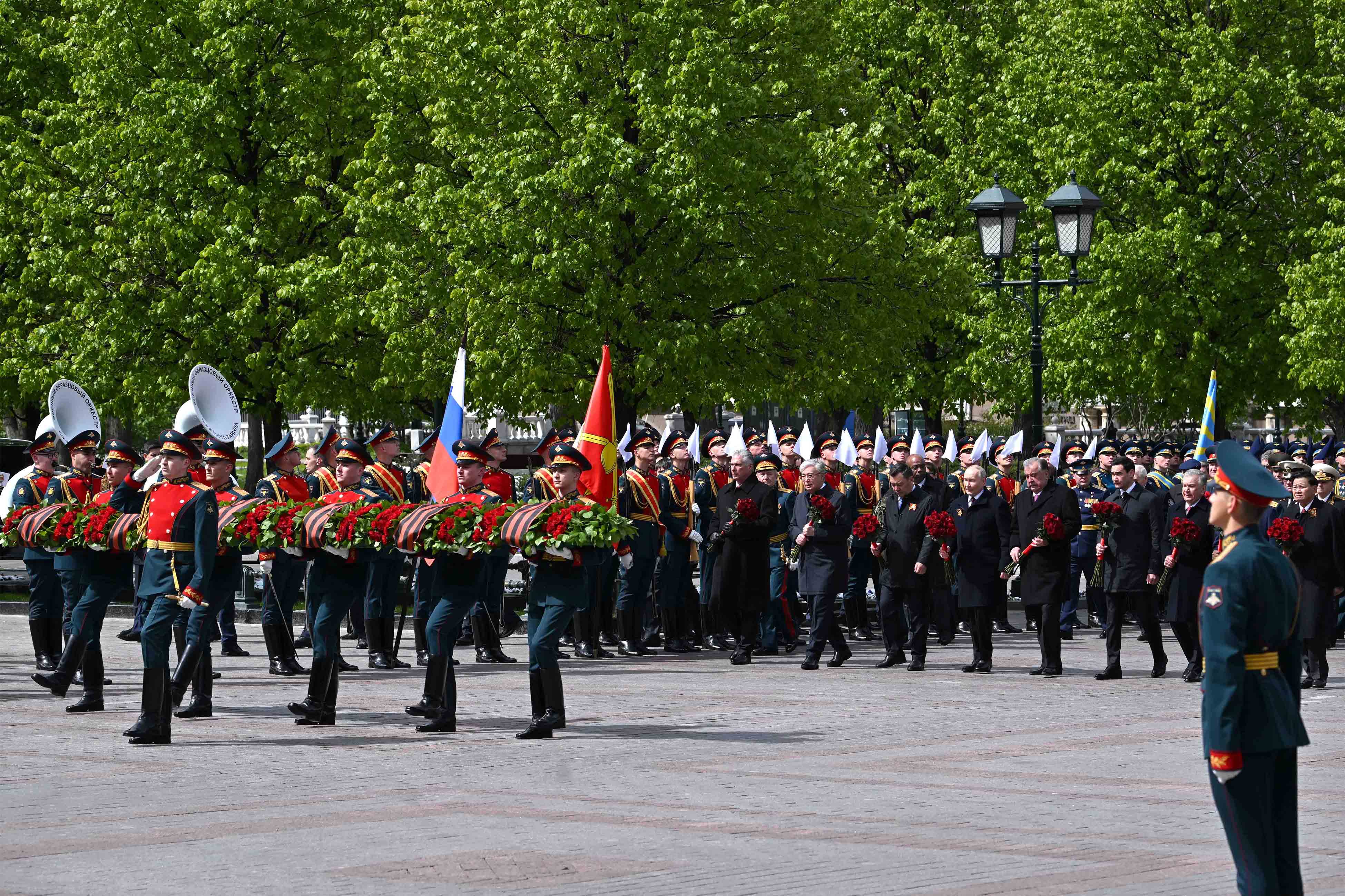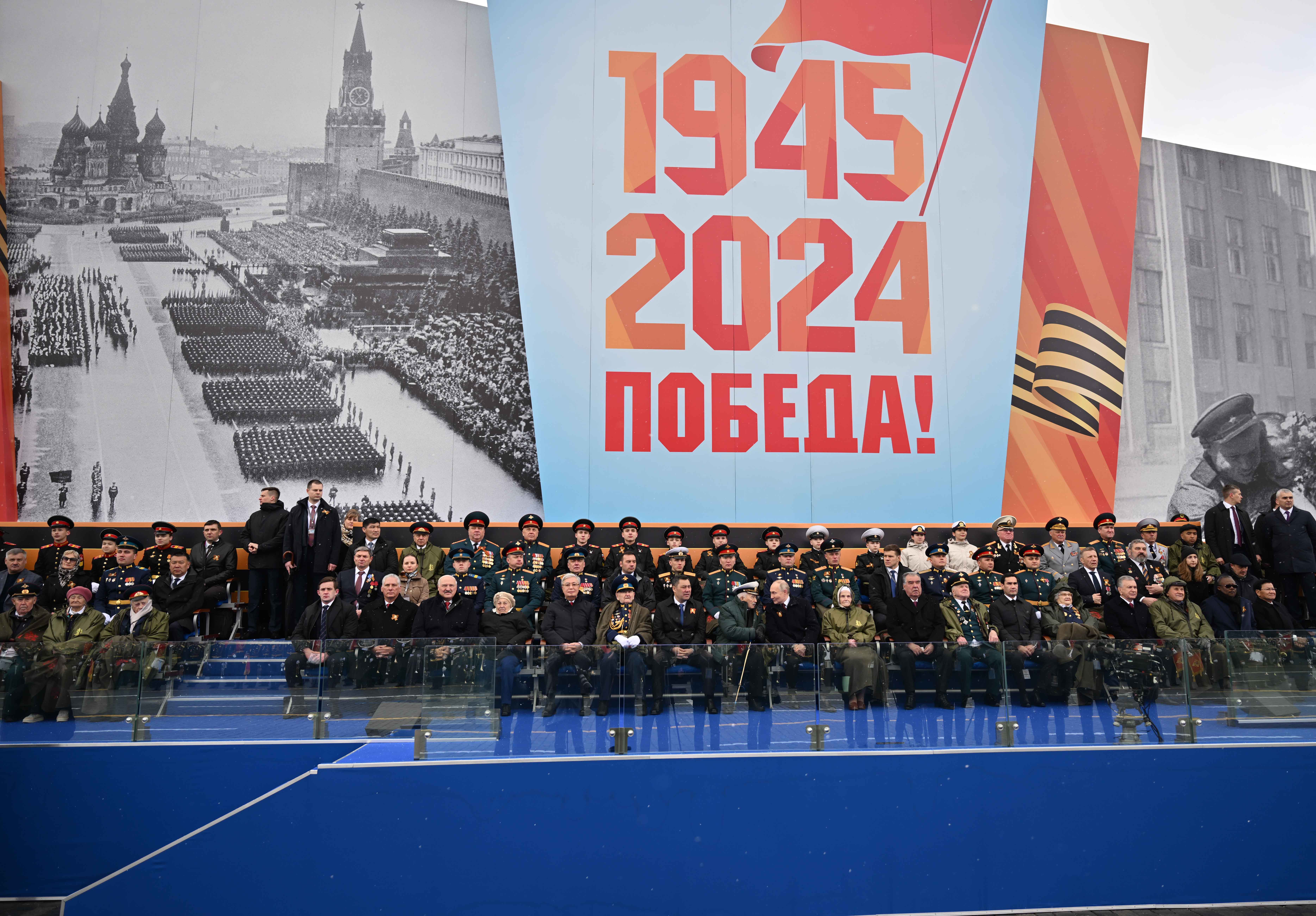 Парадты Қасым-Жомарт Тоқаевпен және Ресей Президенті Владимир Путинмен қатар Беларусь Президенті Александр Лукашенко, Қырғызстан Президенті Садыр Жапаров, Тәжікстан Президенті Эмомали Рахмон, Түрікменстан Президенті Сердар Бердімұхамедов, Өзбекстан Президенті Шавкат Мирзиёев, Куба Президенті Мигель Марио Диас-Канель Бермудес, Лаос Президенті Тхонглун Сисулит, Гвинея-Бисау Президенті Умару Сисоку Эмбало тамашалады.