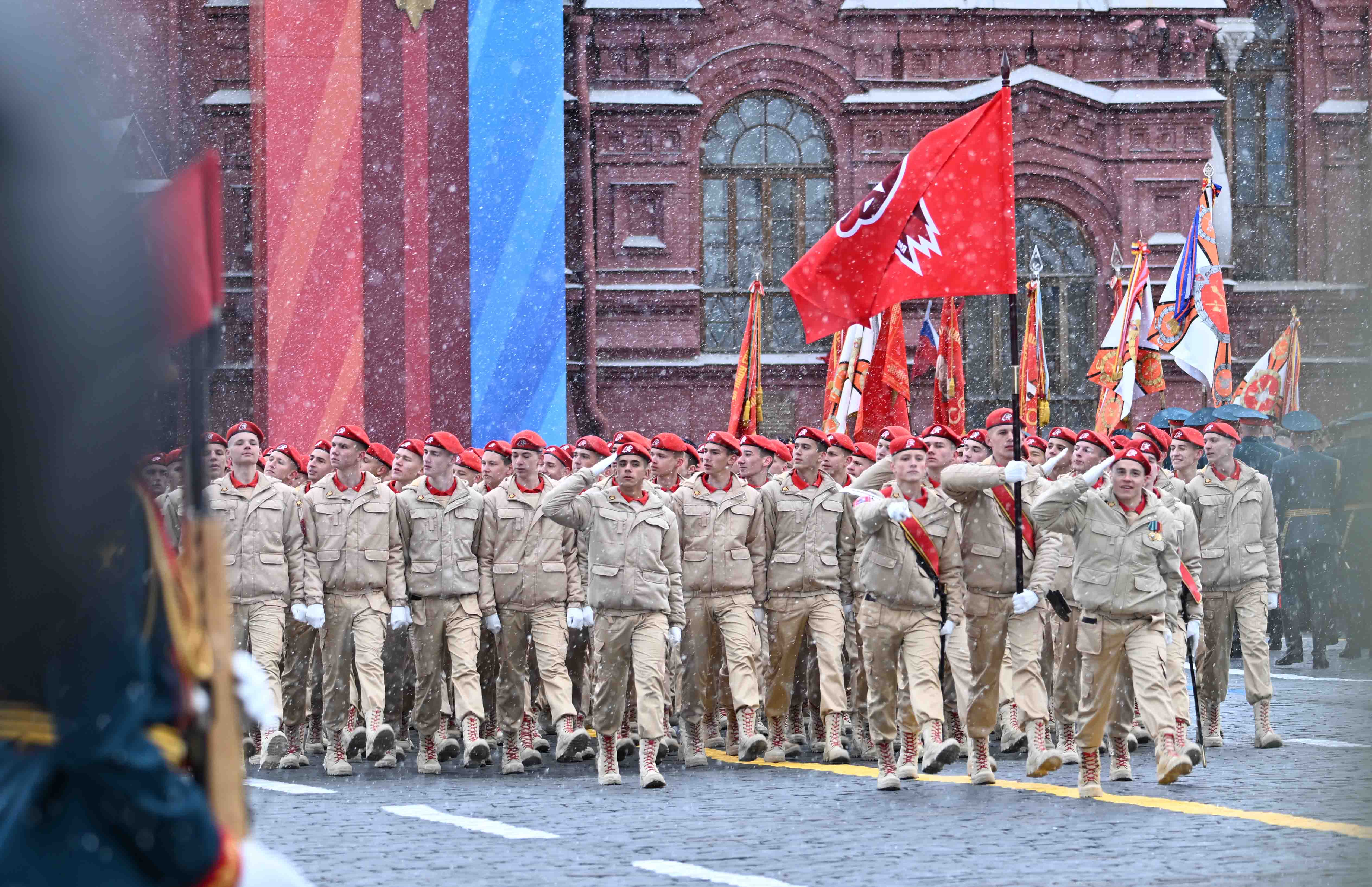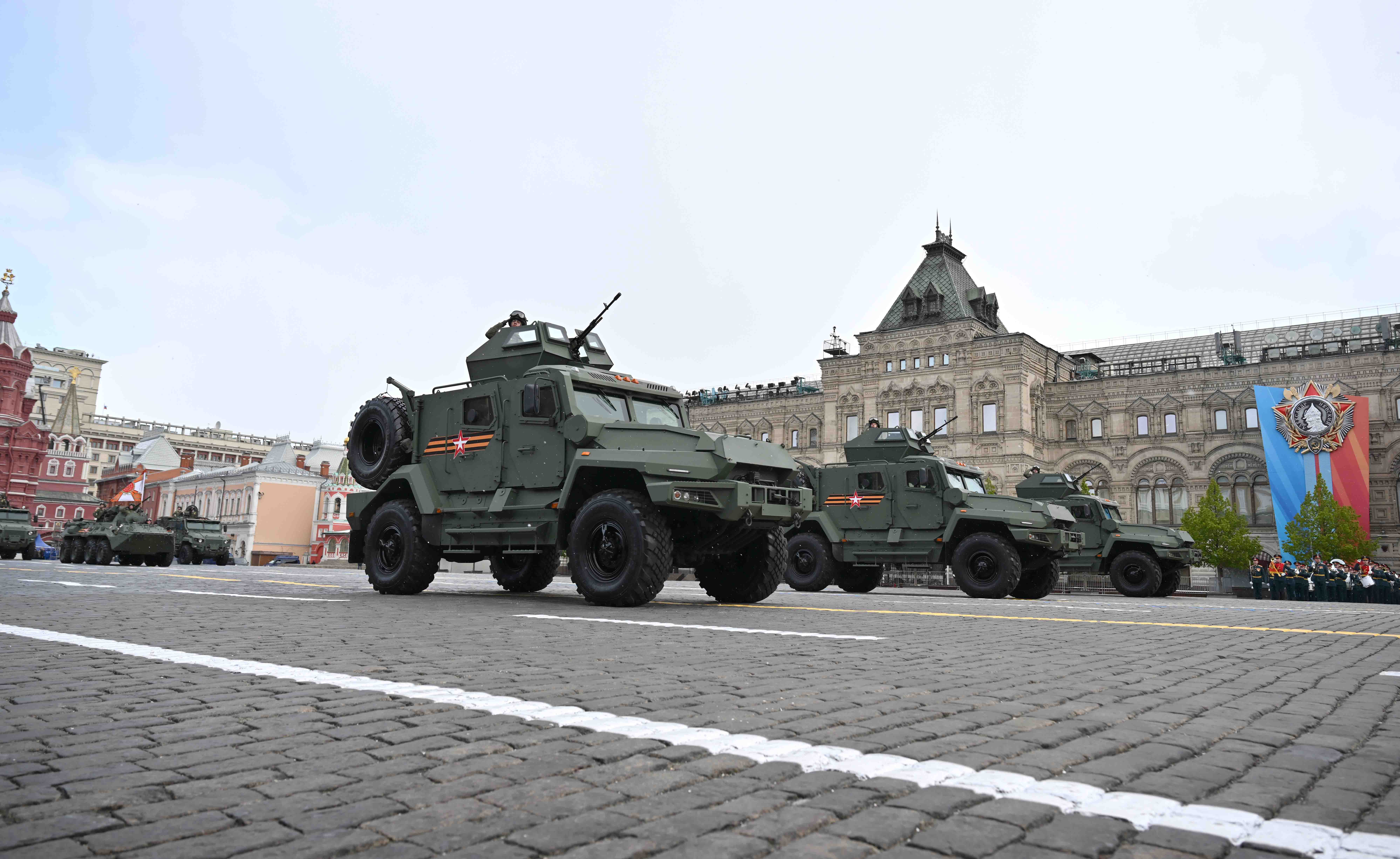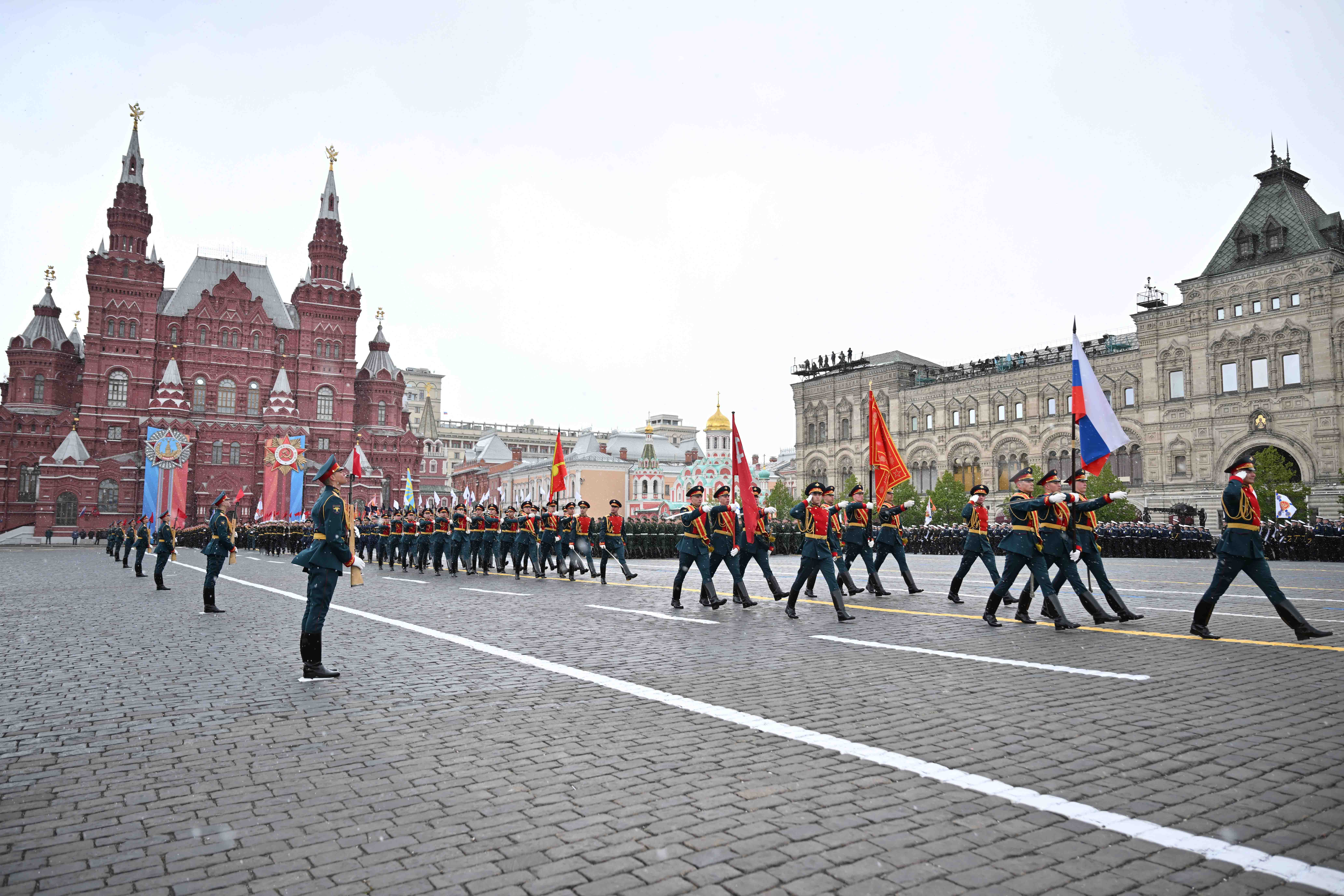 Парадты Қасым-Жомарт Тоқаевпен және Ресей Президенті Владимир Путинмен қатар Беларусь Президенті Александр Лукашенко, Қырғызстан Президенті Садыр Жапаров, Тәжікстан Президенті Эмомали Рахмон, Түрікменстан Президенті Сердар Бердімұхамедов, Өзбекстан Президенті Шавкат Мирзиёев, Куба Президенті Мигель Марио Диас-Канель Бермудес, Лаос Президенті Тхонглун Сисулит, Гвинея-Бисау Президенті Умару Сисоку Эмбало тамашалады.