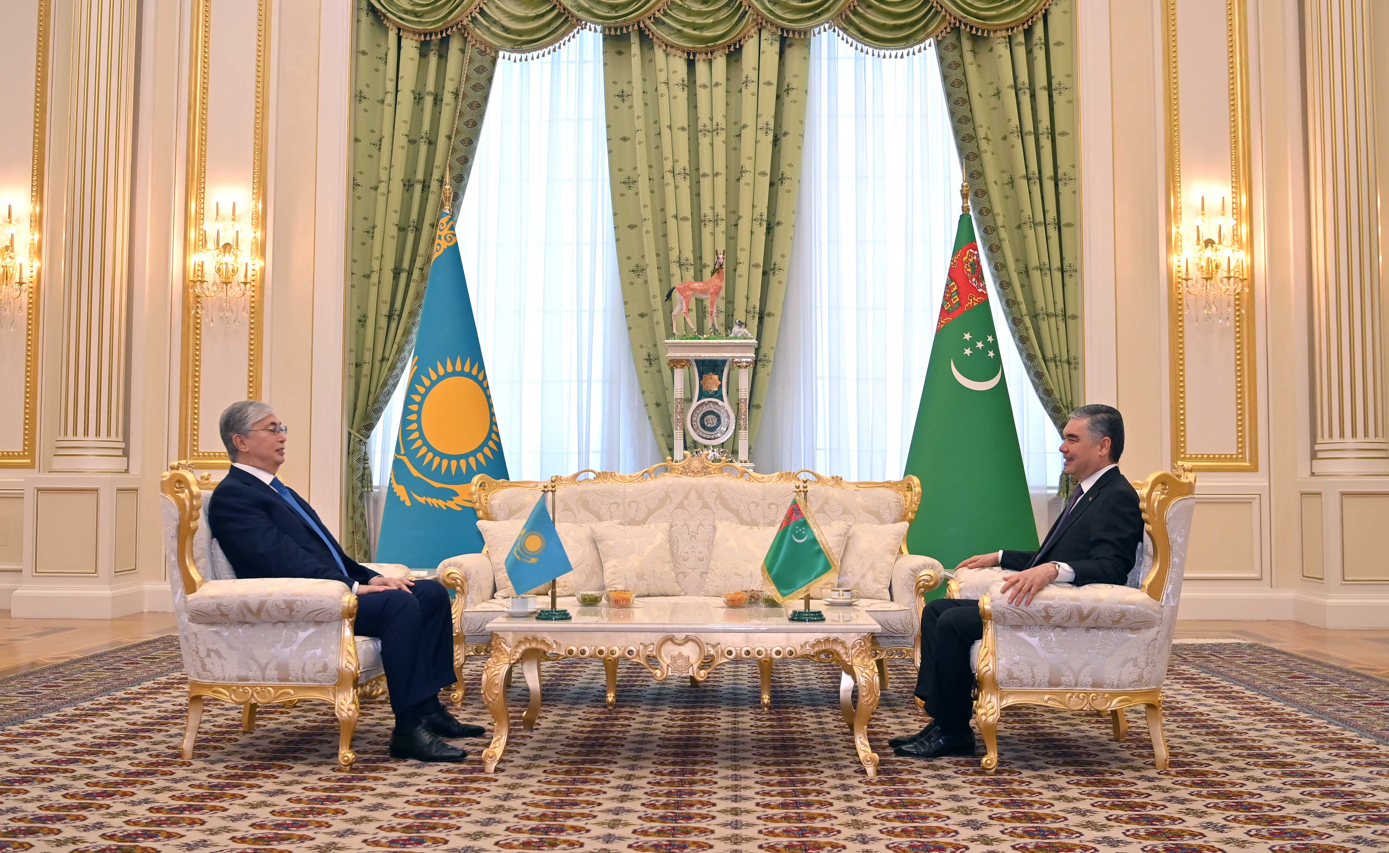 Қасым-Жомарт Тоқаев Ашхабадқа мемлекеттік сапары барысында Түрікменстан Президенті Гурбангулы Бердімұхамедовпен келіссөз жүргізді. Келіссөздерге дейін Тәуелсіздік алаңында салтанатты түрде ресми қарсы алу шарасы өтті. Құрмет Қарауылының бастығы екі ел басшыларына рапорт беріп, Қазақстан мен Түрікменстанның әнұрандары шырқалғаннан кейін Қасым-Жомарт Тоқаев пен Гурбангулы Бердімұхамедов бір-біріне ресми делегациялардың құрамын таныстырды.