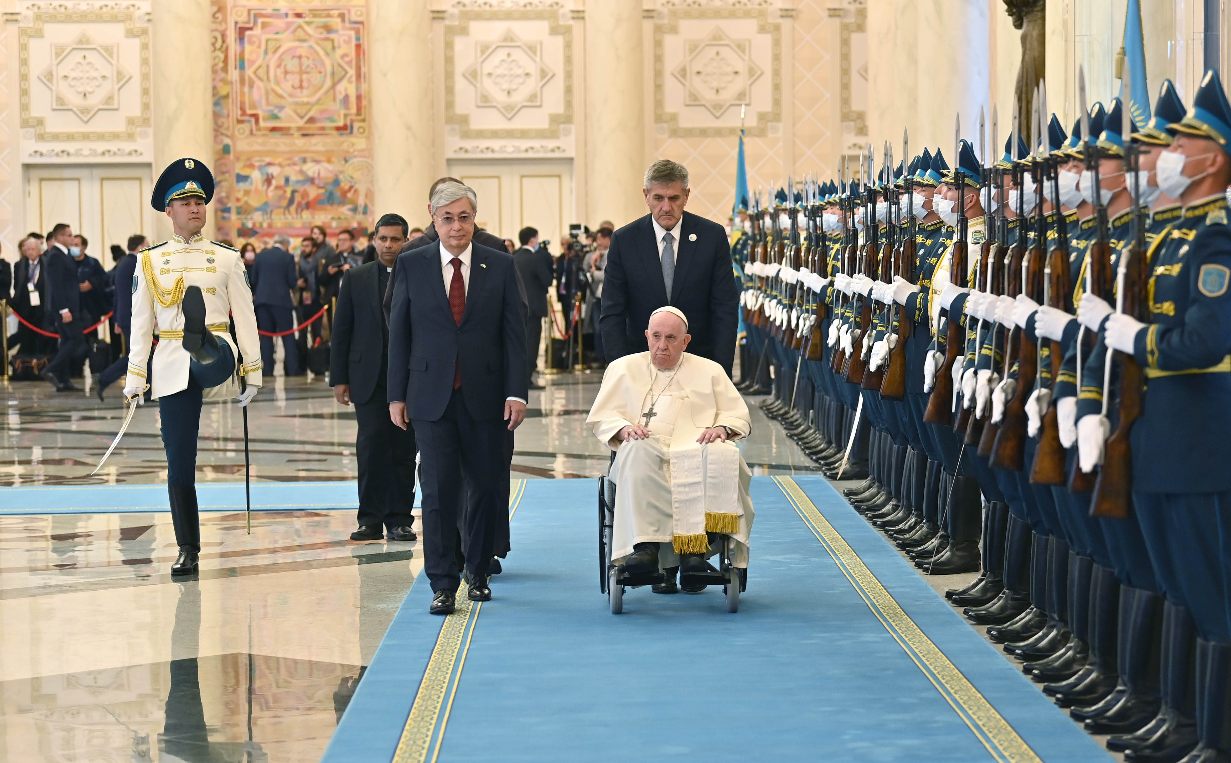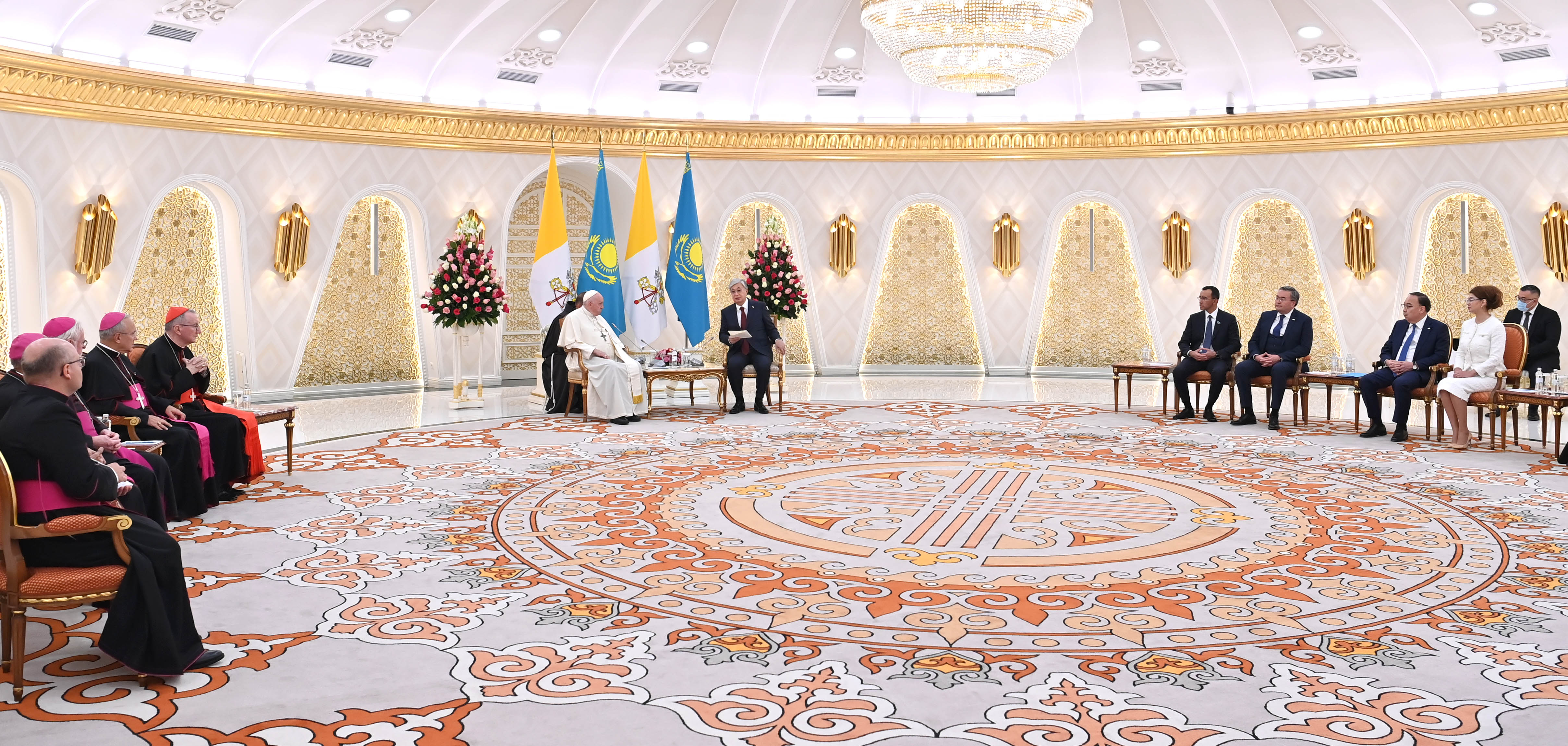 Кездесу алдында Понтификті Президент сарайында ресми қарсы алу рәсімі болды. Құрмет қарауылы ротасының бастығы рапорт бергеннен кейін екі елдің мемлекеттік әнұрандары шырқалды. Қасым-Жомарт Тоқаев пен Рим Папасы Құрмет қарауылының алдынан өтіп, екіжақты келіссөз жүргізу үшін «Шығыс» залына барды.