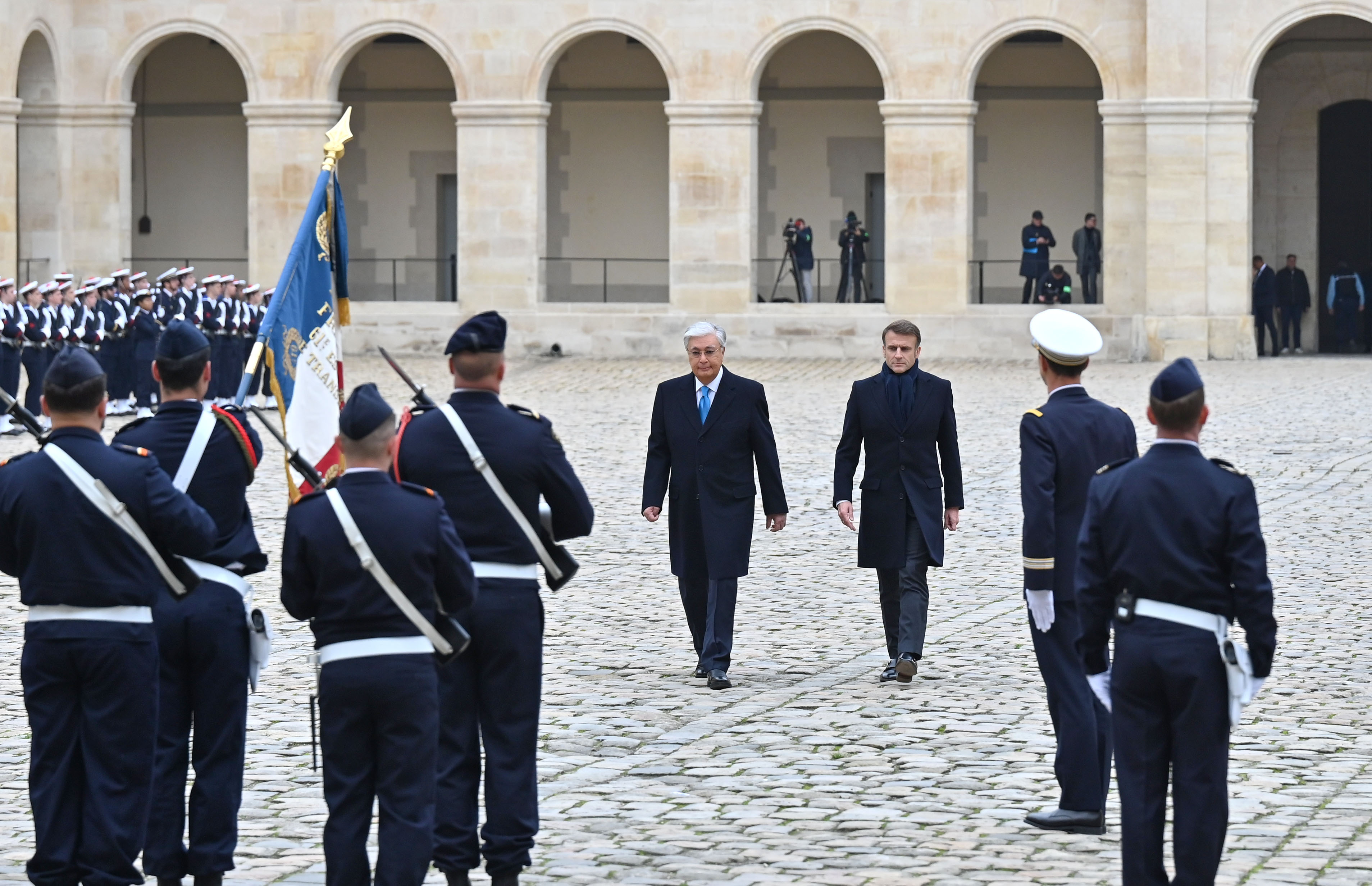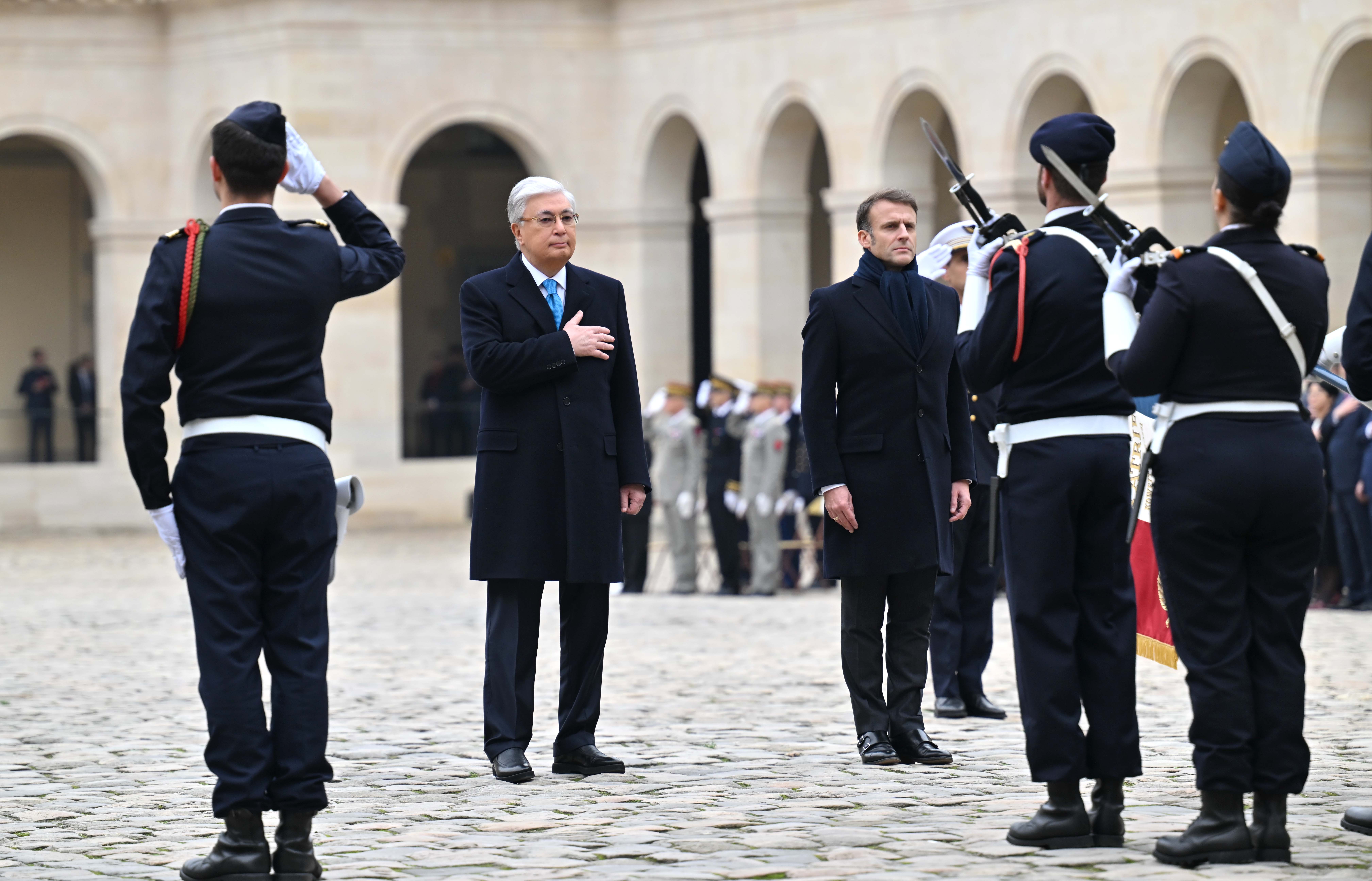 Франция, Париж қаласы Қасым-Жомарт Тоқаевтың Франция Республикасына мемлекеттік сапары салтанатты қарсы алу рәсімінен басталды. Мемлекет басшысын әскери оркестрдің сүйемелдеуімен Президент Эмманюэль Макрон қарсы алды. Қазақстан мен Францияның мемлекеттік әнұрандары шырқалды. Президенттер республикалық гвардия, әуе-ғарыш, құрлық және теңіз әскерлерінен жасақталған Құрмет қарауылының алдынан жүріп өтті. Бұдан кейін мемлекеттер басшылары Құрмет қарауылының салтанатты шеруін тамашалады. Қасым-Жомарт Тоқаев пен Эмманюэль Макрон бір-біріне ресми делегация мүшелерін және құрметті қонақтарды таныстырды.
