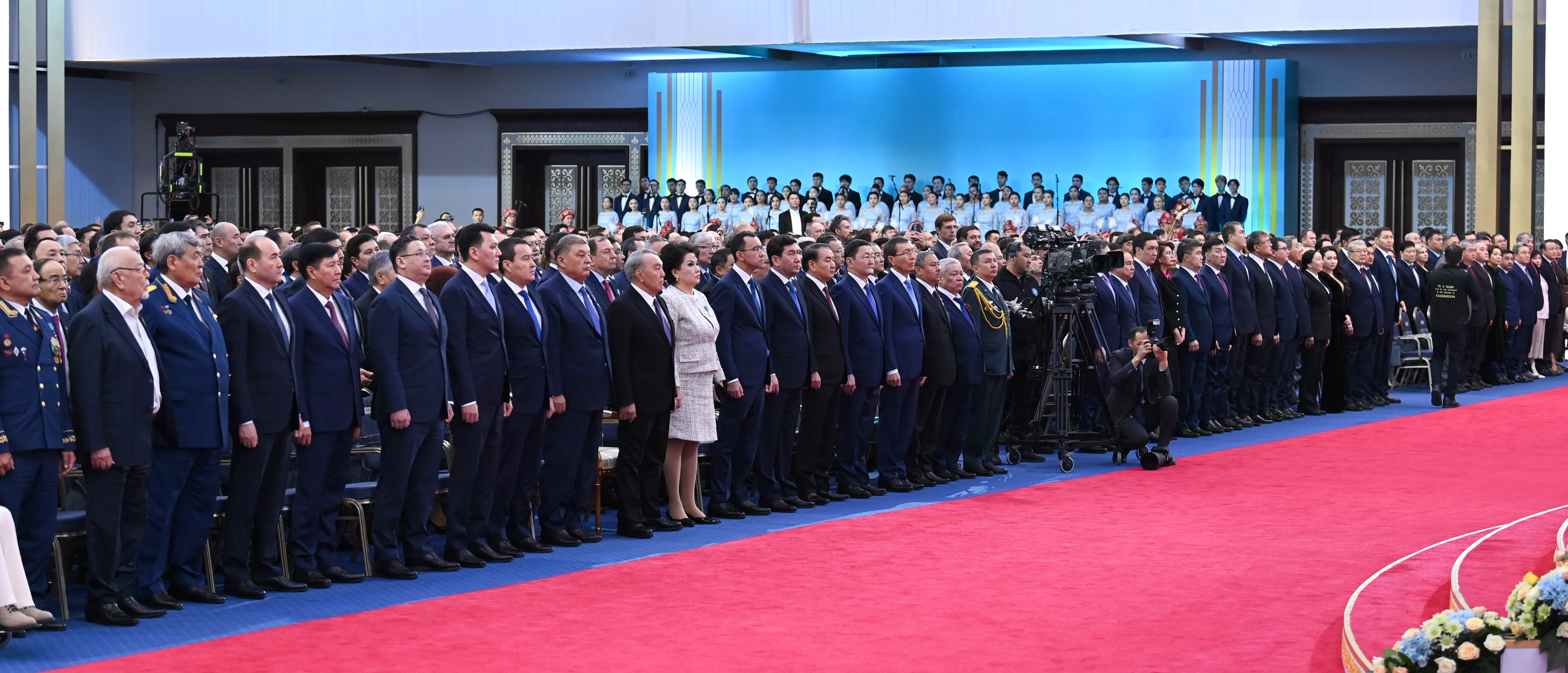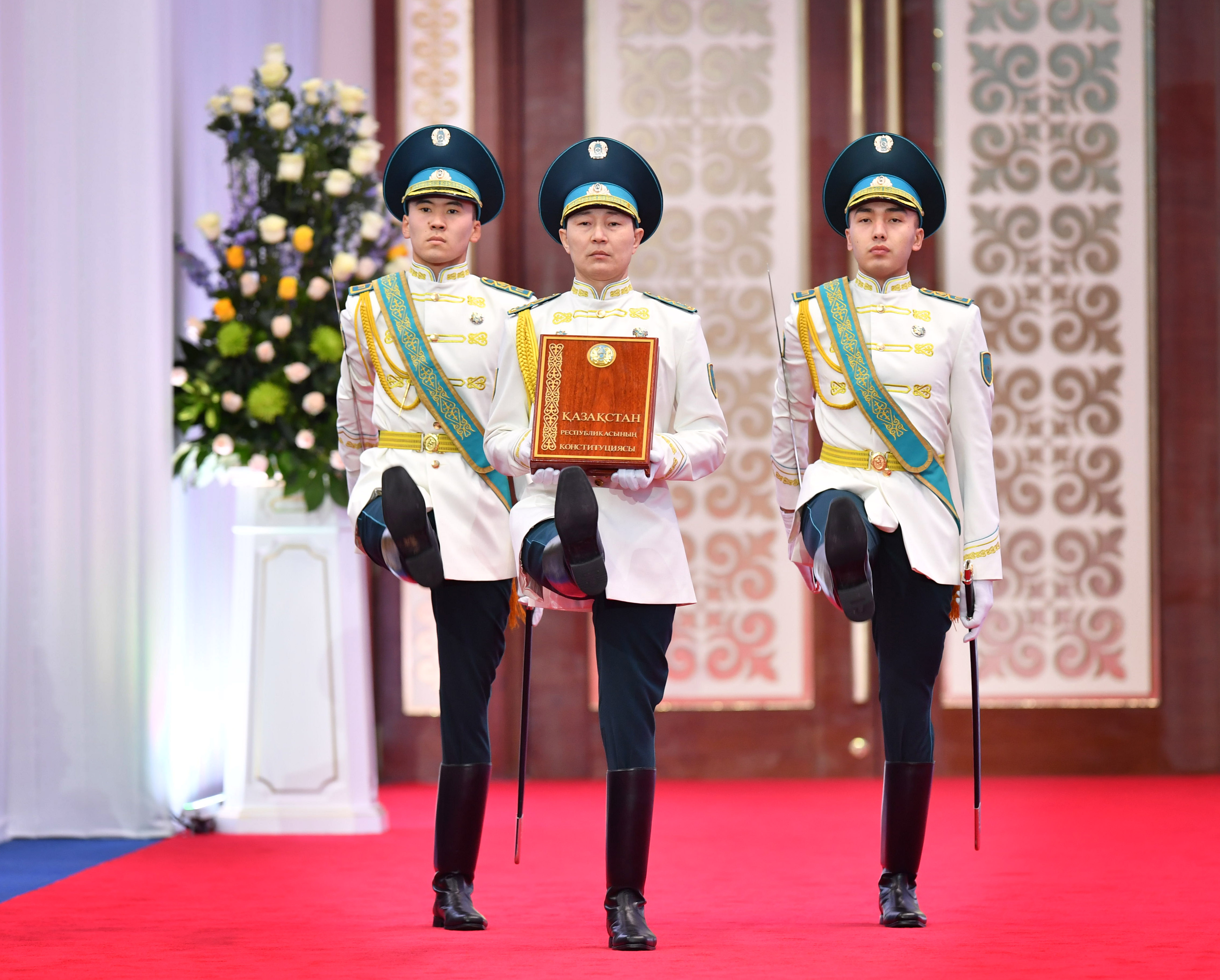 Мемлекеттік Ту мен Президент Байрағы, сондай-ақ Қазақстан Республикасының Конституциясы Тәуелсіздік сарайының Үлкен залына әкелінген соң Қазақстан Республикасының Президенті келіп, мінберге көтерілді.
