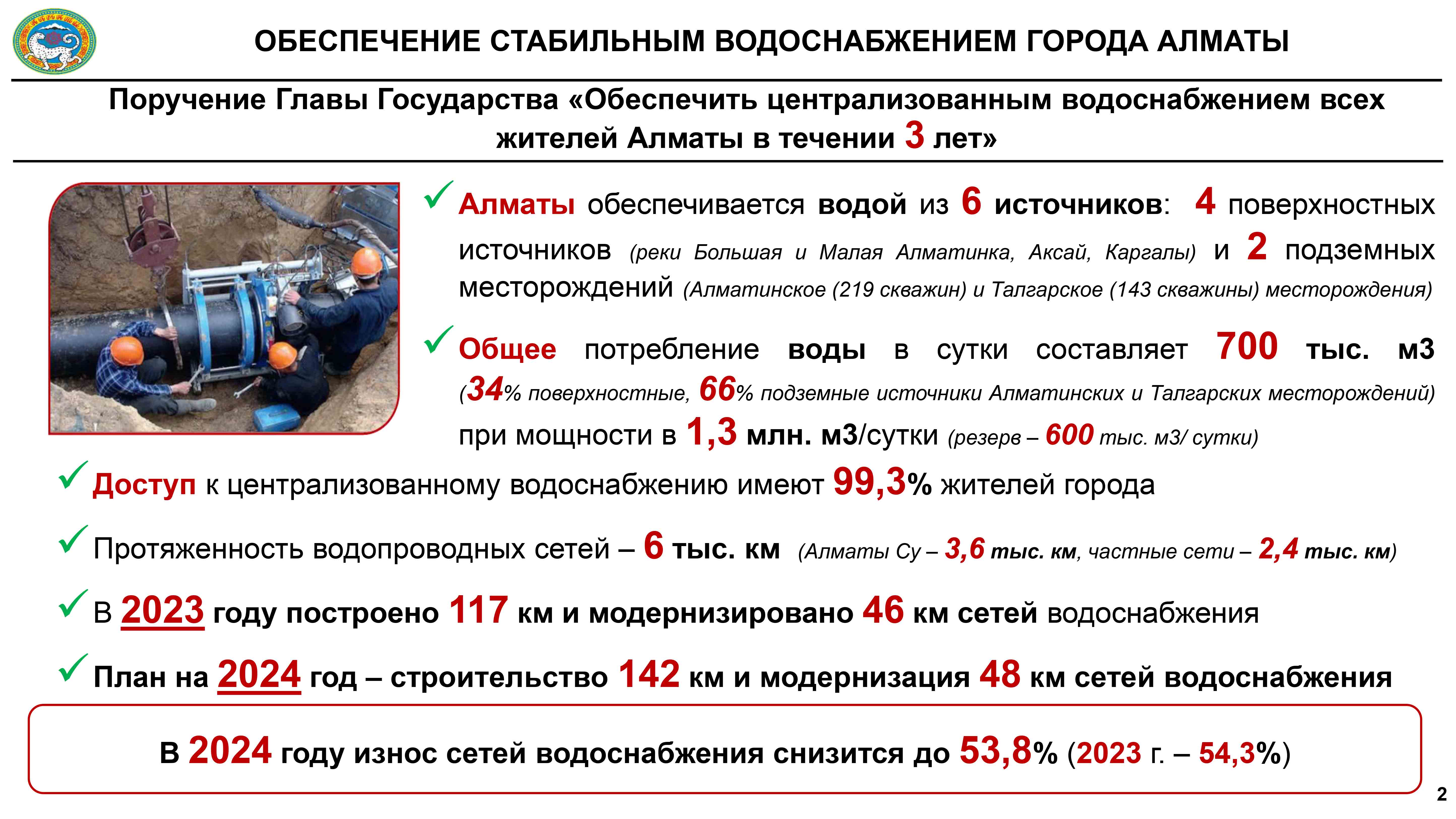 Президенттің тапсырмаларын орындау аясында қала әкімдігі былтыр жаңадан 117 шақырым сумен қамту желісін салып, 46 километр су құбырын жаңғырту жұмыстарын жүргізген. Аталған шаралар Алматы халқының 99,3 пайызын сумен қамтитын орталық желіге қосуға мүмкіндік берді. Биыл тағы 142 километр су құбырын тартып, 48 шақырым желіге жөндеу жұмыстарын жүргізу жоспарланып отыр. Бұл жыл соңына дейін тұрғындардың 99,6 пайызына су жеткізіп, желілердің тозу деңгейін 53,8 пайызға дейін төмендетуге септігін тигізеді.