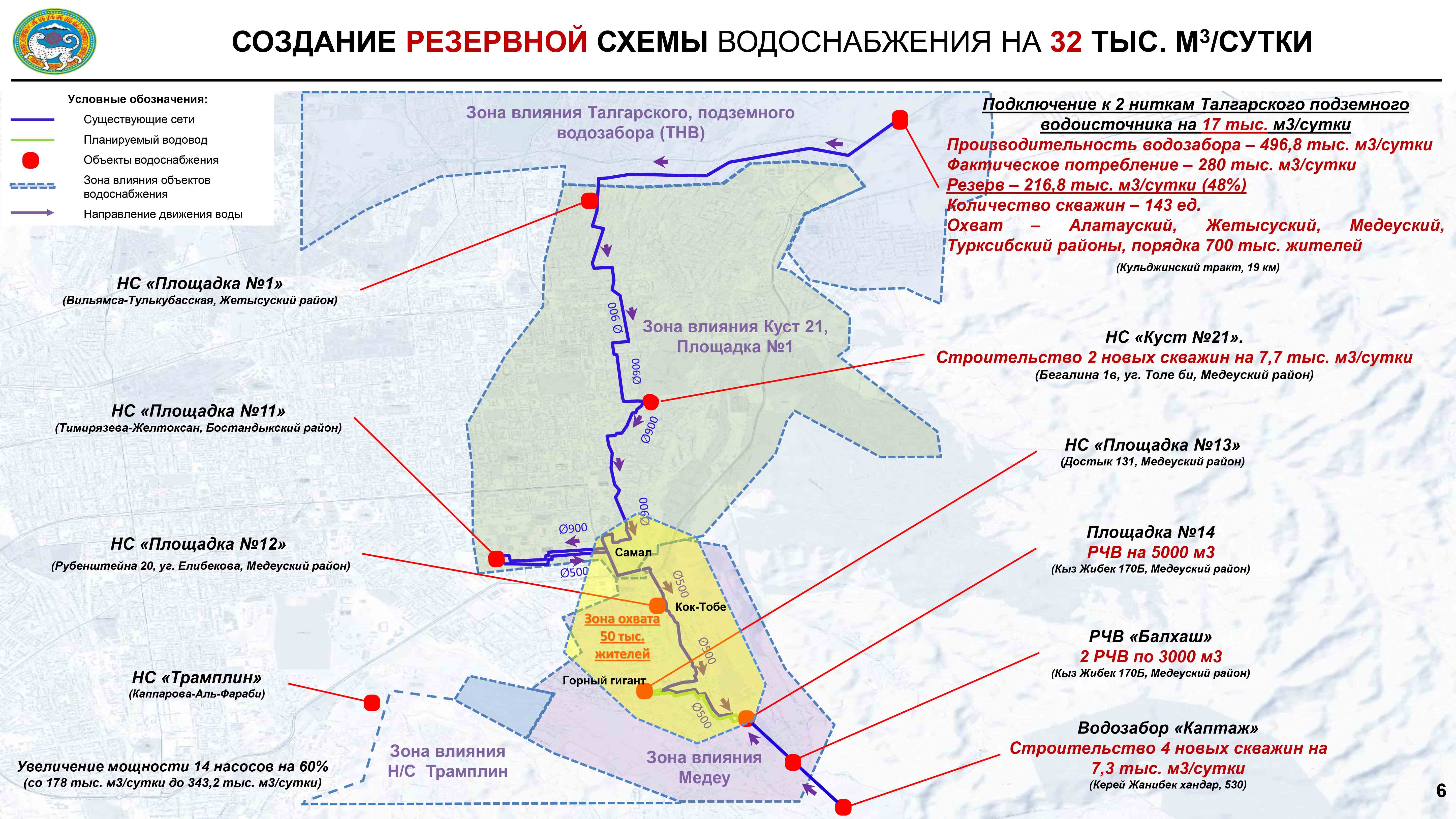 Сонымен қатар Қасым-Жомарт Тоқаевқа Медеу ауданының 50 мың тұрғынын сумен қамтудың қосалқы схемасын іске қосу жоспары жөнінде мәлімет берілді. Ал Алатау, Бостандық және Наурызбай аудандарының халқын сумен тұрақты әрі сапалы түрде қамтамасыз ету үшін екі тоған салынып жатыр және тағы екеуінің жобалау жұмыстары жүргізілуде.
